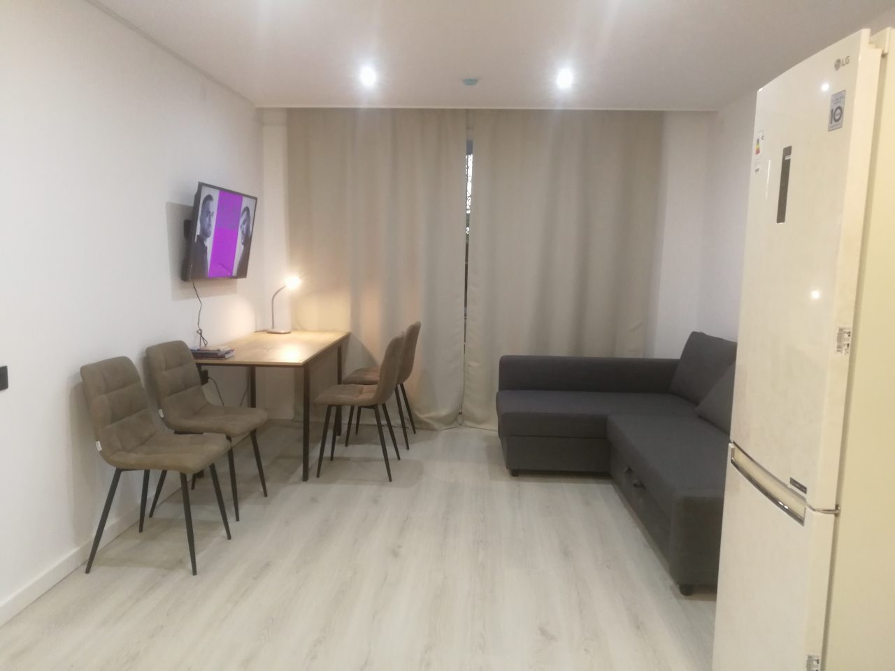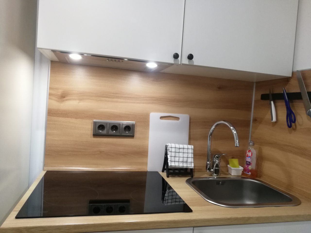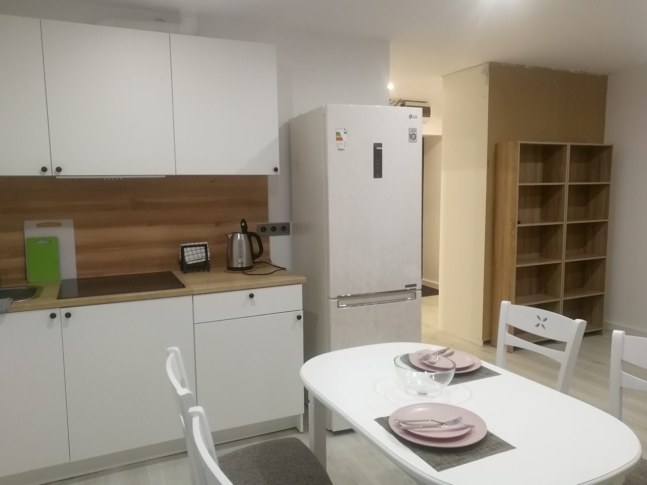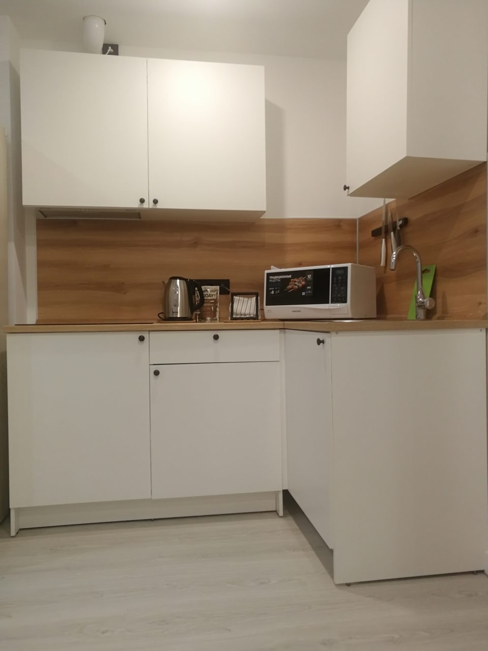 Кухонная зона оснащена гарнитуром, варочной панелью, вытяжкой, холодильником, чайником и микроволновой печью. Вкусно пообедать можно в ближайшем кафе.