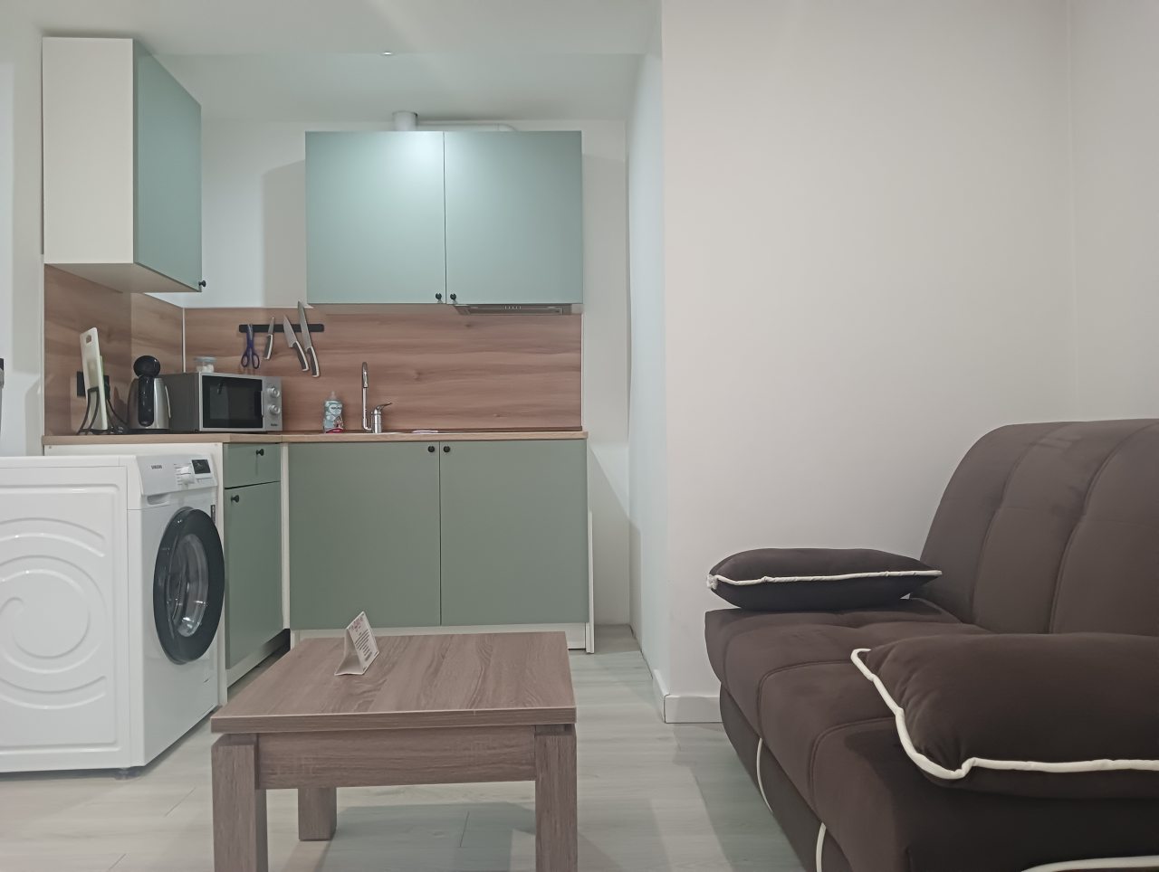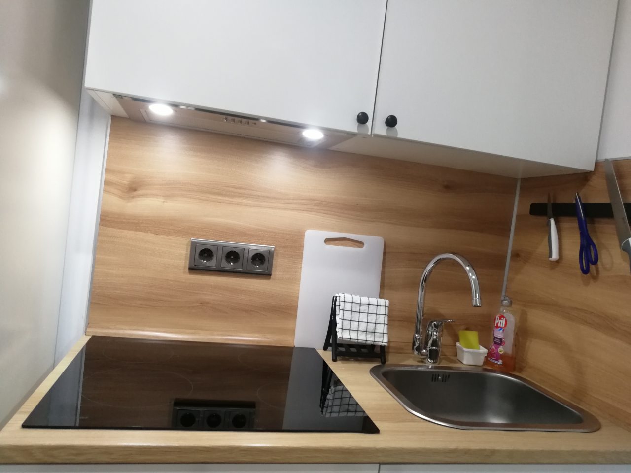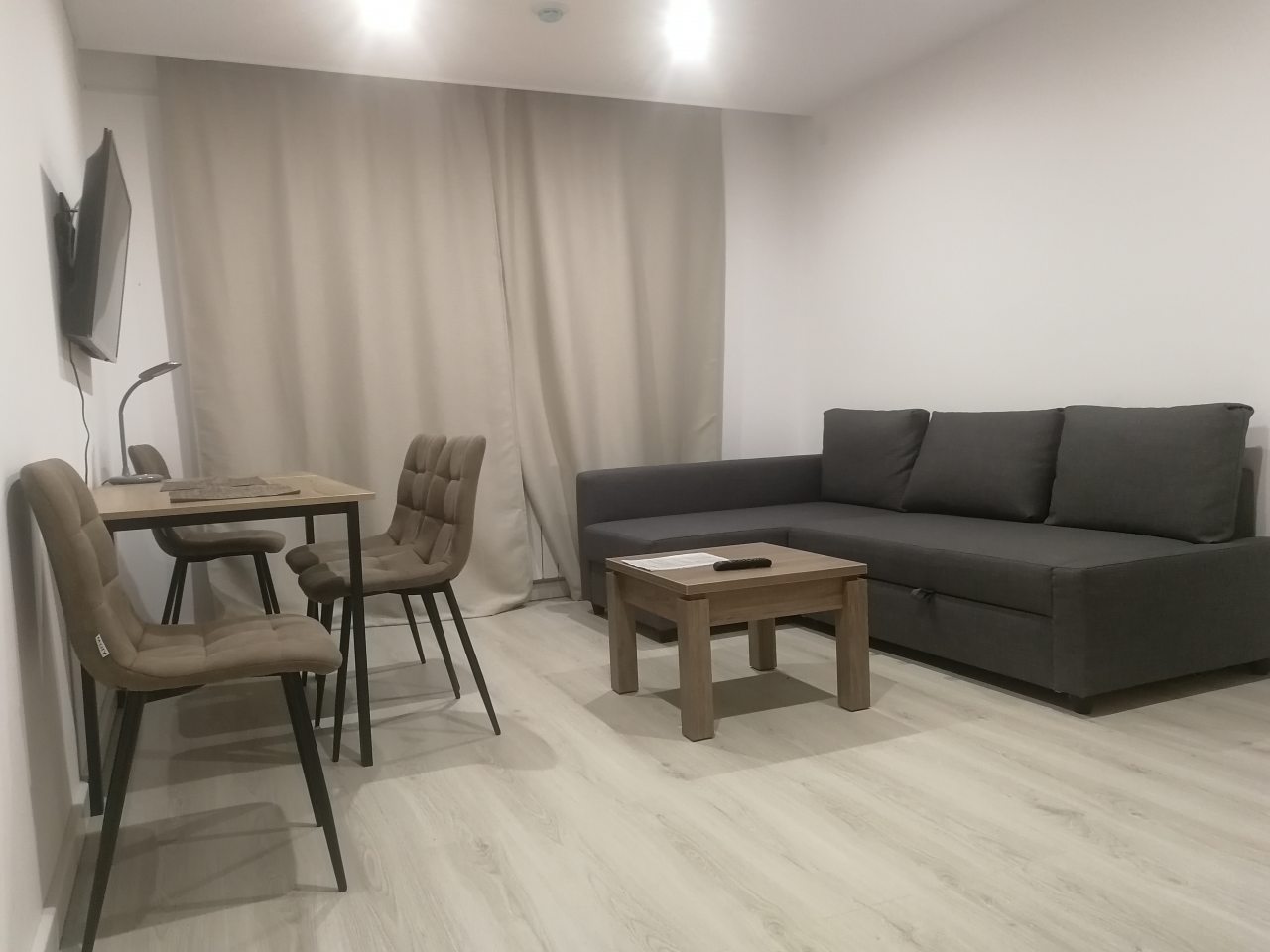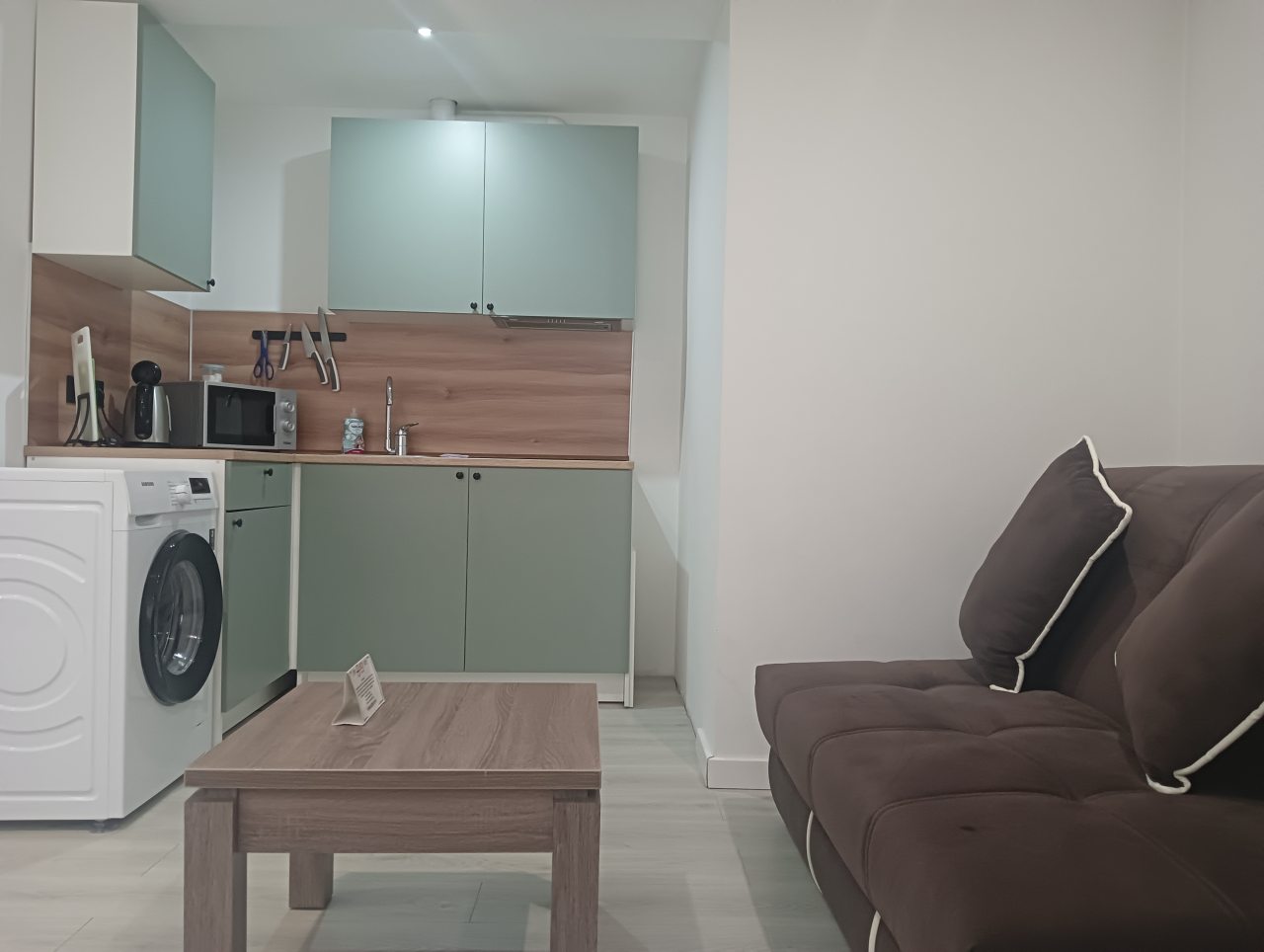 Кухонная зона оснащена гарнитуром, варочной панелью, вытяжкой, холодильником, чайником и микроволновой печью. Вкусно пообедать можно в ближайшем кафе.