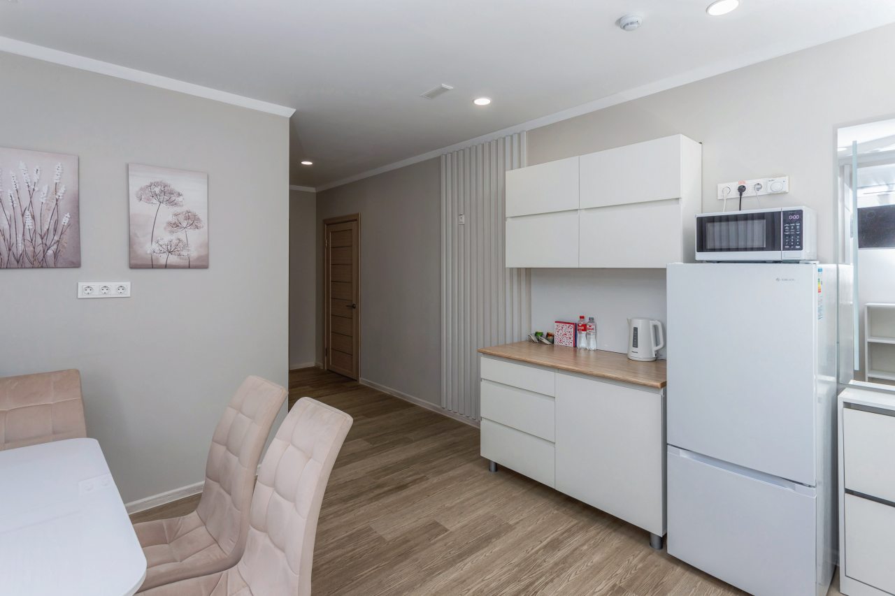 Просторная кухня с большим выбором посуды, приготовить еду легко. Номер классный, понравился, кровать максимально удобная для сна, выспалась превосходно. Стоимость невысокая. Душевая чистая. территория содержится в порядке, персонал отлична справляется со своей работой.