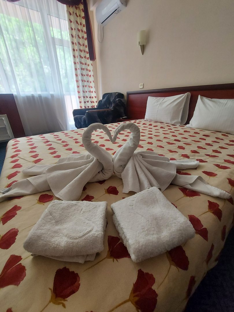 Отель в общем понравился. Встретили, разместили в 45 с видом во внутренний дворик. Комната уютная, кровать удобная, белье чистое и хорошего качества. В ванной комнате душевая кабина - напор воды был хороший и вода горячая в любое время суток. Полотенца меняют, расходники есть, одноразовые тапочки тоже имеются. Пляжные полотенца- большой плюс! Хороший балкончик со столиком и двумя креслами где было приятно посидеть вечером. Имеется кафе - завтраки были включены в стоимость проживания, обеды- ужины можно заказать по меню. Готовят вкусно.