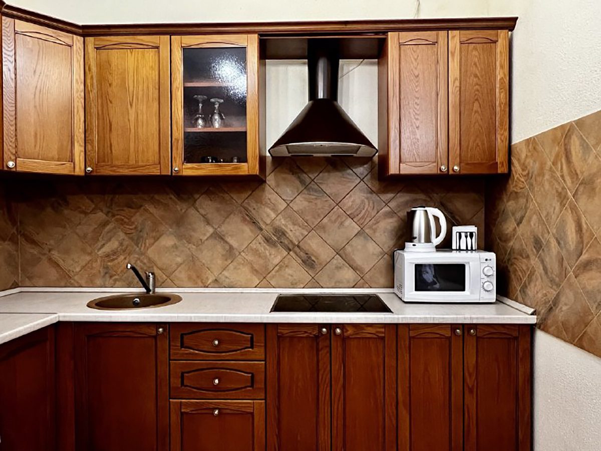 Кухонная зона оборудована бытовыми приборами и укомплектована набором посуды. Поблизости большой выбор продуктовых магазинов.