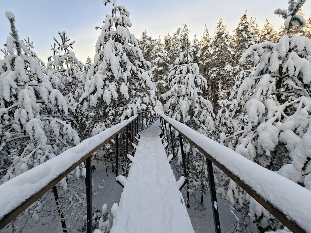 Природа, конечно, очень порадовала! Тишина и красота настоящей русской зимы, которой наслаждались гуляя и наблюдая в панорамном окне! Есть тропы для прогулки по лесу и "среди макушек деревьев"...