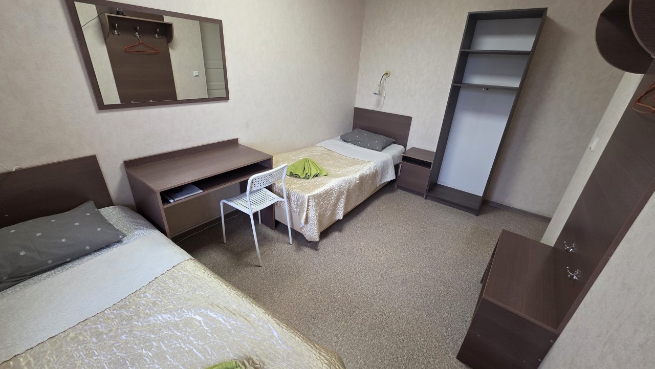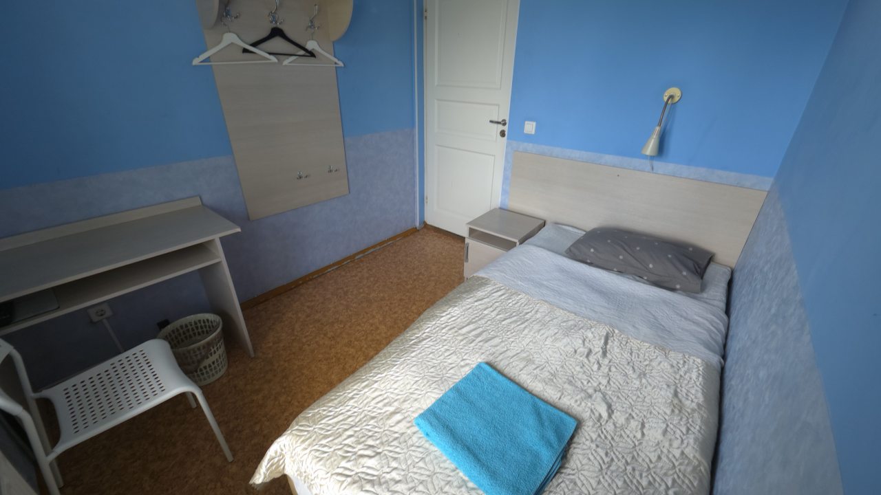 Я жила на втором этаже , душевая и туалет раздельные, комната уютная, 2 кровати,тумба,стол с зеркалом ,стул,вешалка для одежды,мусорное ведро,телевизор , и у меня был вентилятор ( что очень понравилось)!