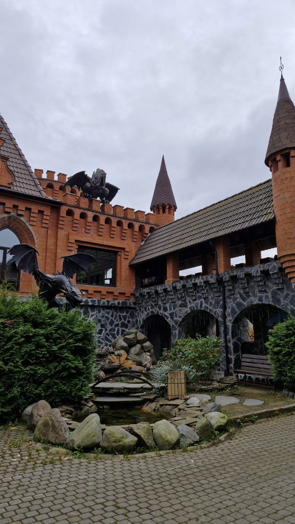 Прекрасный отель в стиле рыцарского замка. Очень атмосферное место, 5 минут езды о центра, при этом очень тихий спокойный район в частном секторе. Отличные вкусные завтраки, классный бассейн!