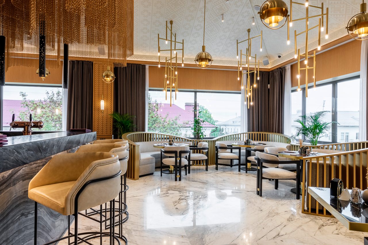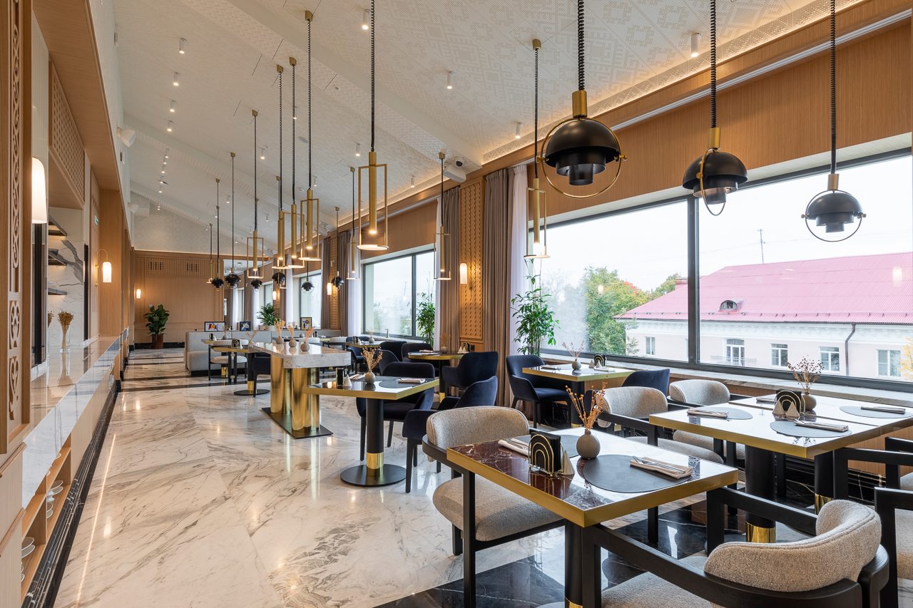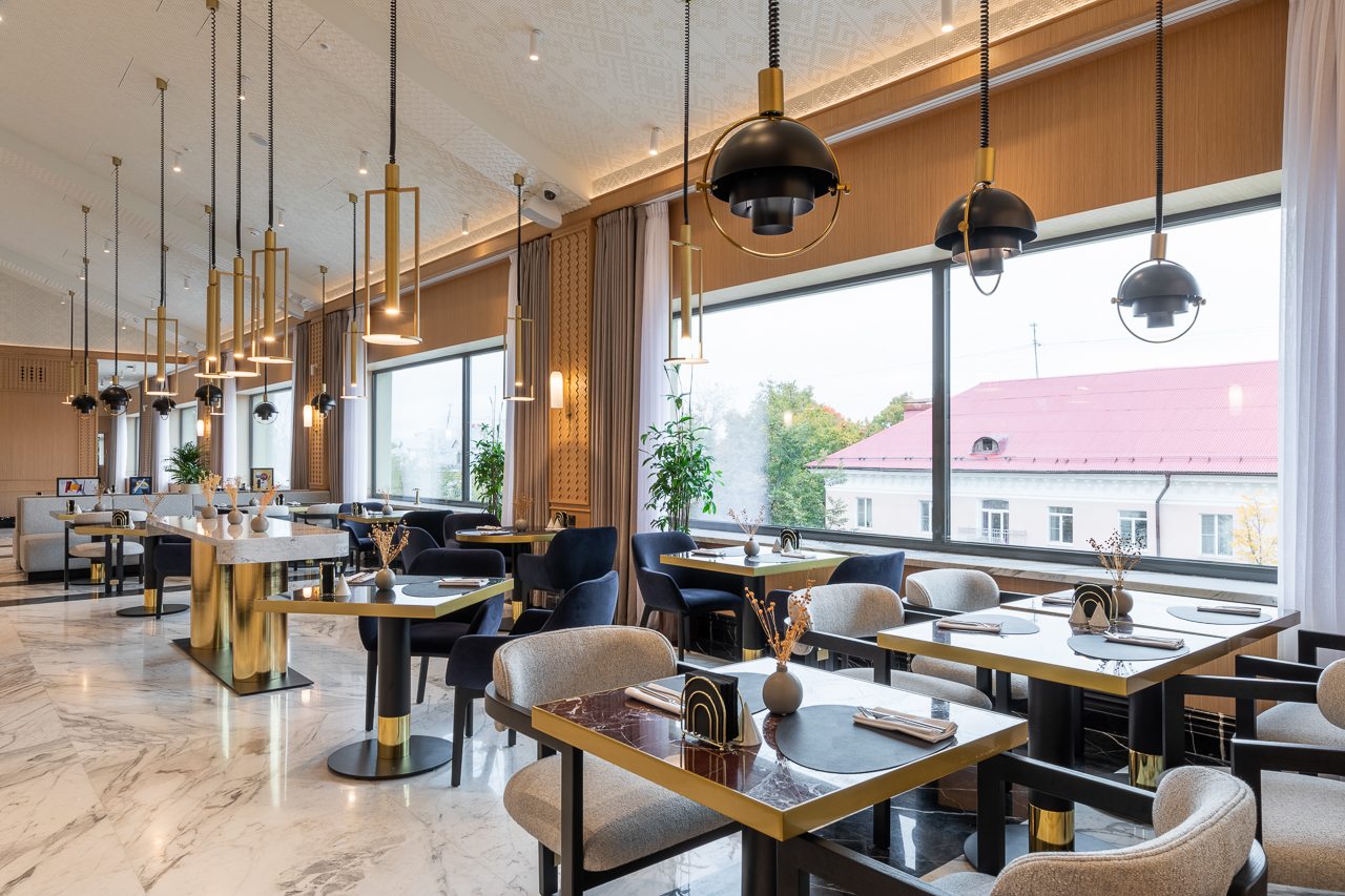 Попробовать изысканные блюда и напитки, а также насладиться панорамным видом на город можно в ресторане «Проун». Также при отеле есть лобби-бар.