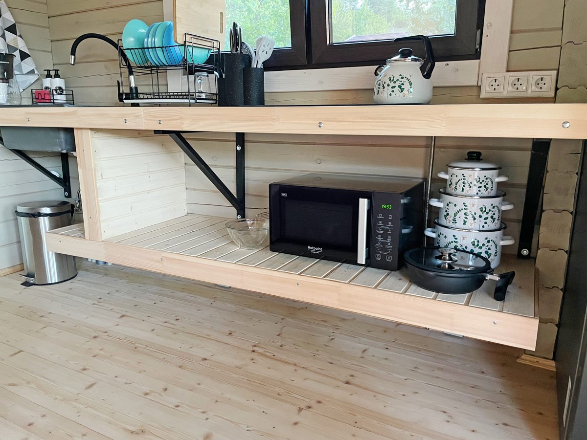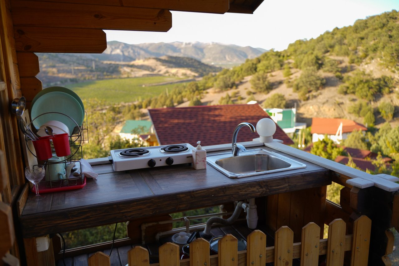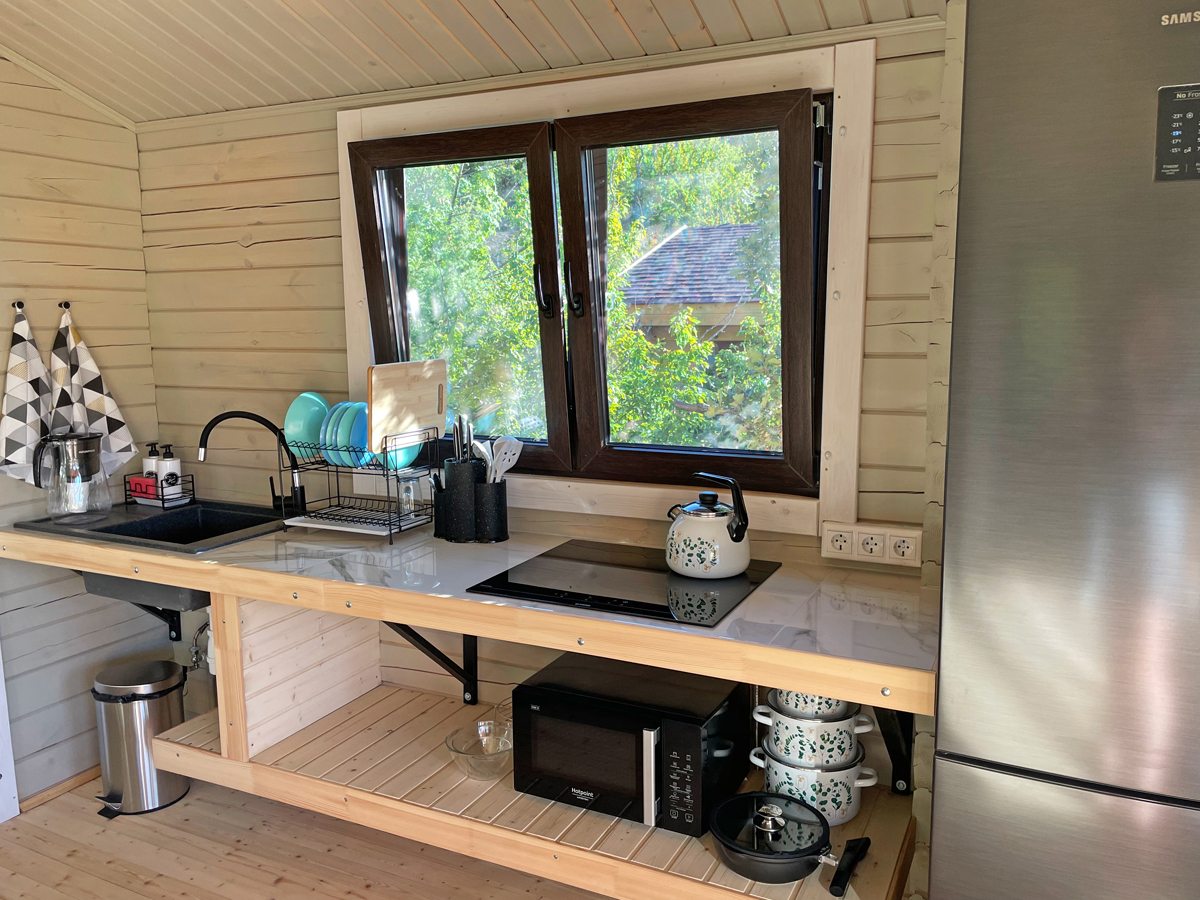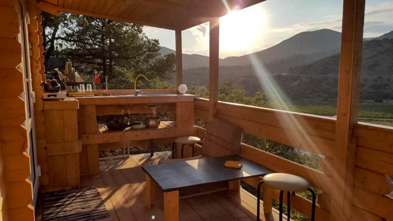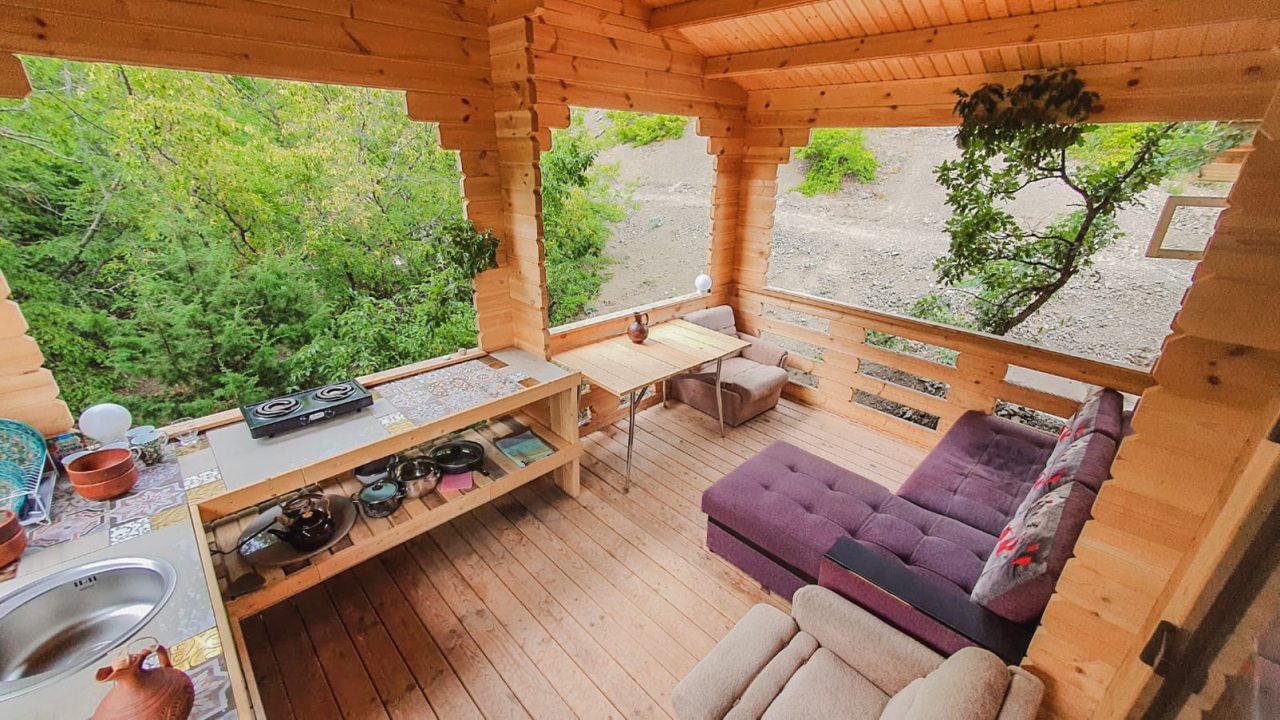 В каждом отдельном домике есть своя кухня с холодильником, чайником и электроплитой. Обеденная зона находится на улице.