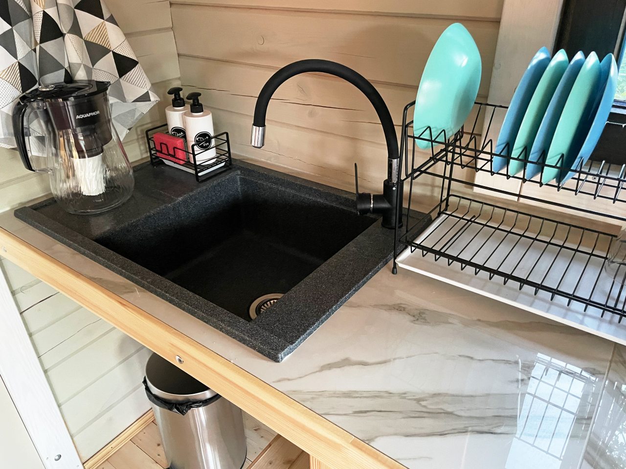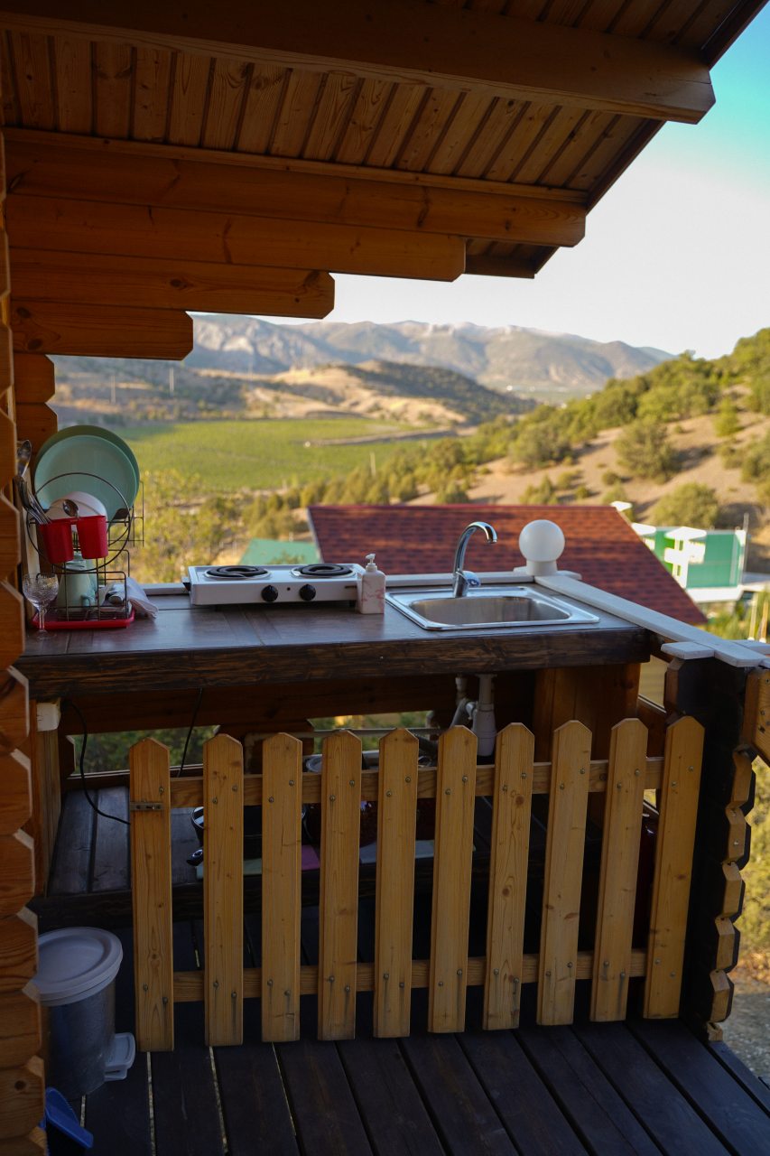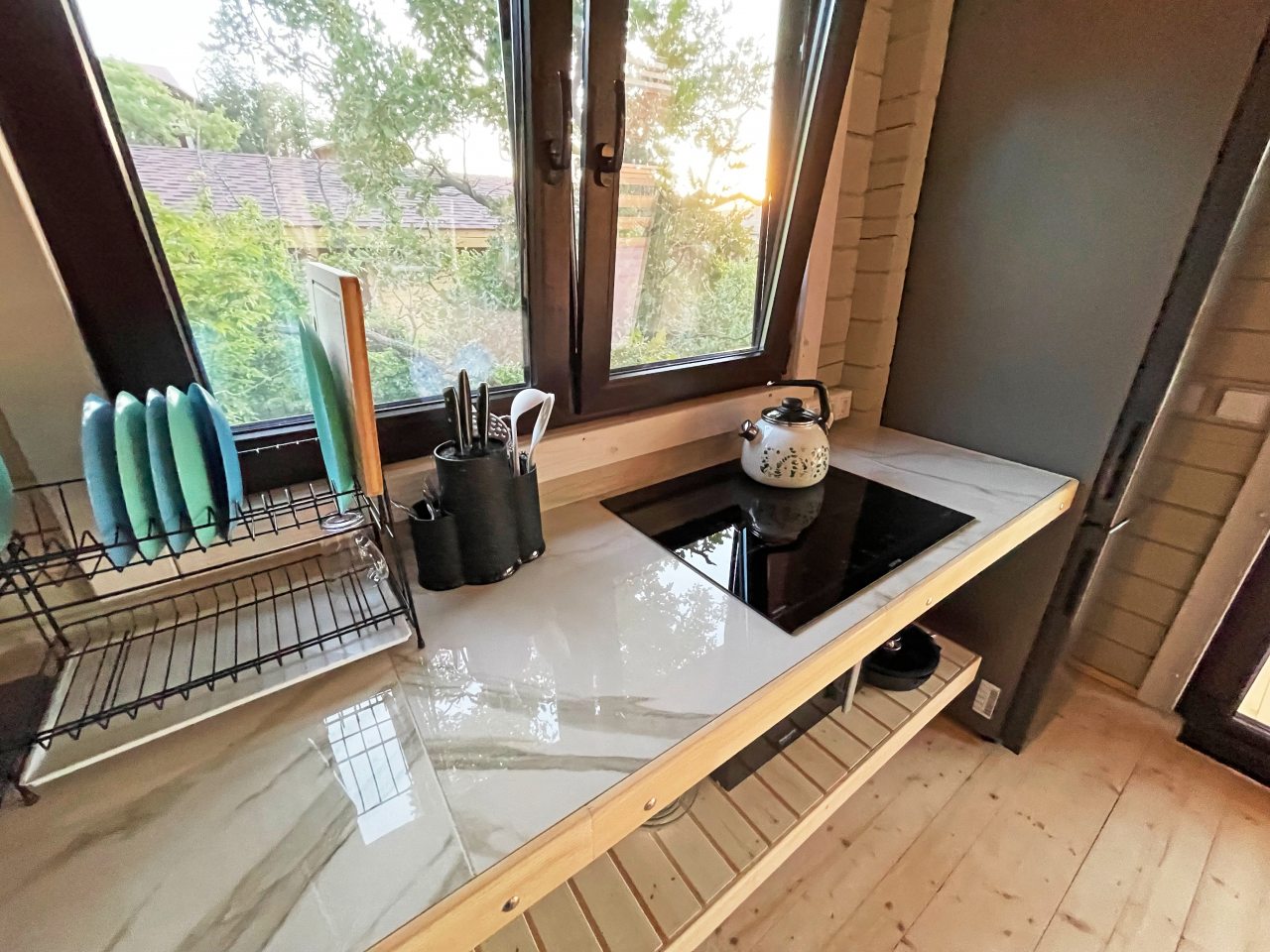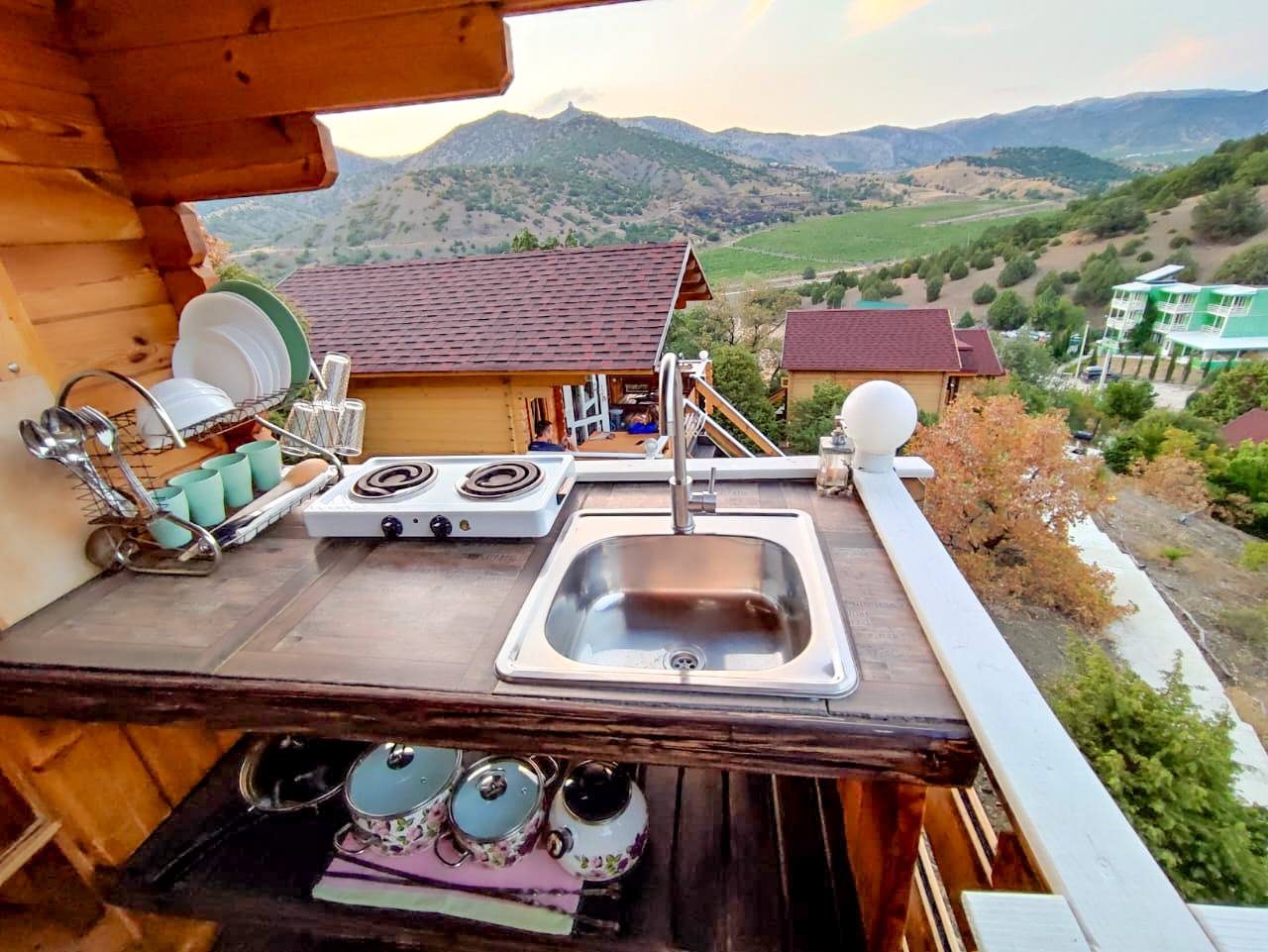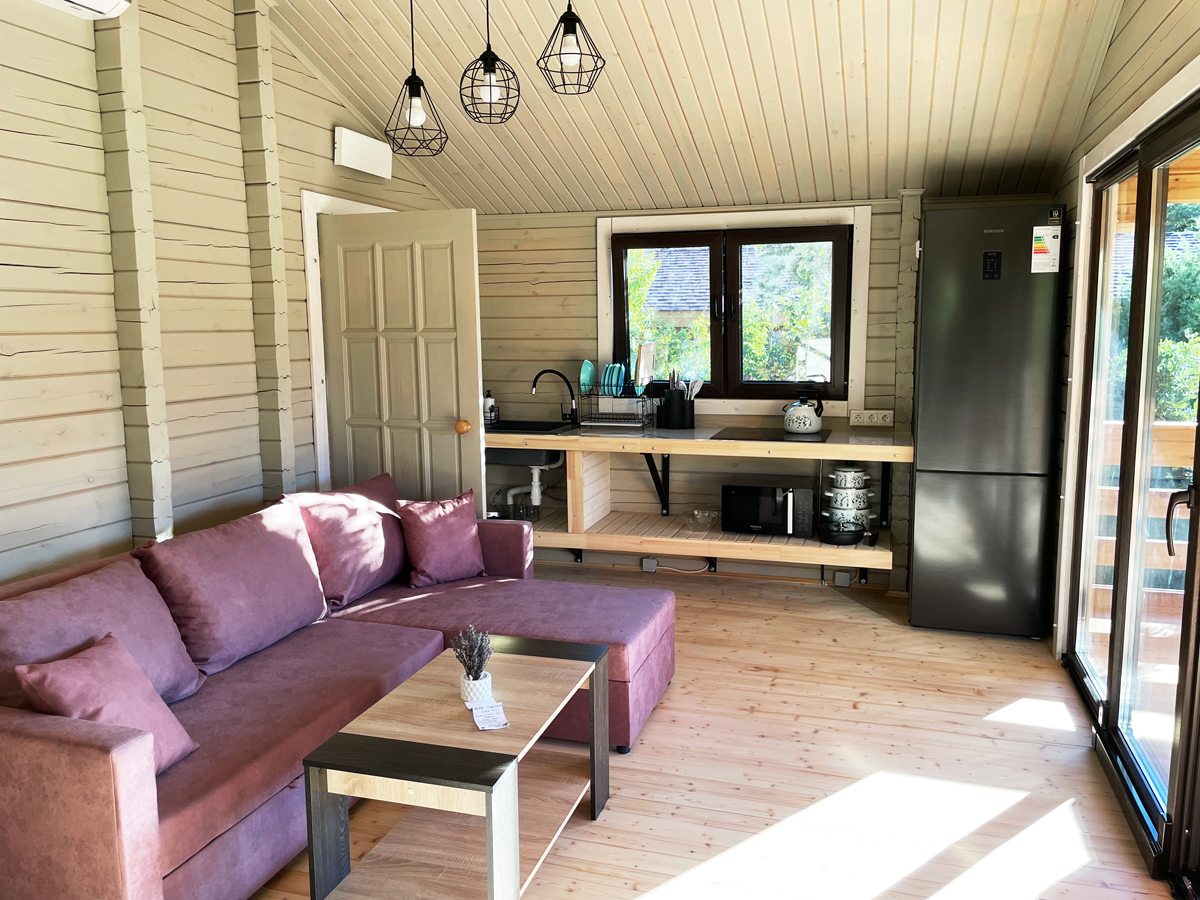 В каждом отдельном домике есть своя кухня с холодильником, чайником и электроплитой. Обеденная зона находится на улице.