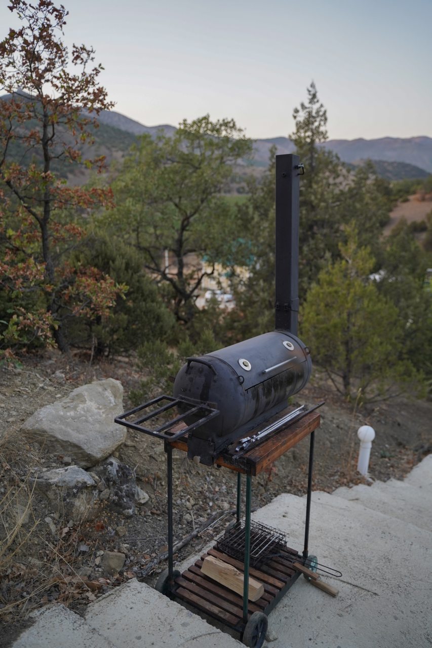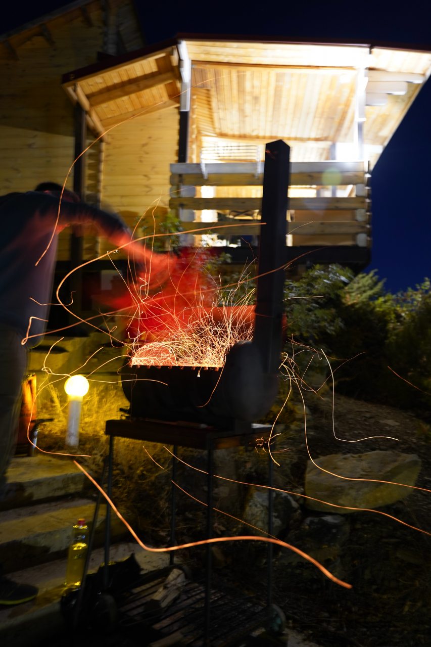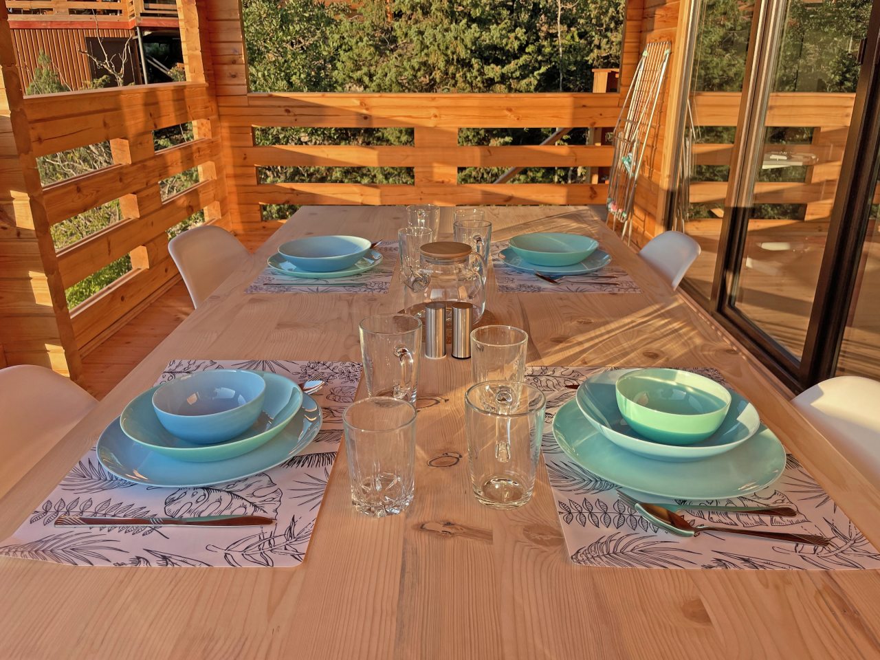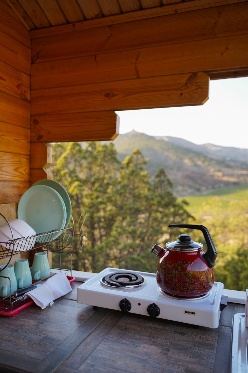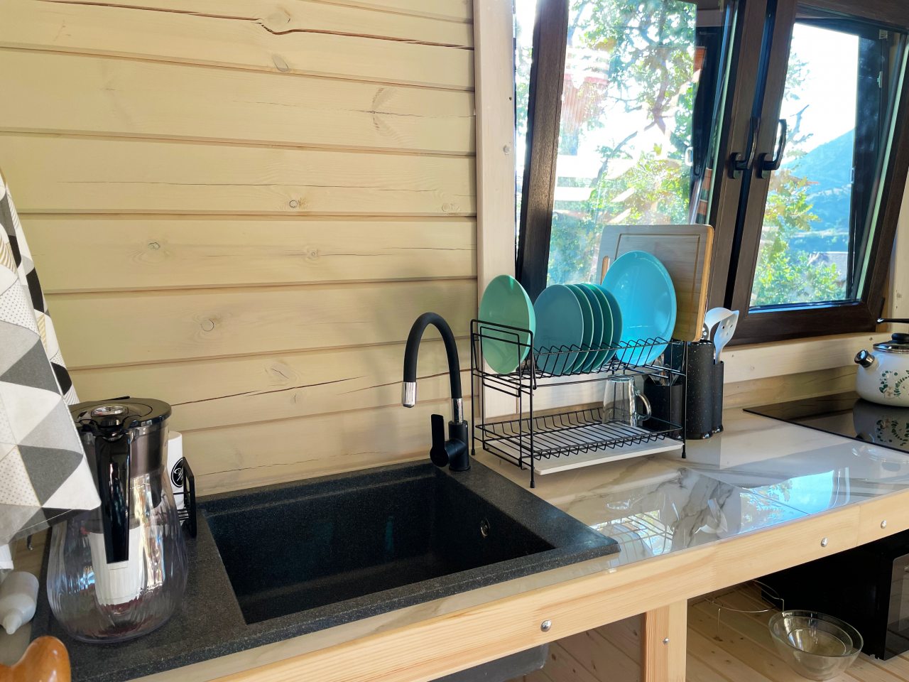 В каждом отдельном домике есть своя кухня с холодильником, чайником и электроплитой. Обеденная зона находится на улице.