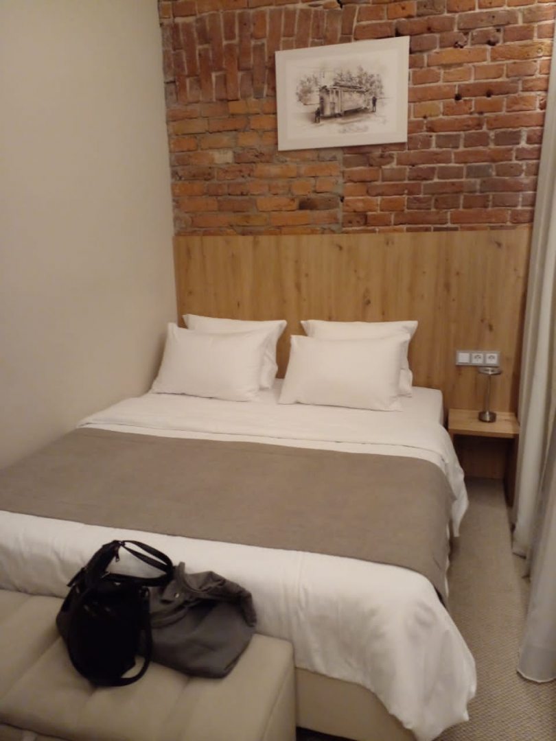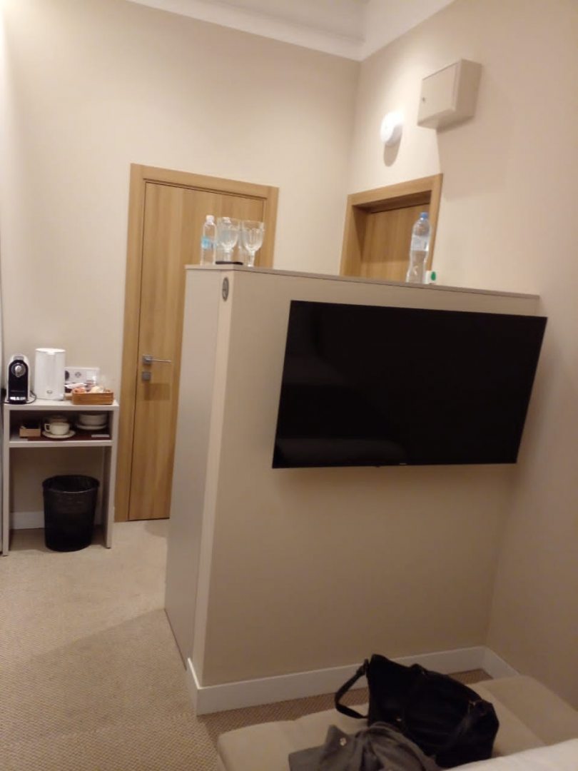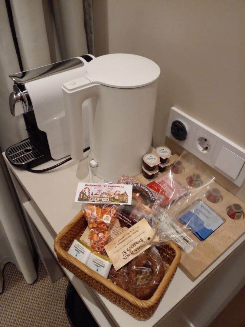 Забронировали небольшой номер-смарт в отеле. Номер небольшой с окнами во двор, но очень уютный. Кровать с ортопедическим матрасом, наличие двух подушек на каждого человека. Телевизор в номере с необходимым наличием каналов. Маленький кухонный столик у окнам. Чайничек с набором необходимой посуды, что немаловажно...- в чём пить и чем есть, для принятия пищи. Чай, сливки сахар. Небольшой кофейный аппарат для любителей кофейных напитков. Плюс водичку для питья предоставляют в номерах, если неудобно спускаться на ресепшен к кулеру. Есть шкафчик для одежды, банные халатики, разовые тапочки.