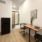 Зона кухни укомплектована плитой, СВЧ, чайником, холодильником, обеденным столом и стульями, чтобы вы в любой момент могли насладиться любимой едой и напитками.