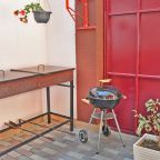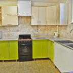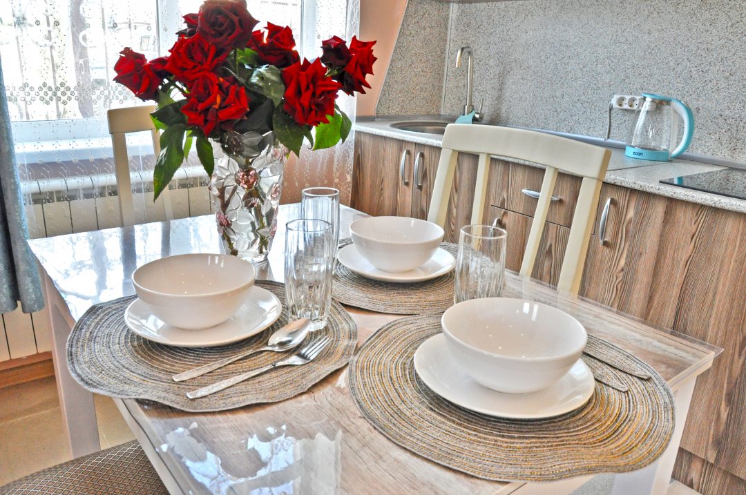 Кухня снабжена обеденным столом, гарнитуром с индукционной плитой, холодильником и посудой.