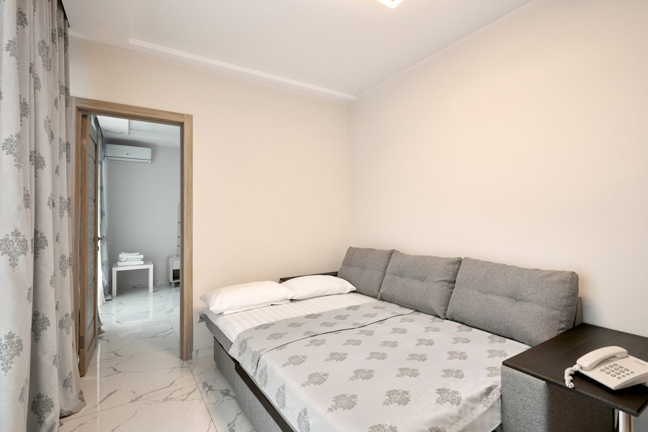Заехали в отель случайно, но понравился очень. Бассейн отличный, дети плавали с удовольствием, чистый, везде красиво, лифт новый, водичка на каждом этаже, балкончики в номерах, кровать удобная, уборка ежедневная по запросу. Про питание ничего не могу сказать, у нас было без питания. В принципе людей мало было,но это больше плюс. От моря минут 10, но зато тихо, весь движнях в пяти минутах ходьбы от отеля начинался. Мы были с детьми, мне все понравилось.