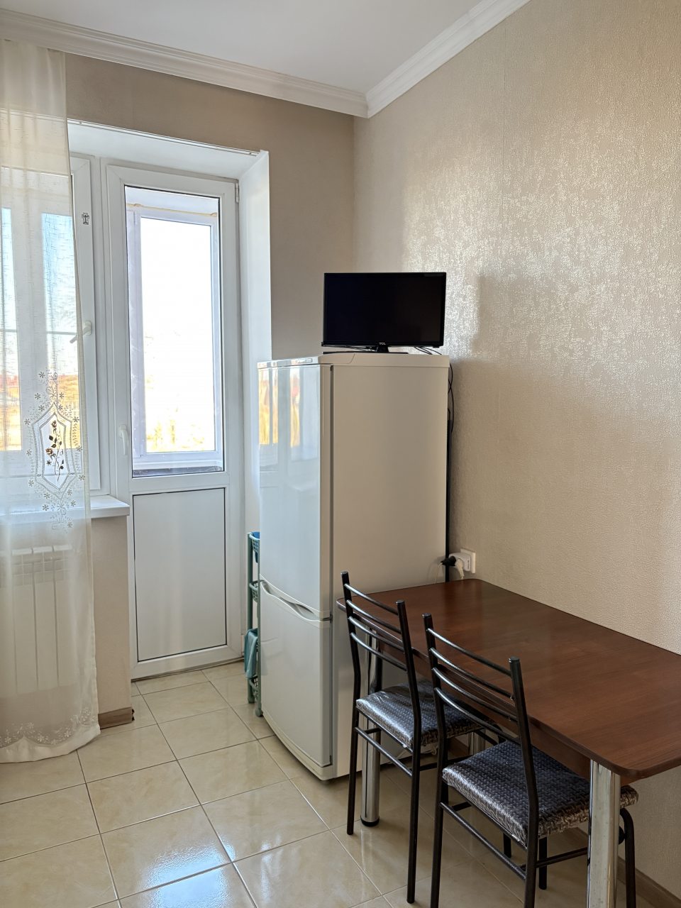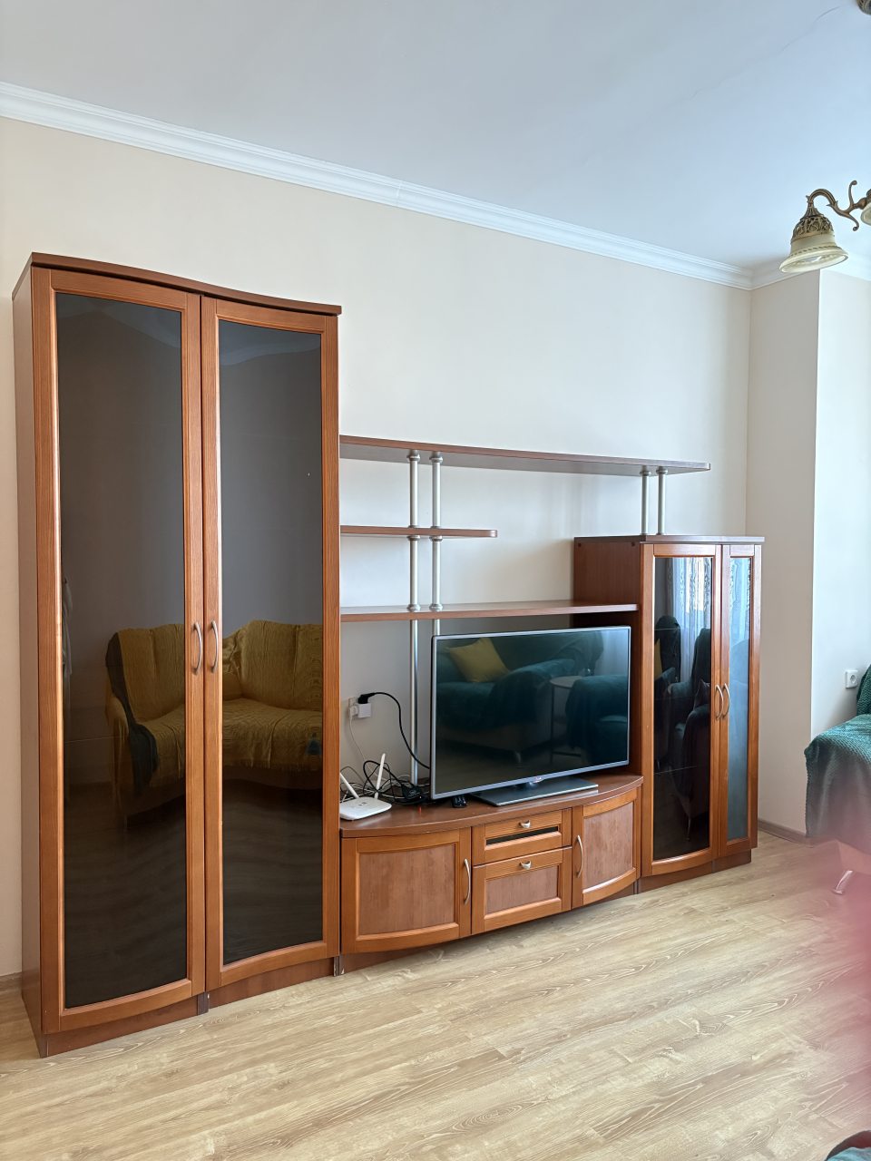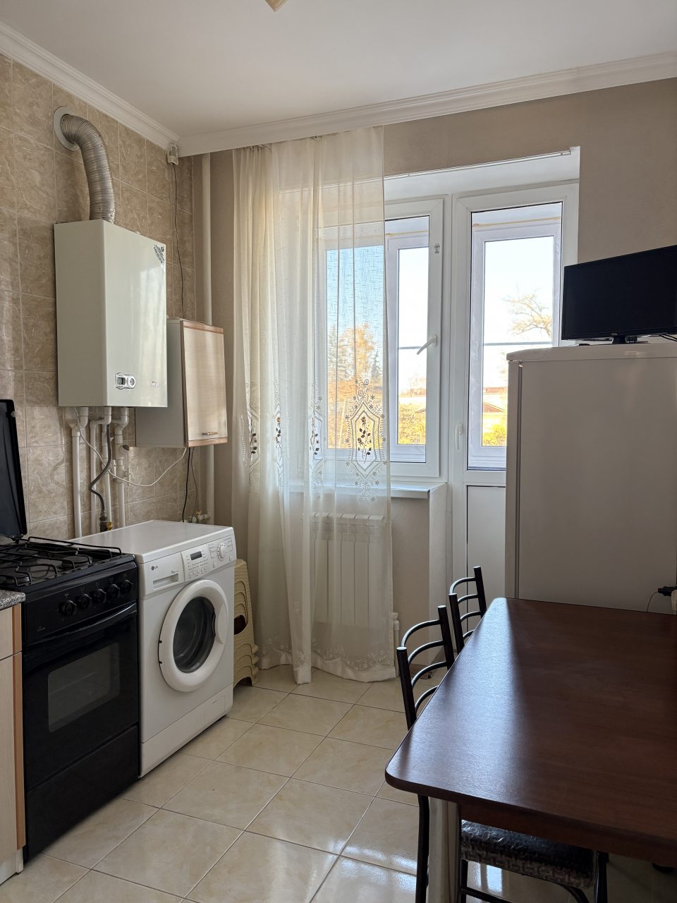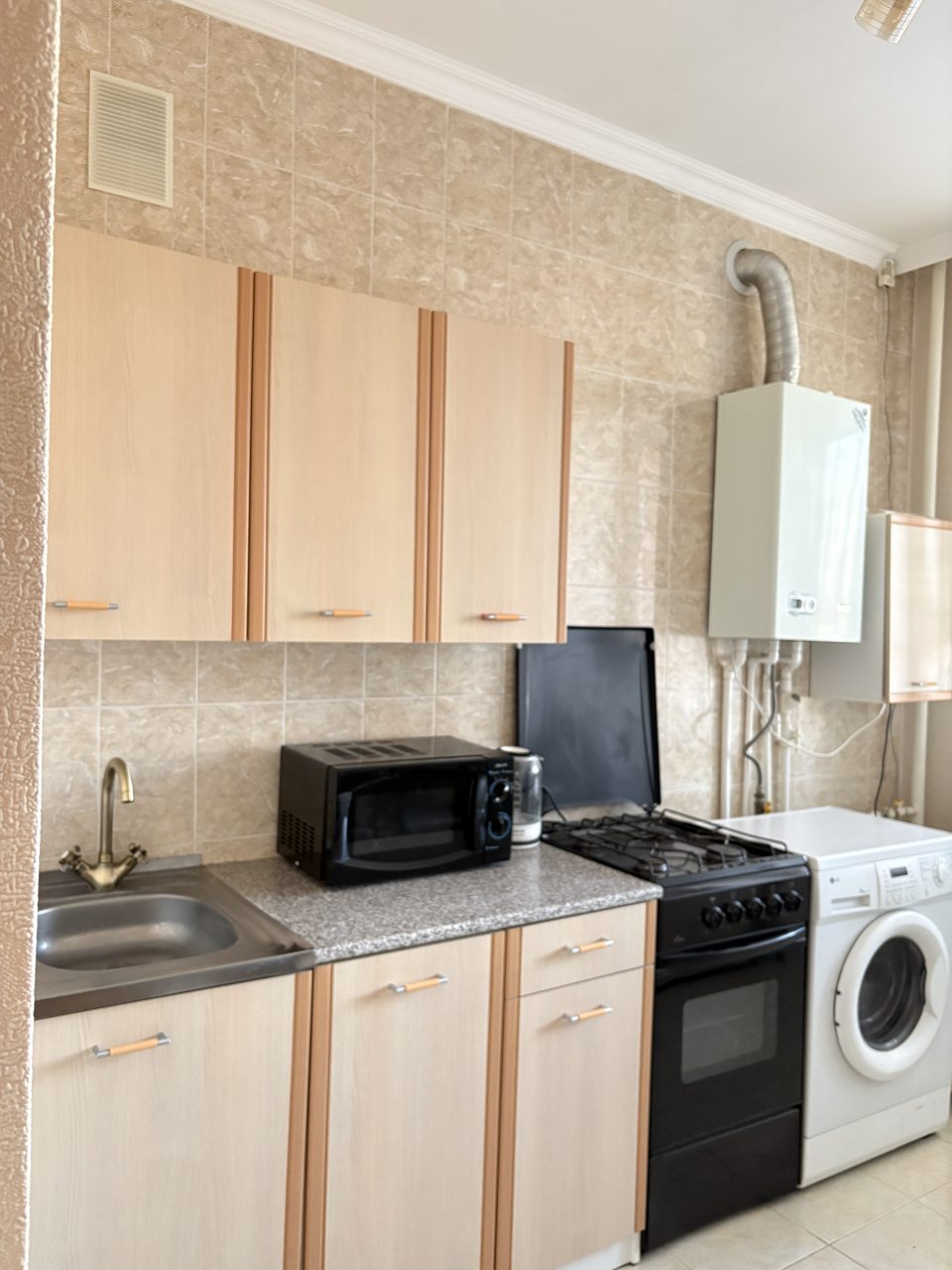 На кухне имеется всё необходимое для приготовления домашних блюд и напитков: духовой шкаф, плита, СВЧ, чайник, холодильник.