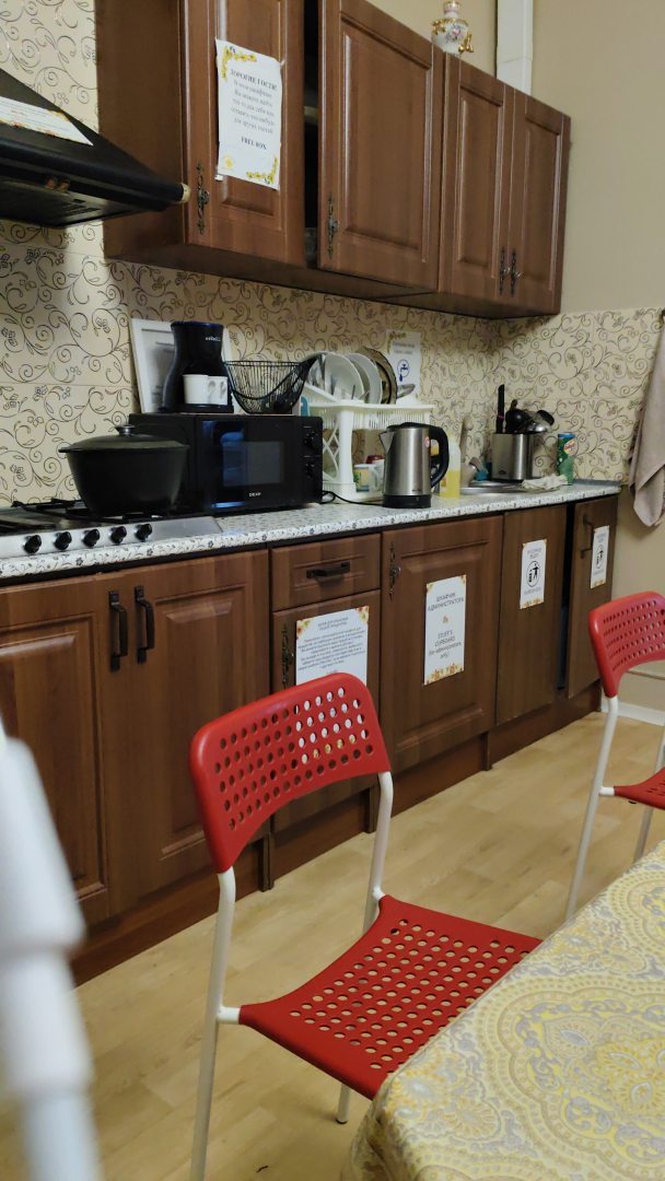 Общая кухня оснащена плитой, чайником, микроволновкой и кулером. Есть вся необходимая посуда. Наслаждайтесь приготовлением и приемом пищи за большим уютным столом. В шаговой доступности супермаркет.