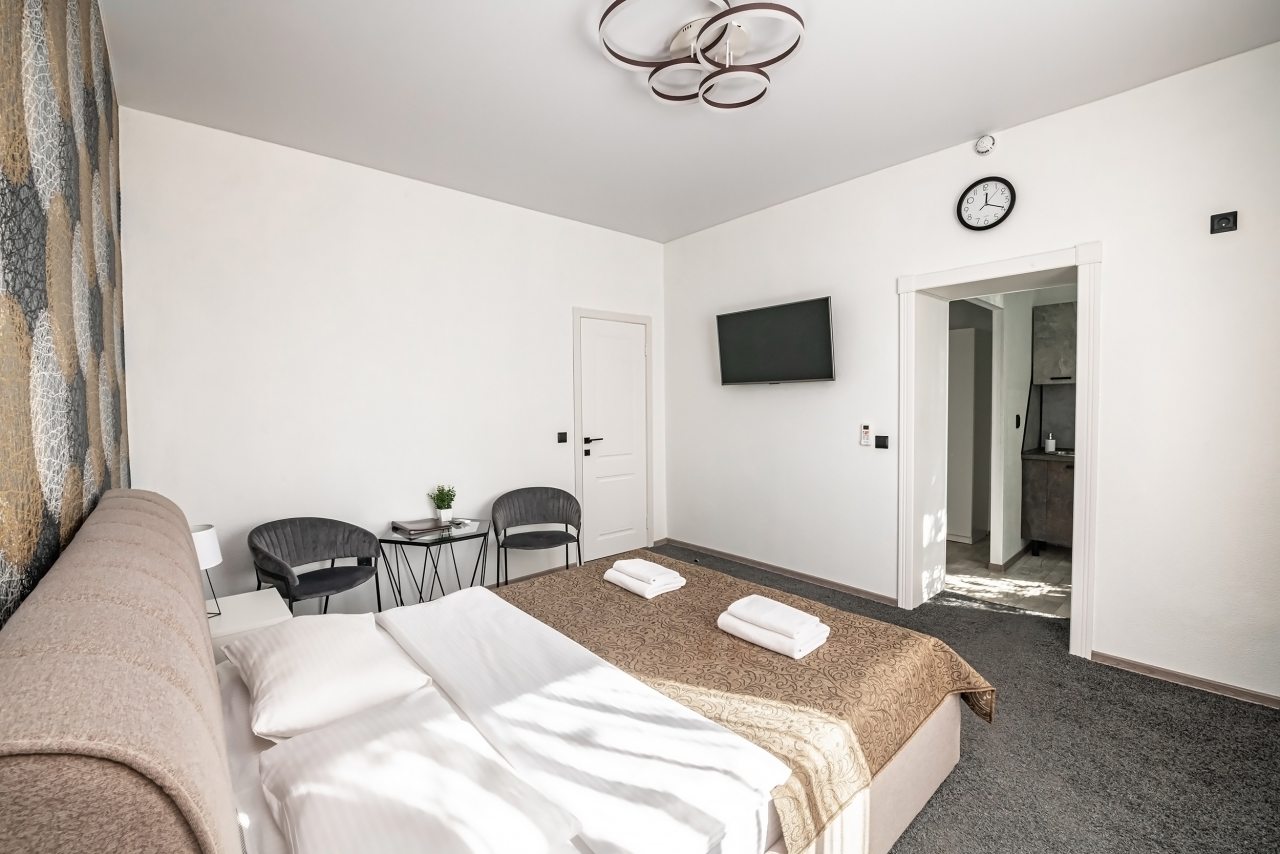К размещению гостей предоставляются комфортабельные апартаменты. Все они оформлены в современном стиле и оборудованы удобными спальными местами, качественной мебелью и необходимой техникой. В числе прочих удобств - собственная ванная комната.
