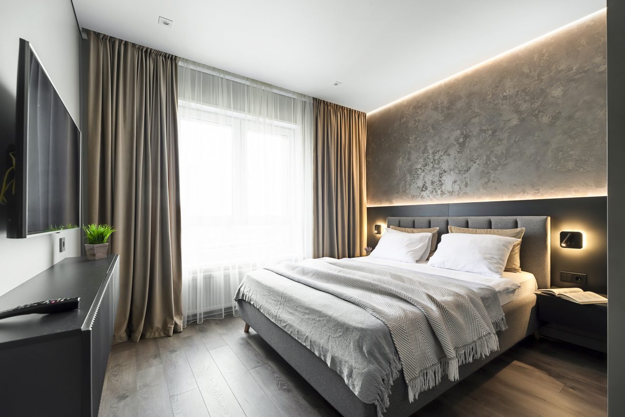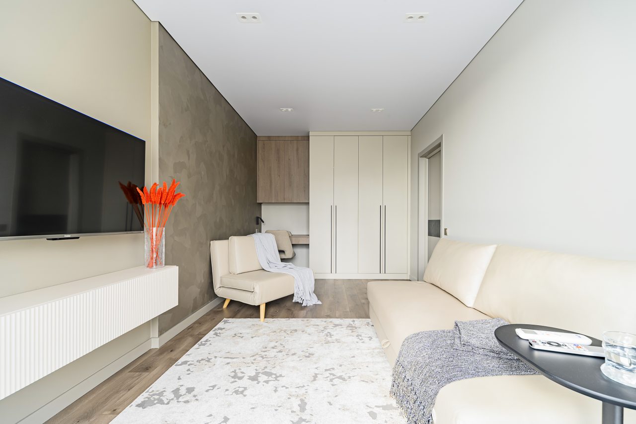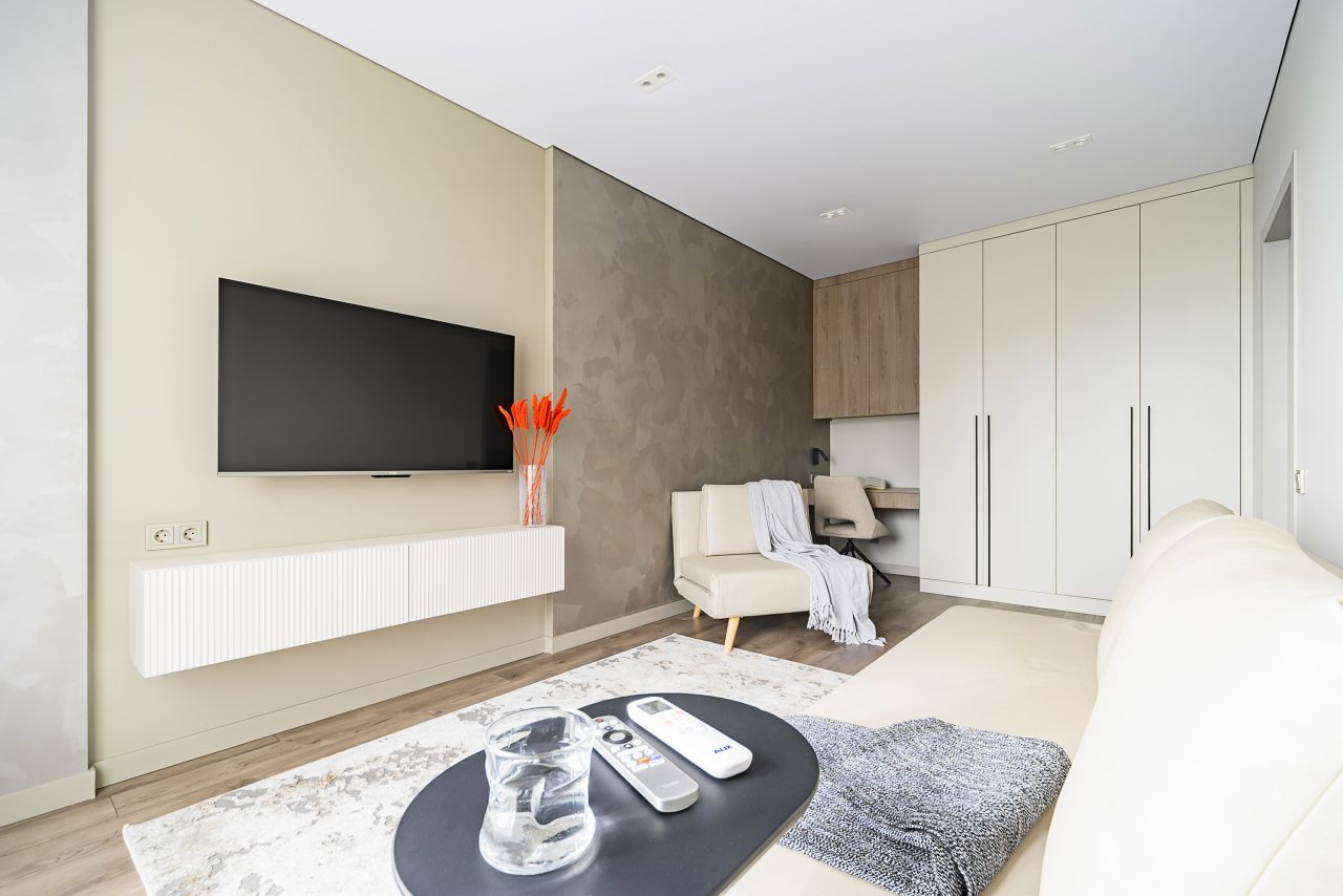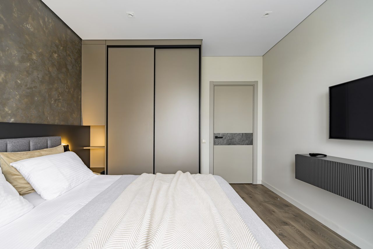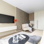 Внутри вас ожидает качественная и современная мебель и техника, в том числе большая и удобная кровать с мягким изголовьем, телевизоры, различные сценарии освещения, мягкий диван и кресло, вместительные шкафы, письменный стол, ванная комната с необходимой сантехникой.