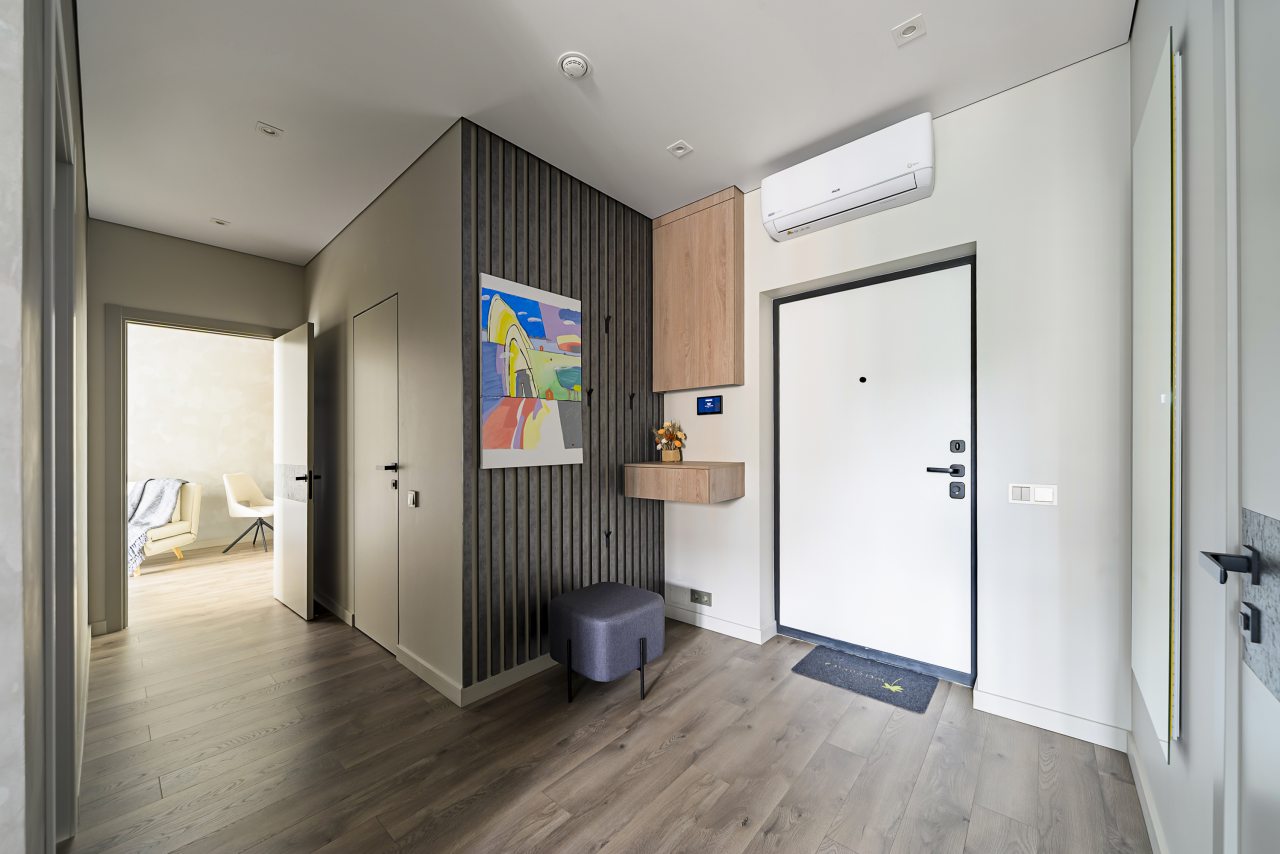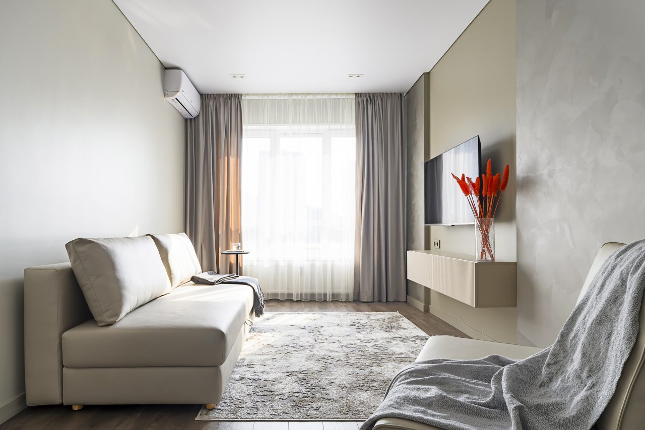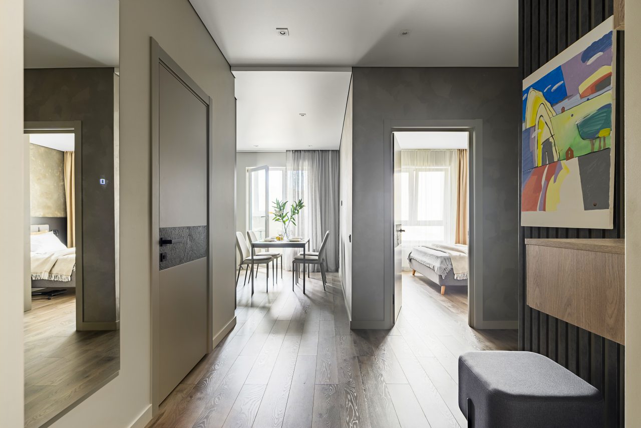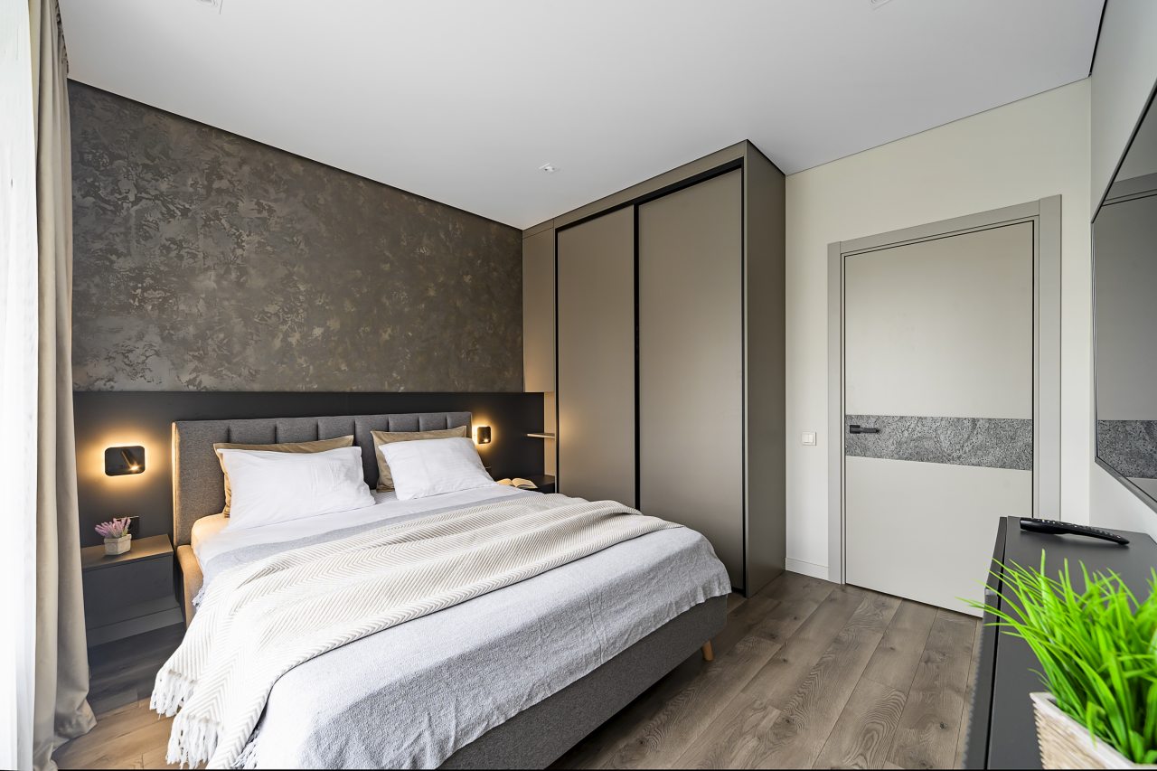 Внутри вас ожидает качественная и современная мебель и техника, в том числе большая и удобная кровать с мягким изголовьем, телевизоры, различные сценарии освещения, мягкий диван и кресло, вместительные шкафы, письменный стол, ванная комната с необходимой сантехникой.
