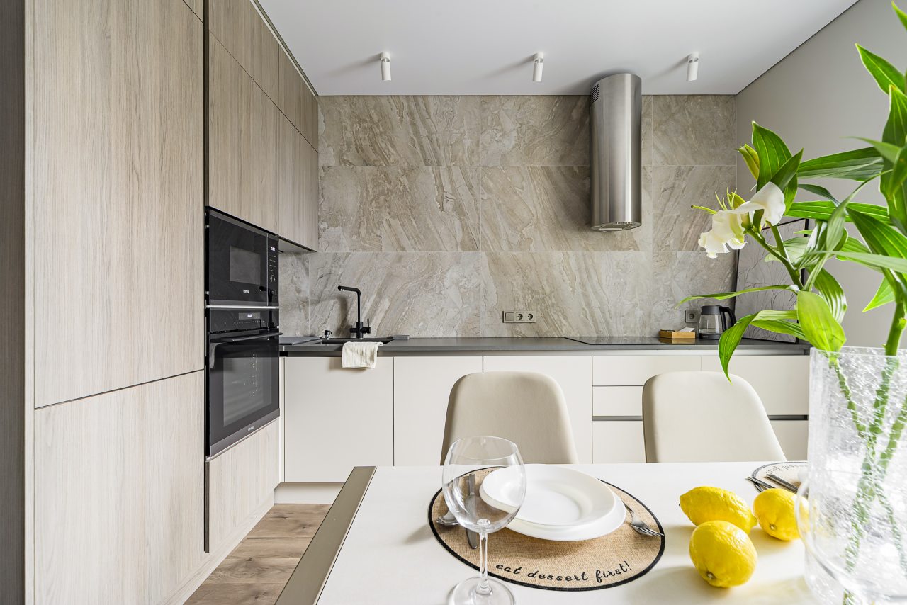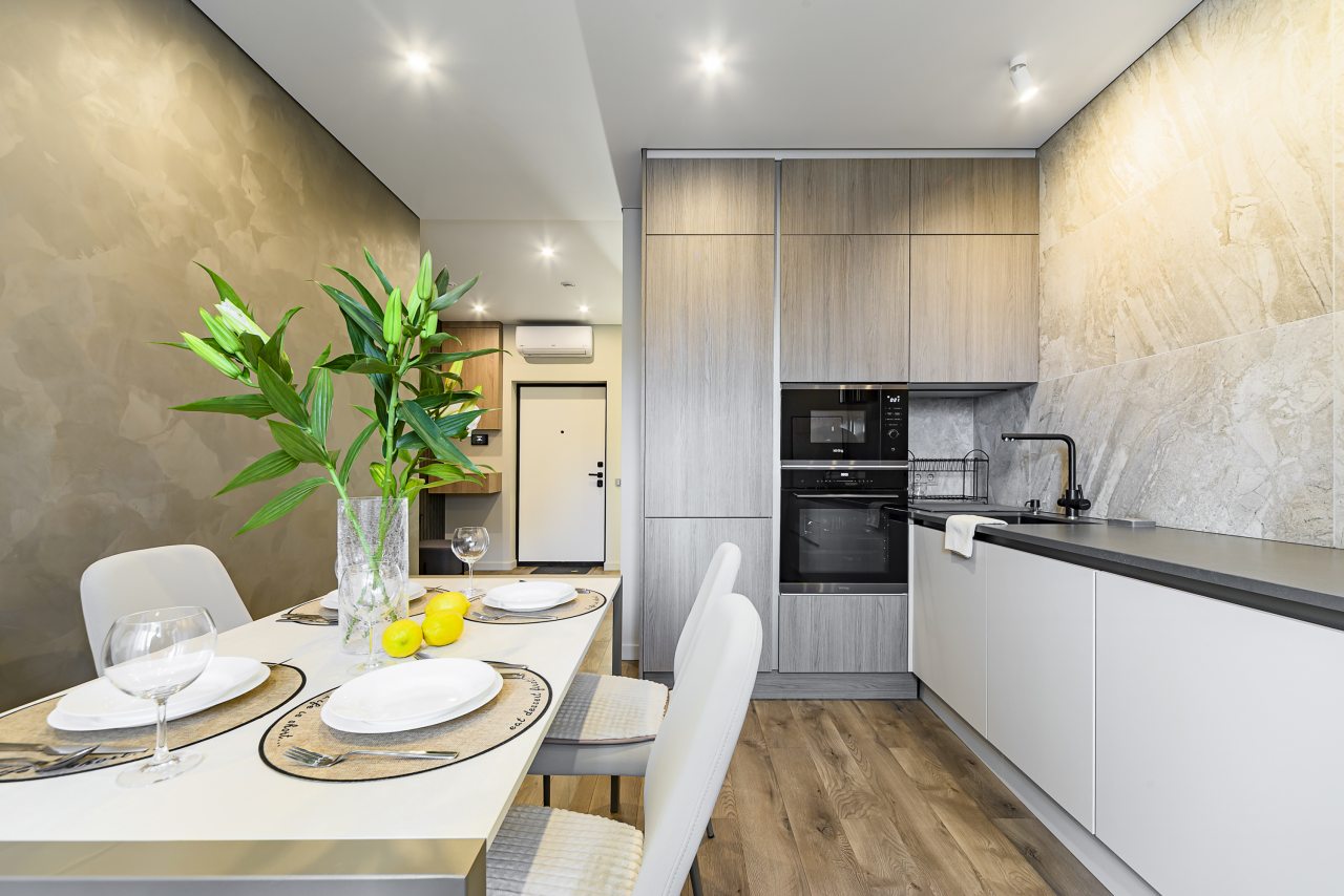 На просторной кухне будет приятно готовить любимые домашние напитки и блюда, так как в наличии варочная панель с вытяжкой, СВЧ, чайник, духовой шкаф, посуда и столовые приборы.