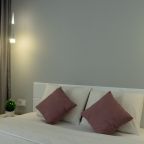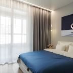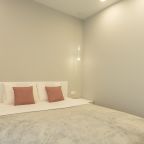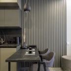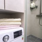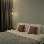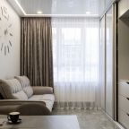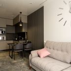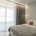 Для размещения гостей предоставляются современные апартаменты с качественным ремонтом и стильным дизайном. Для удобства установлены двуспальная кровать, телевизор и удобный диван. Благодаря таким элементам декора, как настенные часы и картины, плотные шторы, создается атмосфера уюта. В ванной комнате полный набор сантехники, включая стиральную машину.