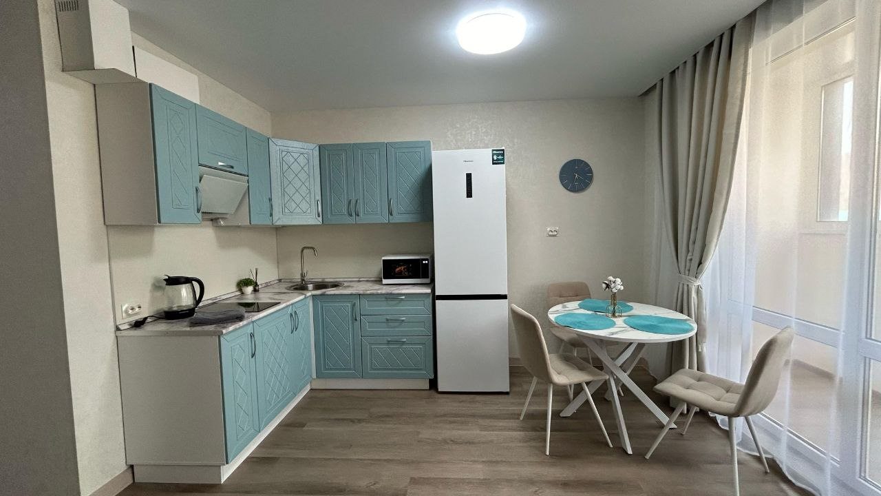 На кухне, выполненной в голубых и бежевых тонах, будет приятно готовить и наслаждаться любимыми блюдами, поскольку варочная панель, СВЧ-печь, электрический чайник, круглый обеденный стол и стулья в наличии.