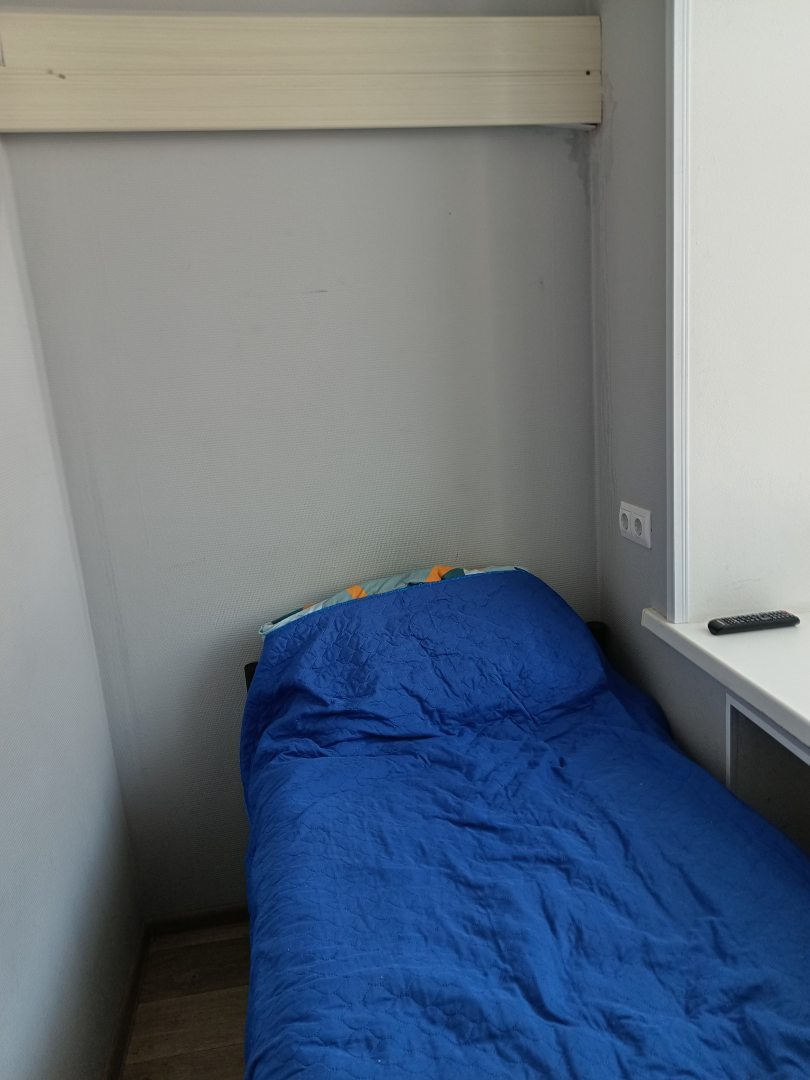 В номерах выполнен современный ремонт, в приятных сине-голубых цветах. В комнатах стоят двухъярусные кровати со шторками, есть ящики для обуви, шкаф с вешалками. Душевая и санузел на этаже.