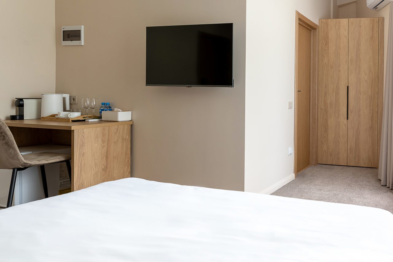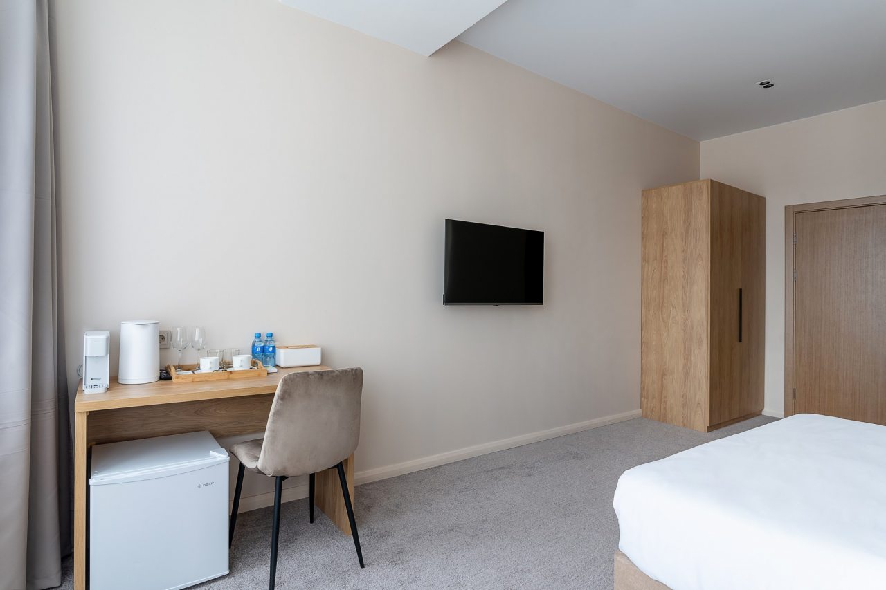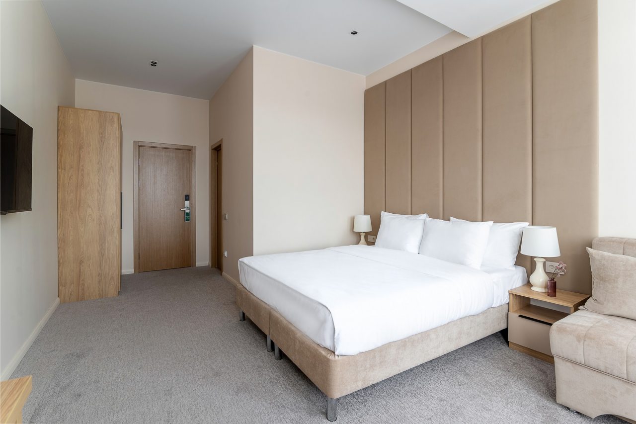 Для гостей доступны номера, различные по вместимости и категориям. Все из них укомплектованы качественной техникой и мебелью, в том числе удобными кроватями с мягким изголовьем, кондиционером, плотными шторами, прикроватными лампами и тумбами, смарт-ТВ. Также предусмотрен собственный санузел с душем и средствами для гигиены.