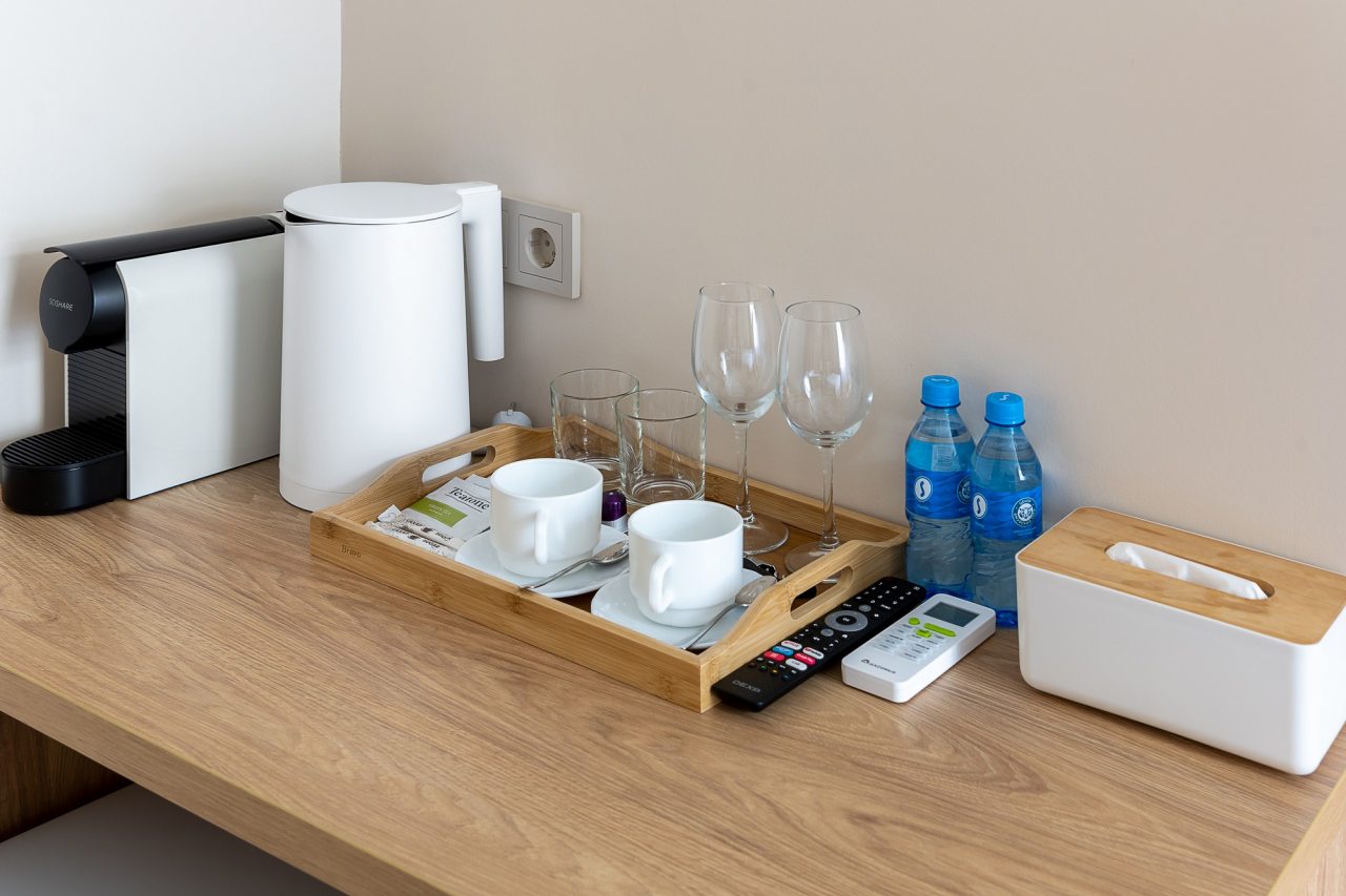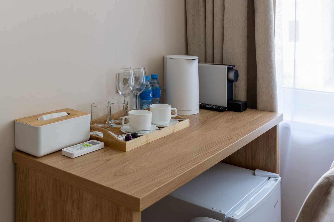 Чтобы вы в любое время могли насладиться горячим напитком или перекусом, в номерах установлены холодильник, чайник и кофемашина.