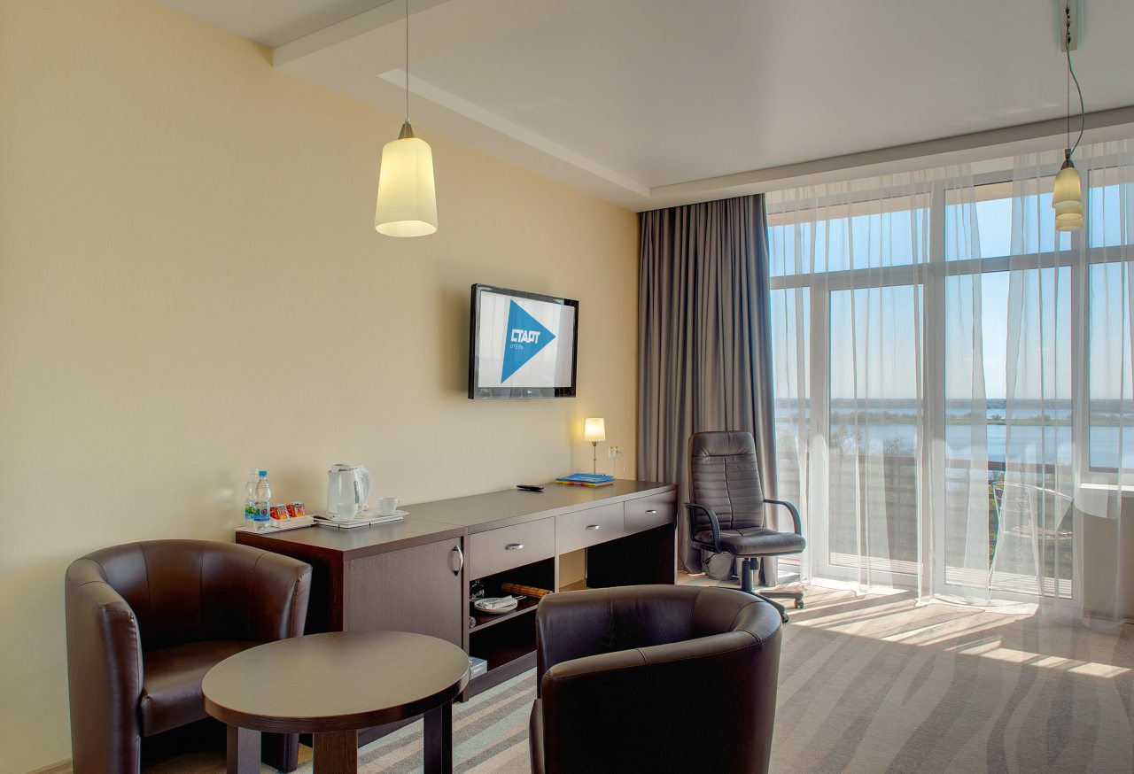 Для размещения предлагаются комфортабельные номера с живописным видом на Волгу. Каждый из них оснащен необходимой мебелью и техникой. Собственные ванные комнаты укомплектованы феном.
