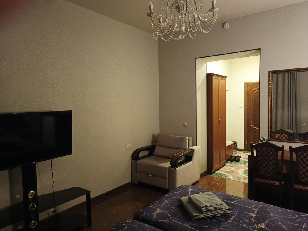 В номере и гостинице чисто, уютно. У нас был включен завтрак. Завтрак - на выбор 3 блюда. Персонал вежливый. Есть стоянка для авто перед гостиницей, правда не огорожена, но под камерами. В номере все необходимое: кондиционер, окно с сеткой, холодильник, чайник, посуда, чай в пакетиках, сахар, Wi-Fi, телевизор, фен, полотенца и "мыльно-рыльное" .