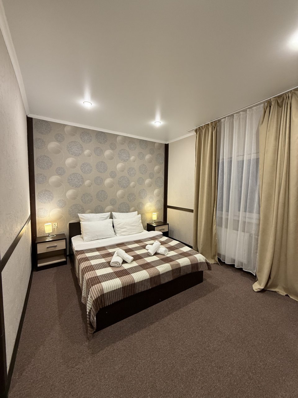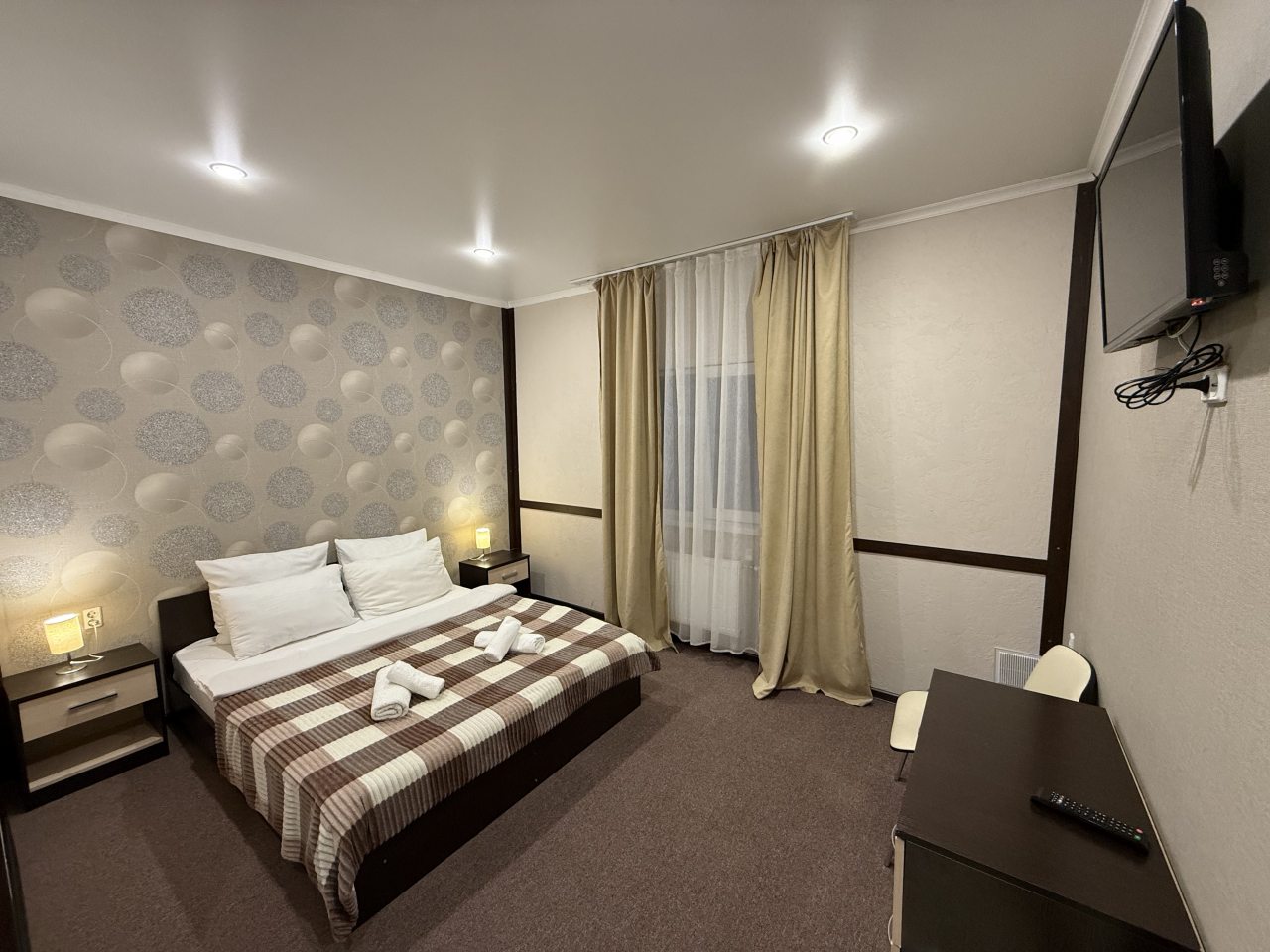 К размещению гостей представлены комфортные номера различных категорий. Все они очень уютные и оборудованы удобными спальными местами, качественной мебелью и телевизором. В собственной ванной комнате обязательно есть набор свежих полотенец и средства личной гигиены.