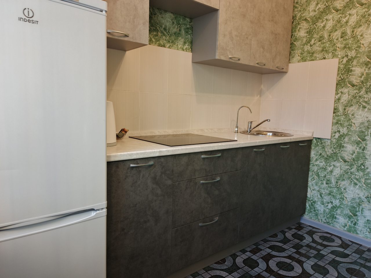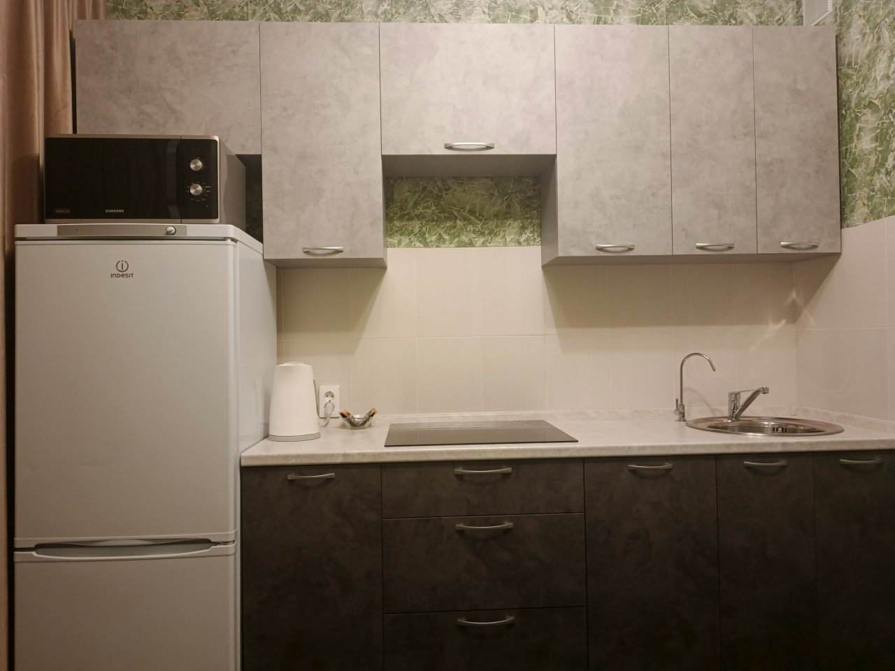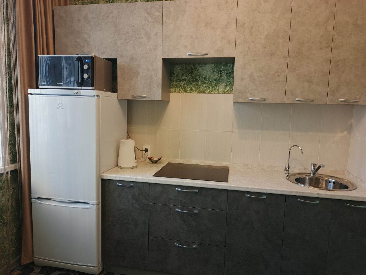 Квартира оснащена кухонным гарнитуром, холодильником, плитой, электрическим чайником. Вблизи расположены продуктовые магазины.