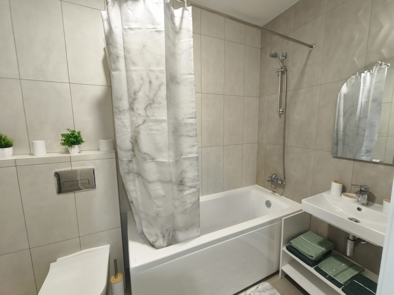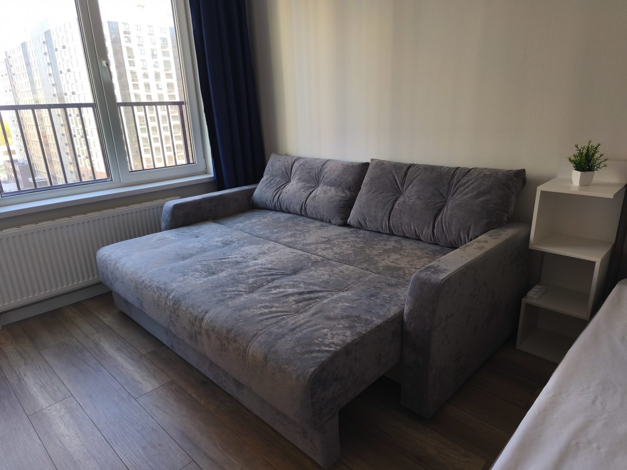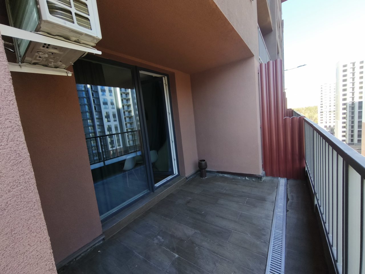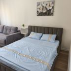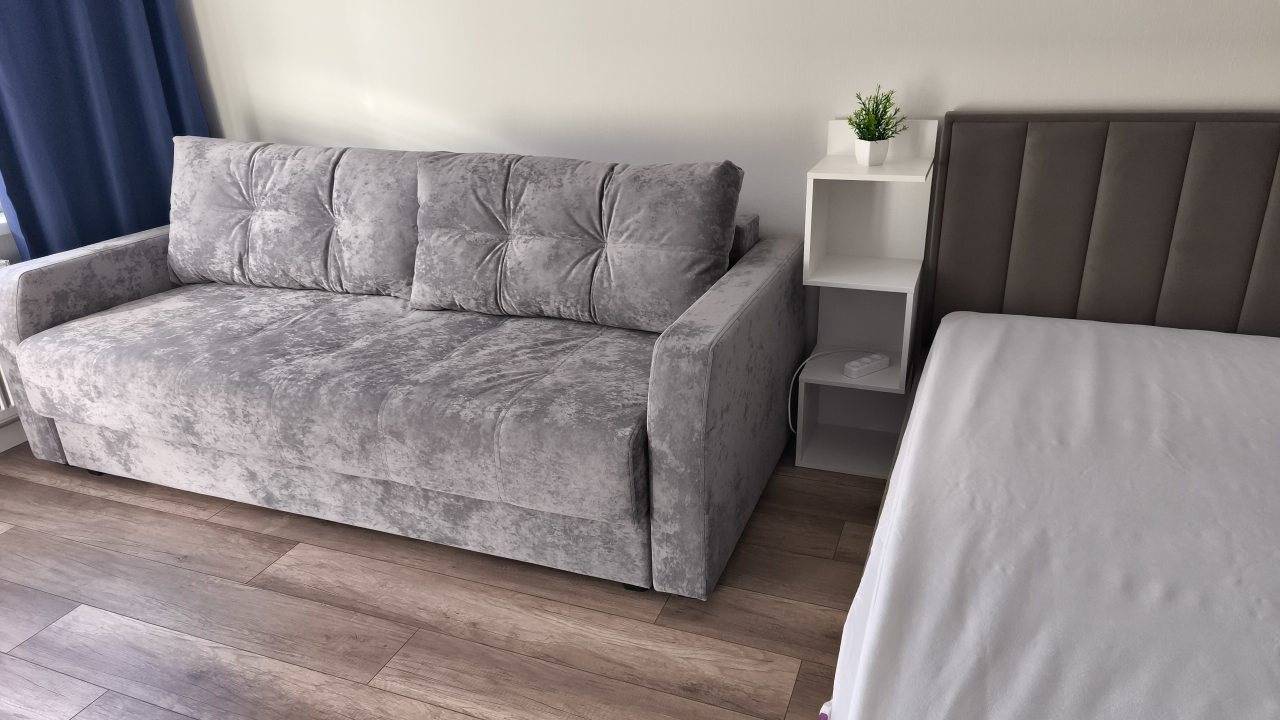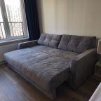 Внутри все предусмотрено для комфортного проживания, включая двуспальную кровать с удобным матрасом, мягкий диван с телевизором, кондиционер, шкаф-купе с зеркалом в полный рост, просторный балкон, а также ванную комнату с набором полотенец и стиральной машиной.