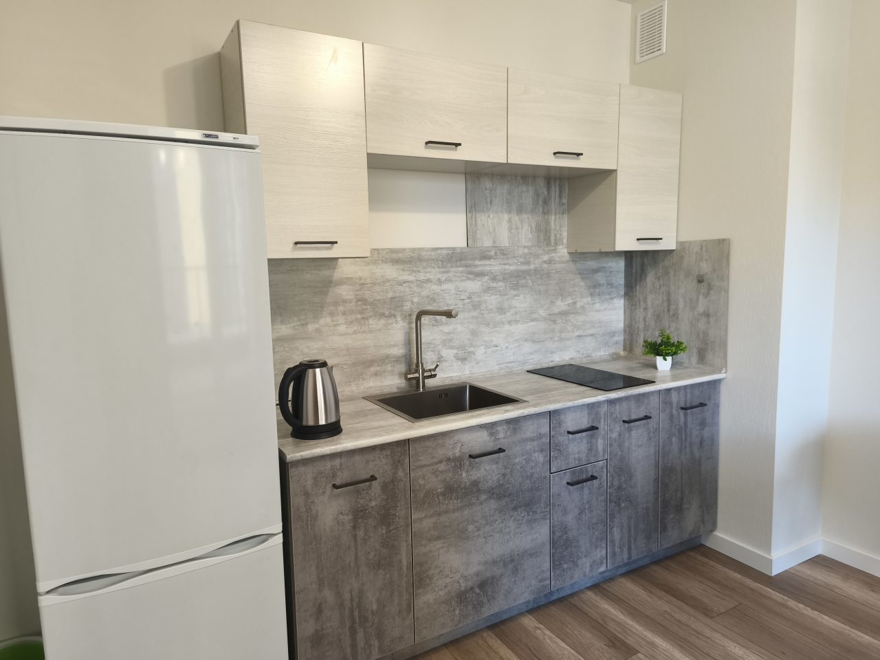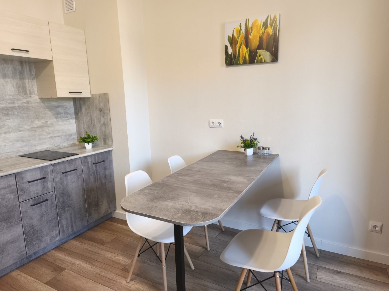 Кухонная зона оснащена варочной панелью, чайником, холодильником, обеденным столом со стульями, чтобы вы могли в любой момент насладиться домашними блюдами.