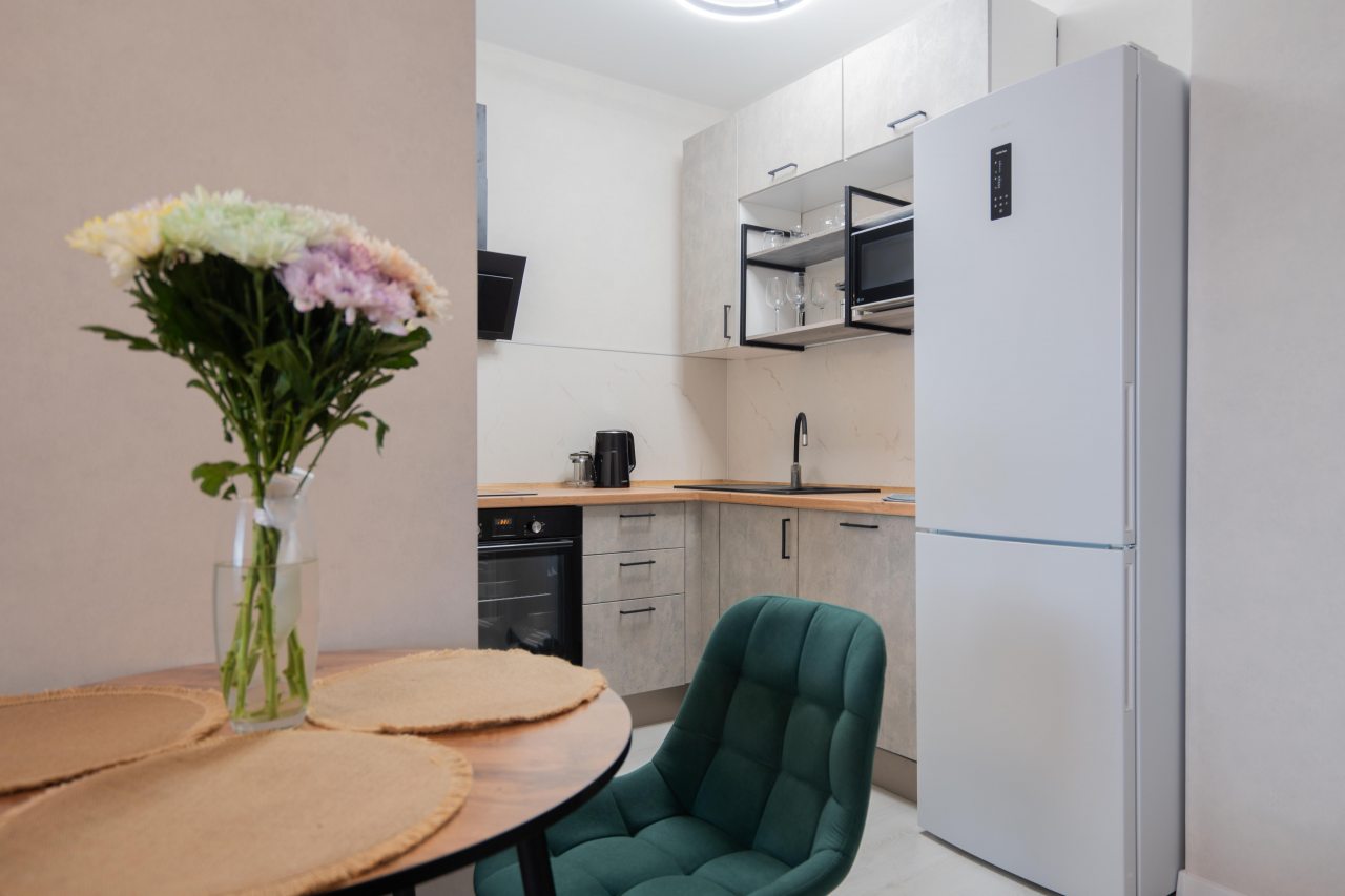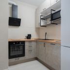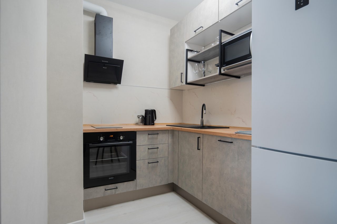 Для приготовления напитков и блюд есть всё необходимое, включая варочную панель, чайник, духовой шкаф, вытяжку, микроволновую печь и уютную обеденную зону.