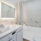 Для качественного отдыха и комфортного проживания имеются: двуспальная кровать с телевизором, удобный диван, кондиционер, разноплановые источники освещения, шкаф с зеркалом, полноценная ванна, а также красивый вид из окна.