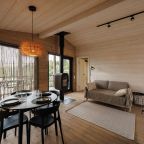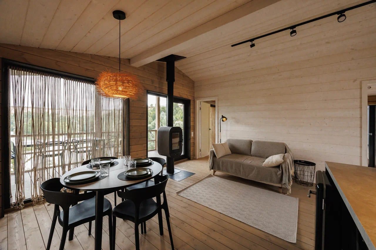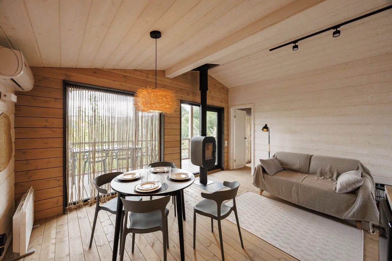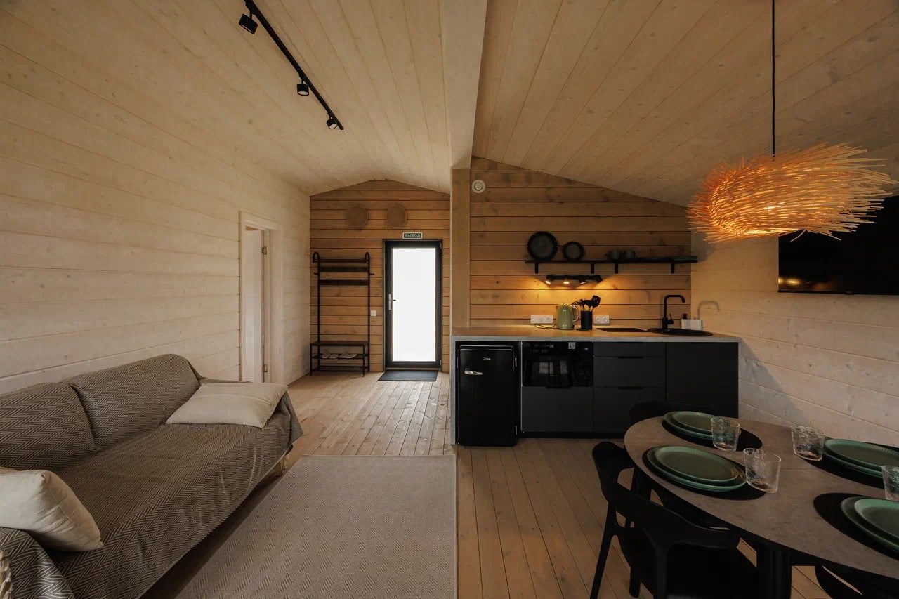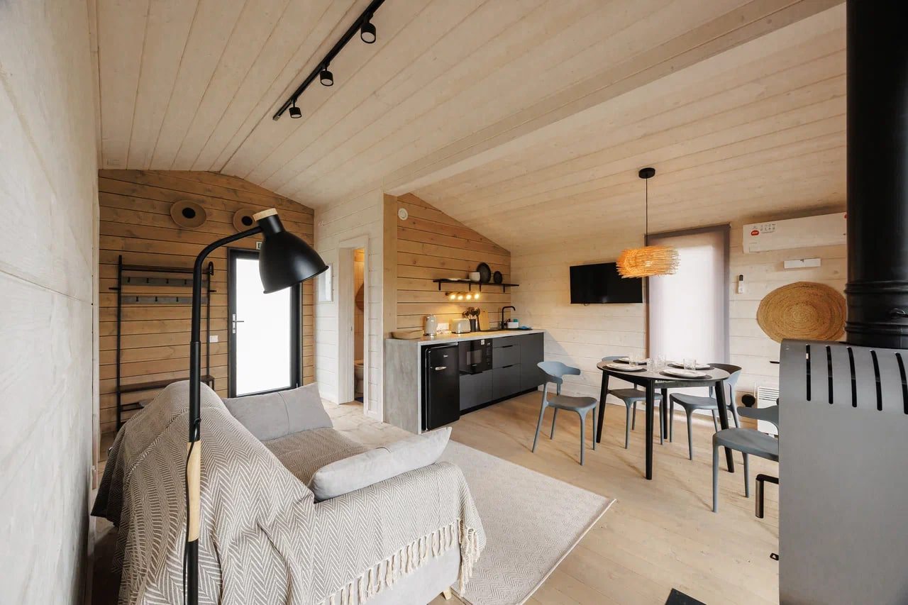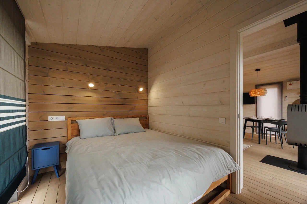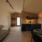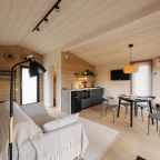 Для проживания предлагаются уютные модульные дома с террасой и видом на озеро. Интерьер выполнен в светлых оттенках и с теплыми деревянными акцентами. Каждый дом оснащен удобной мебелью и техникой для отдыха: кровать с комплектом светлого постельного белья, мягкий диван, обеденная зона, телевизор, кондиционер, камин.