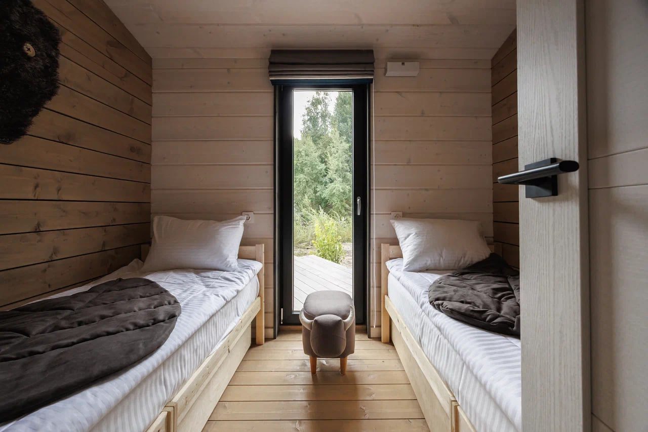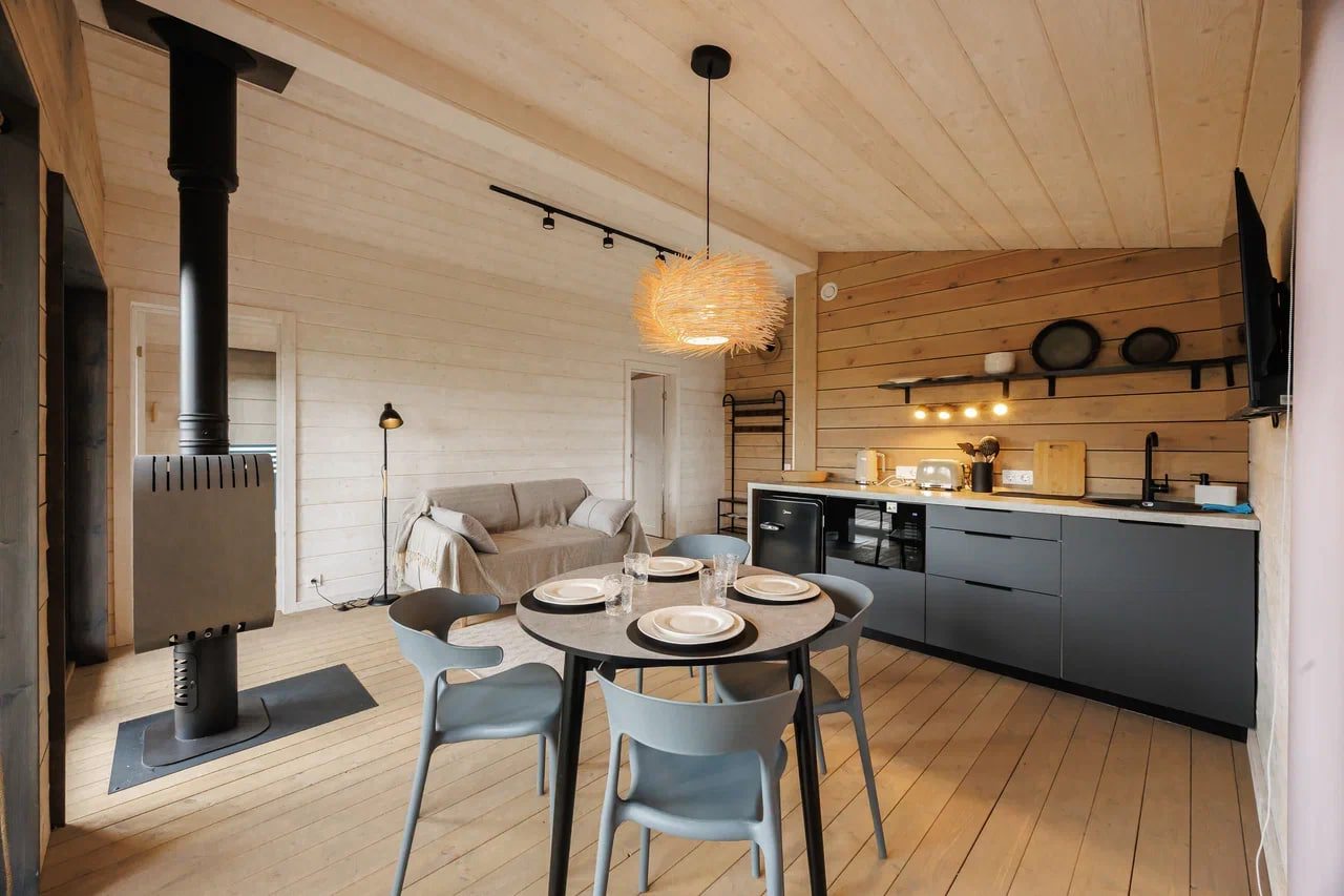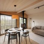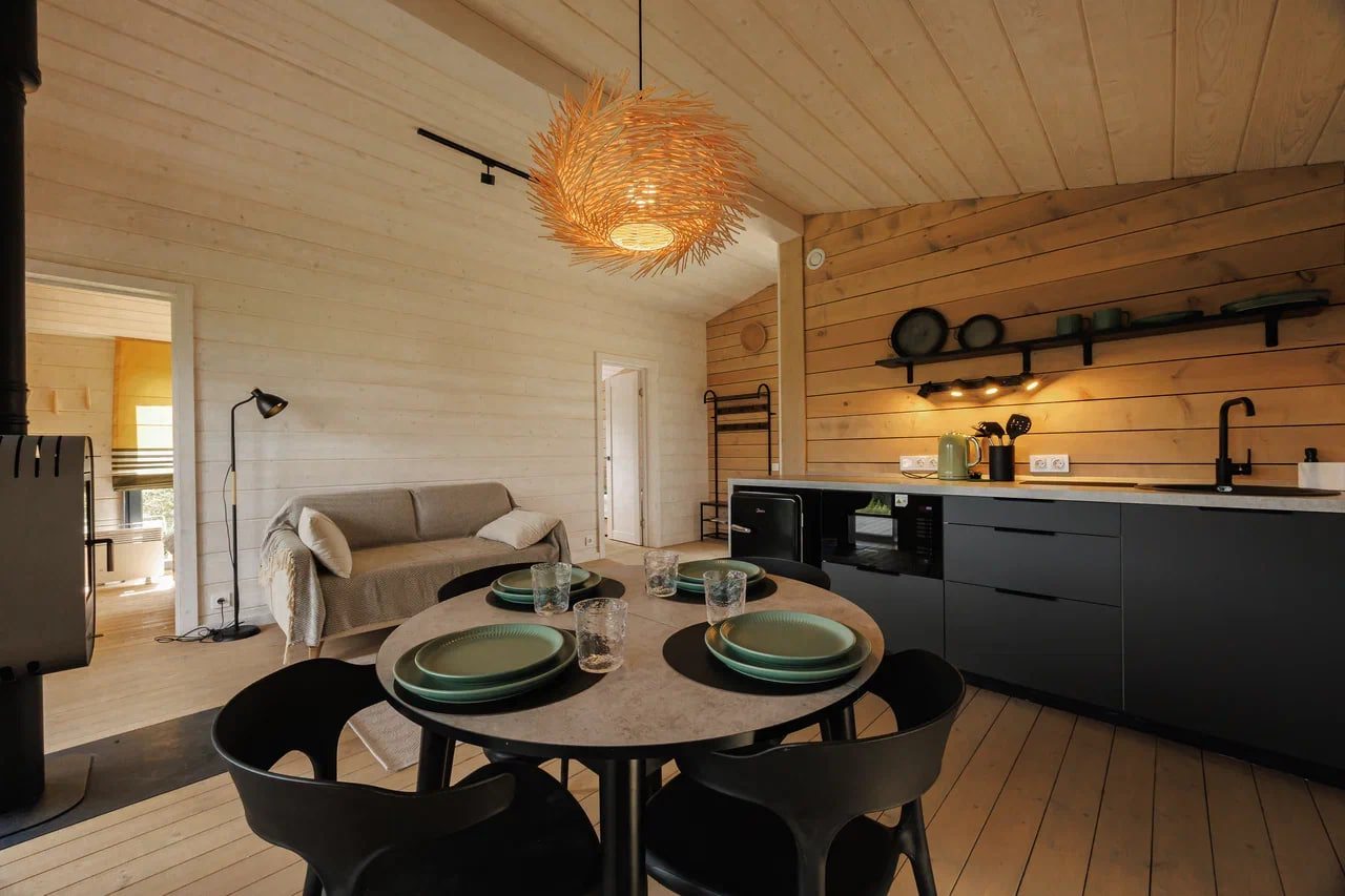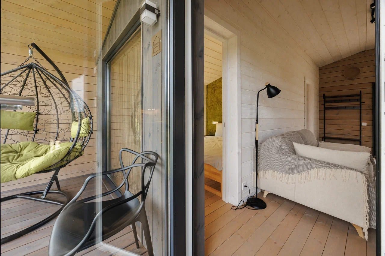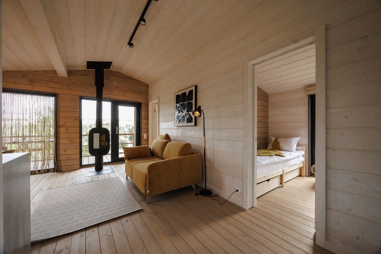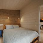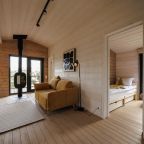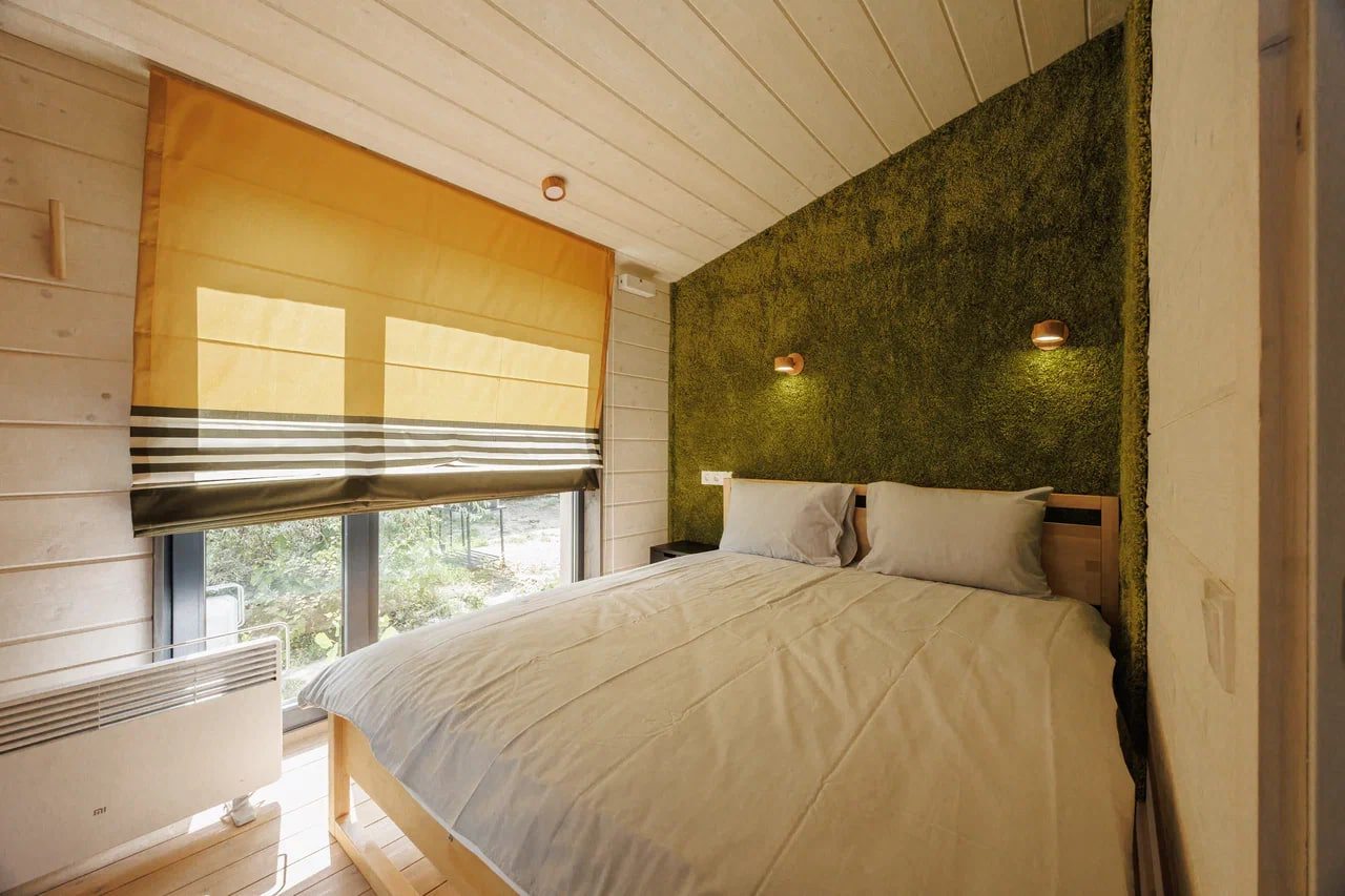 Для проживания предлагаются уютные модульные дома с террасой и видом на озеро. Интерьер выполнен в светлых оттенках и с теплыми деревянными акцентами. Каждый дом оснащен удобной мебелью и техникой для отдыха: кровать с комплектом светлого постельного белья, мягкий диван, обеденная зона, телевизор, кондиционер, камин.