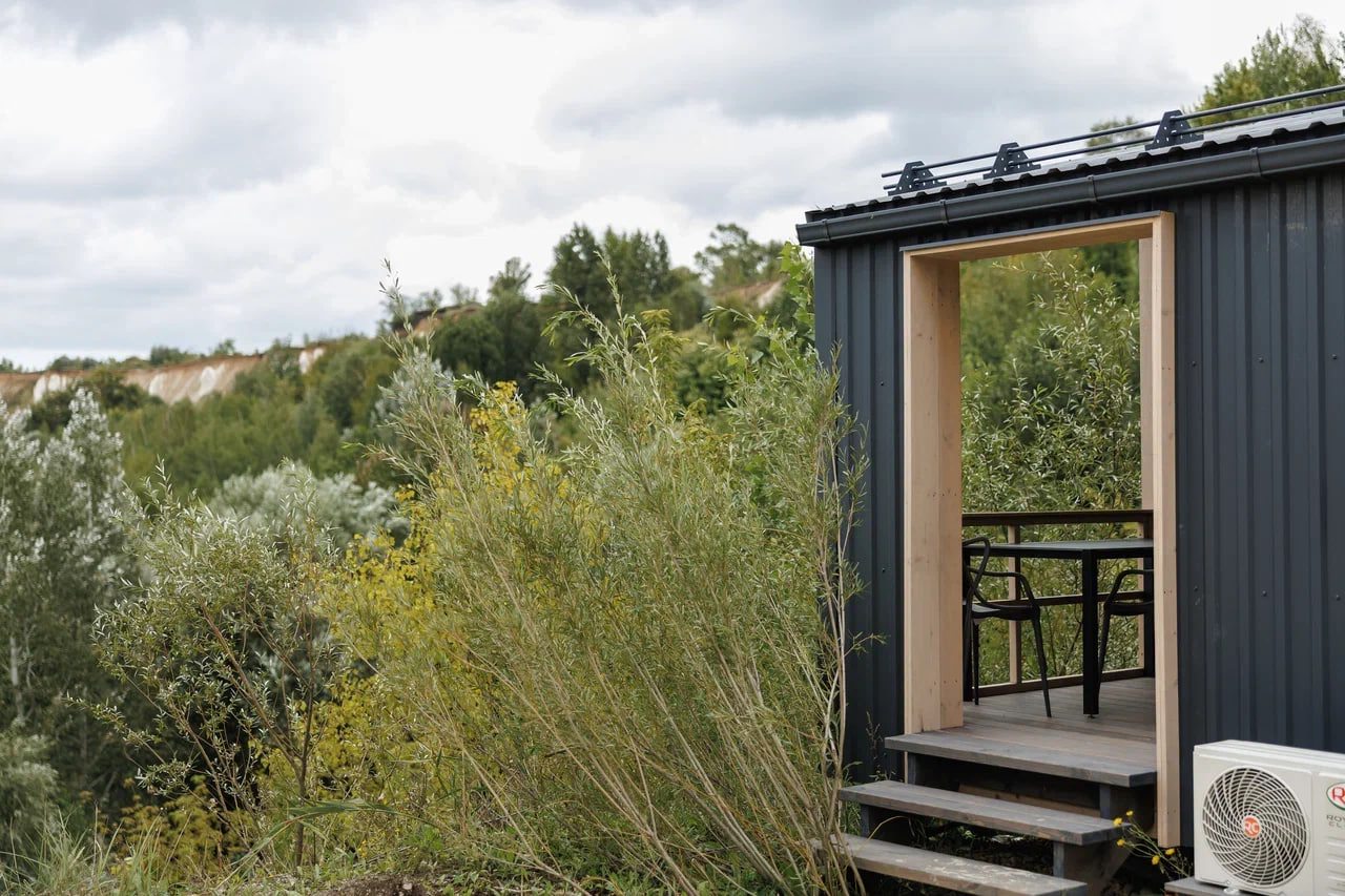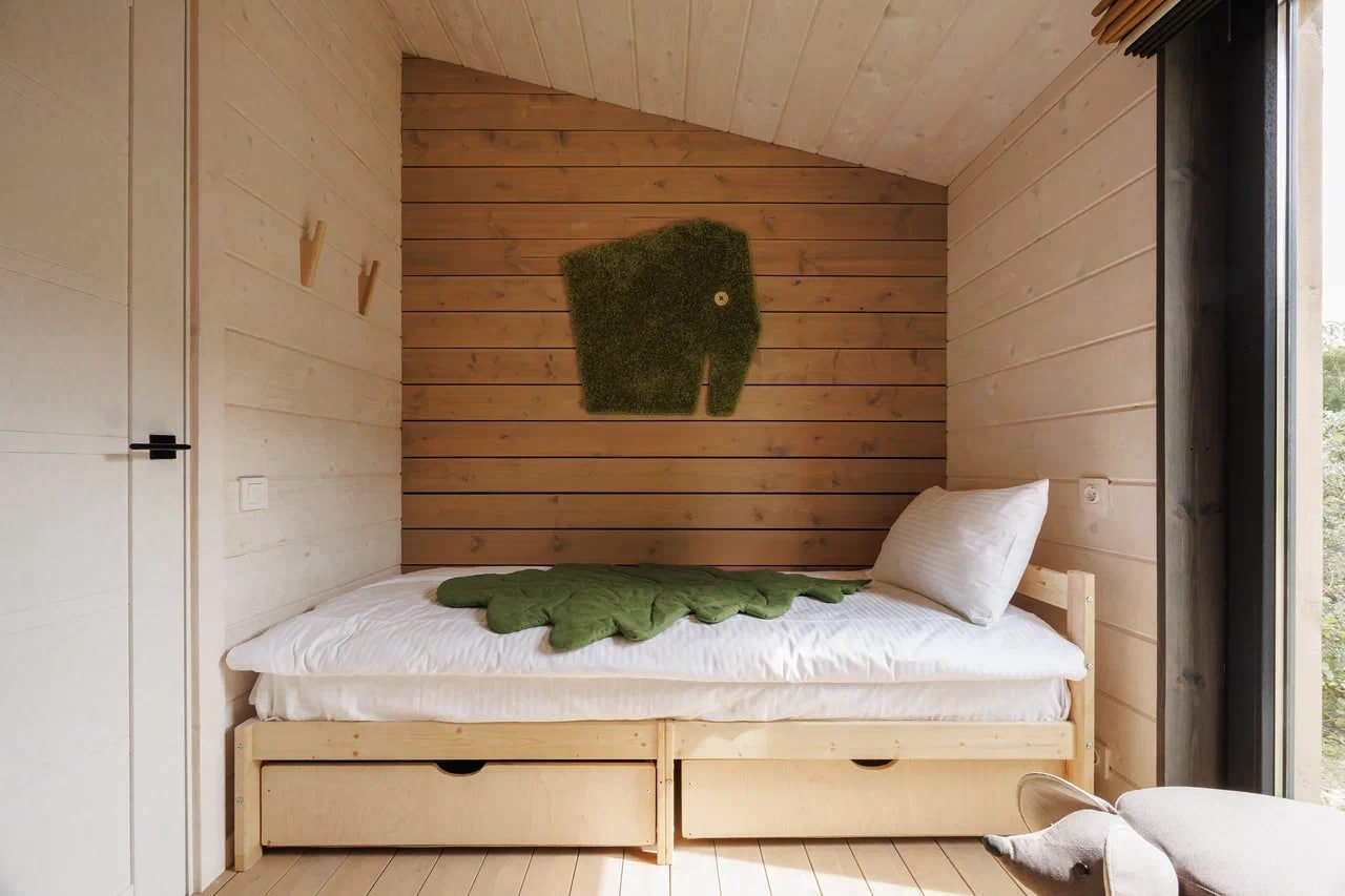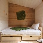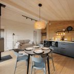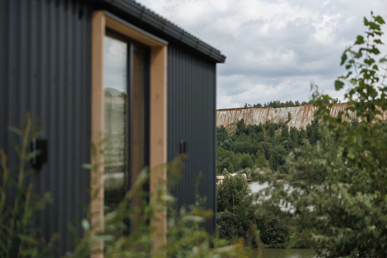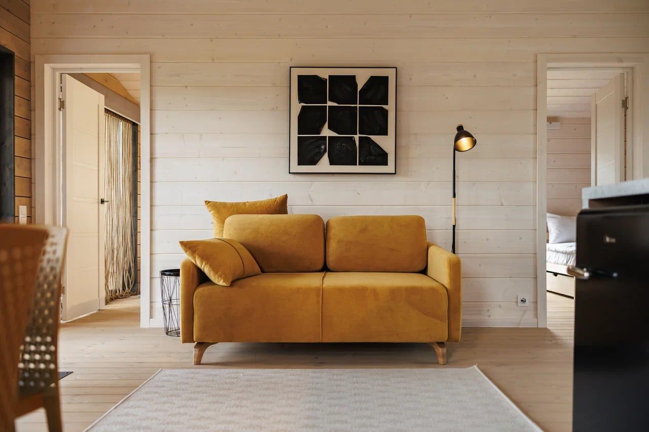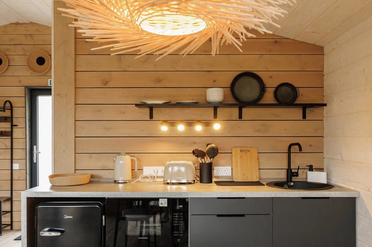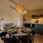 Для проживания предлагаются уютные модульные дома с террасой и видом на озеро. Интерьер выполнен в светлых оттенках и с теплыми деревянными акцентами. Каждый дом оснащен удобной мебелью и техникой для отдыха: кровать с комплектом светлого постельного белья, мягкий диван, обеденная зона, телевизор, кондиционер, камин.