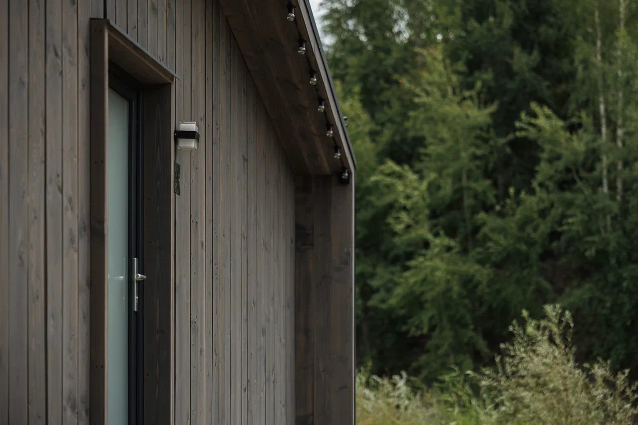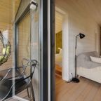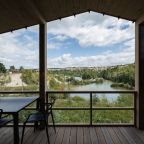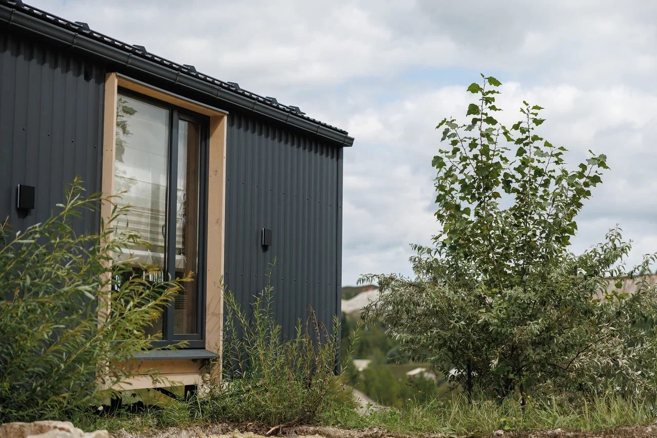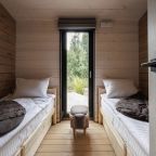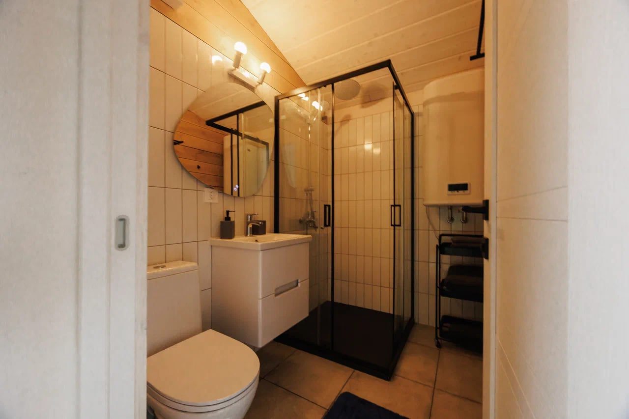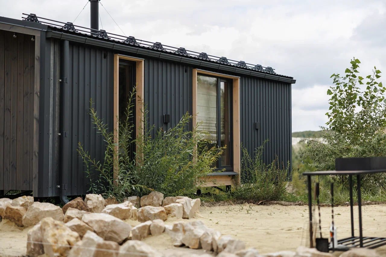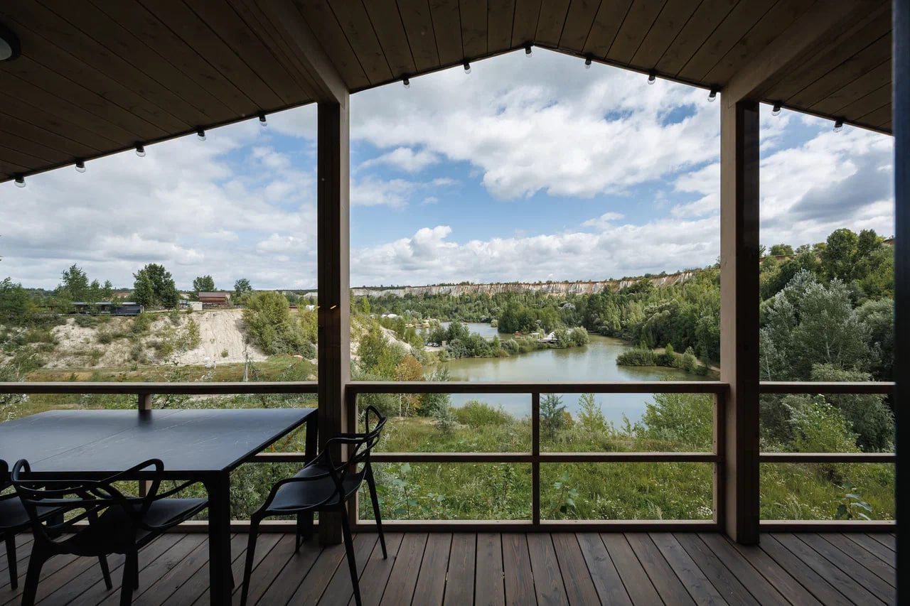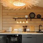 Для проживания предлагаются уютные модульные дома с террасой и видом на озеро. Интерьер выполнен в светлых оттенках и с теплыми деревянными акцентами. Каждый дом оснащен удобной мебелью и техникой для отдыха: кровать с комплектом светлого постельного белья, мягкий диван, обеденная зона, телевизор, кондиционер, камин.