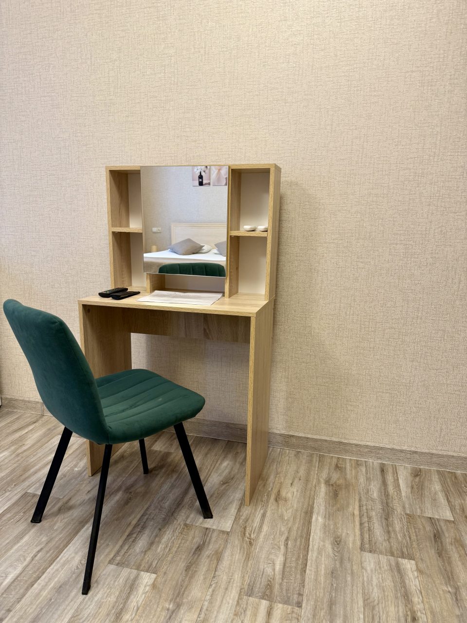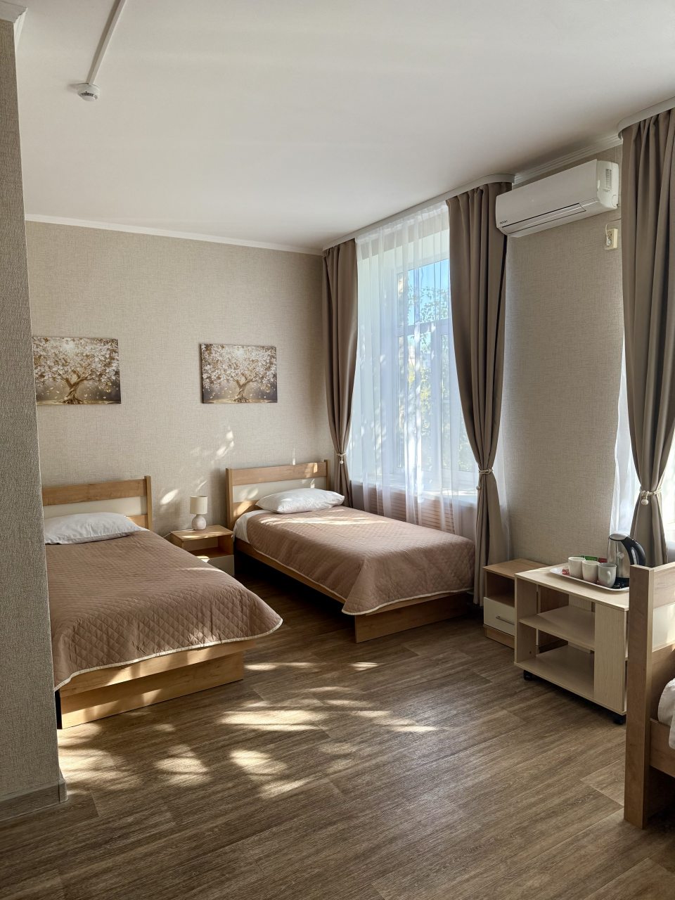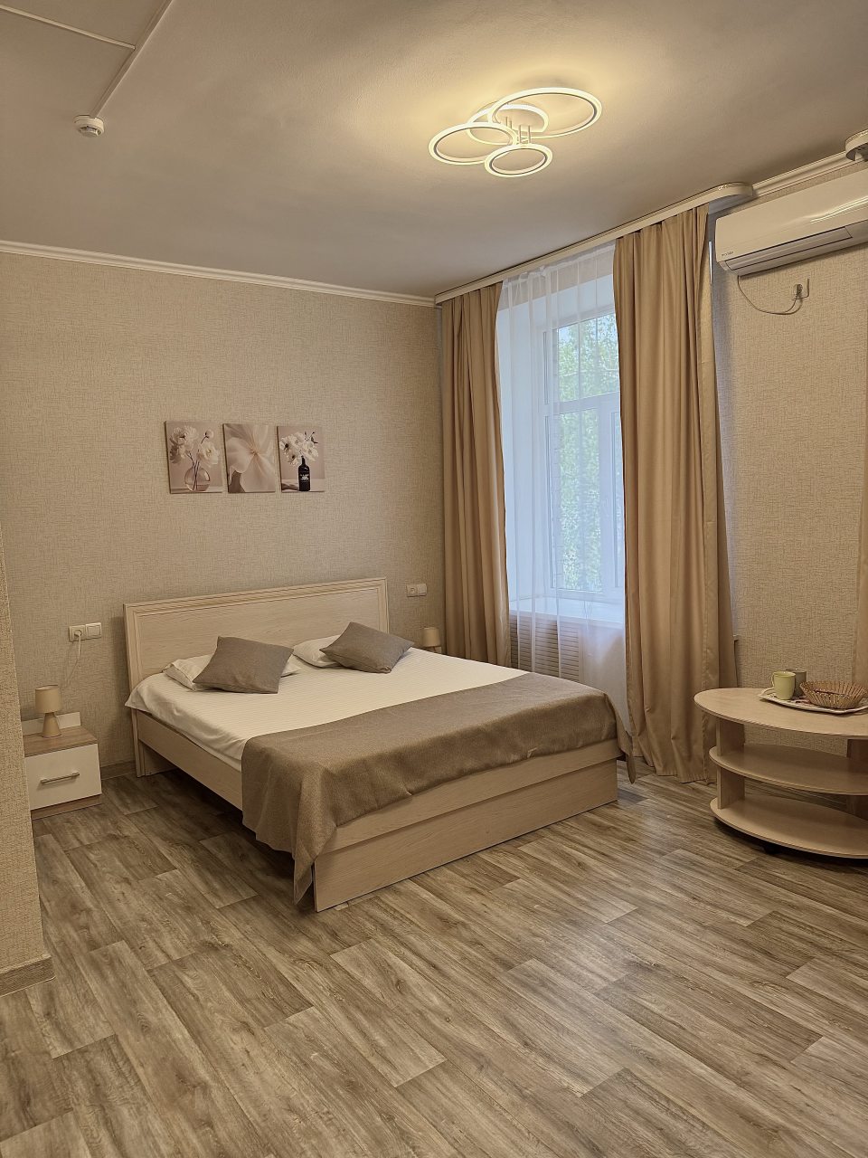 В номере просторно, проветрено, на полу ковровое покрытие, приятно ходить. Большой шкаф, туалетный столик со стулом, урна, холодильник и большая кровать. В номере достаточно уютно за счет картин и торшевов возде кровати. Подотенца чистые, приятно пахнут. Огромная душевая кабина, что не может не радовать. Минимальное есть : 2 стакана, чайник. Брали завтрак, в принципе неплохо. Маленькие, но вкусные порции.