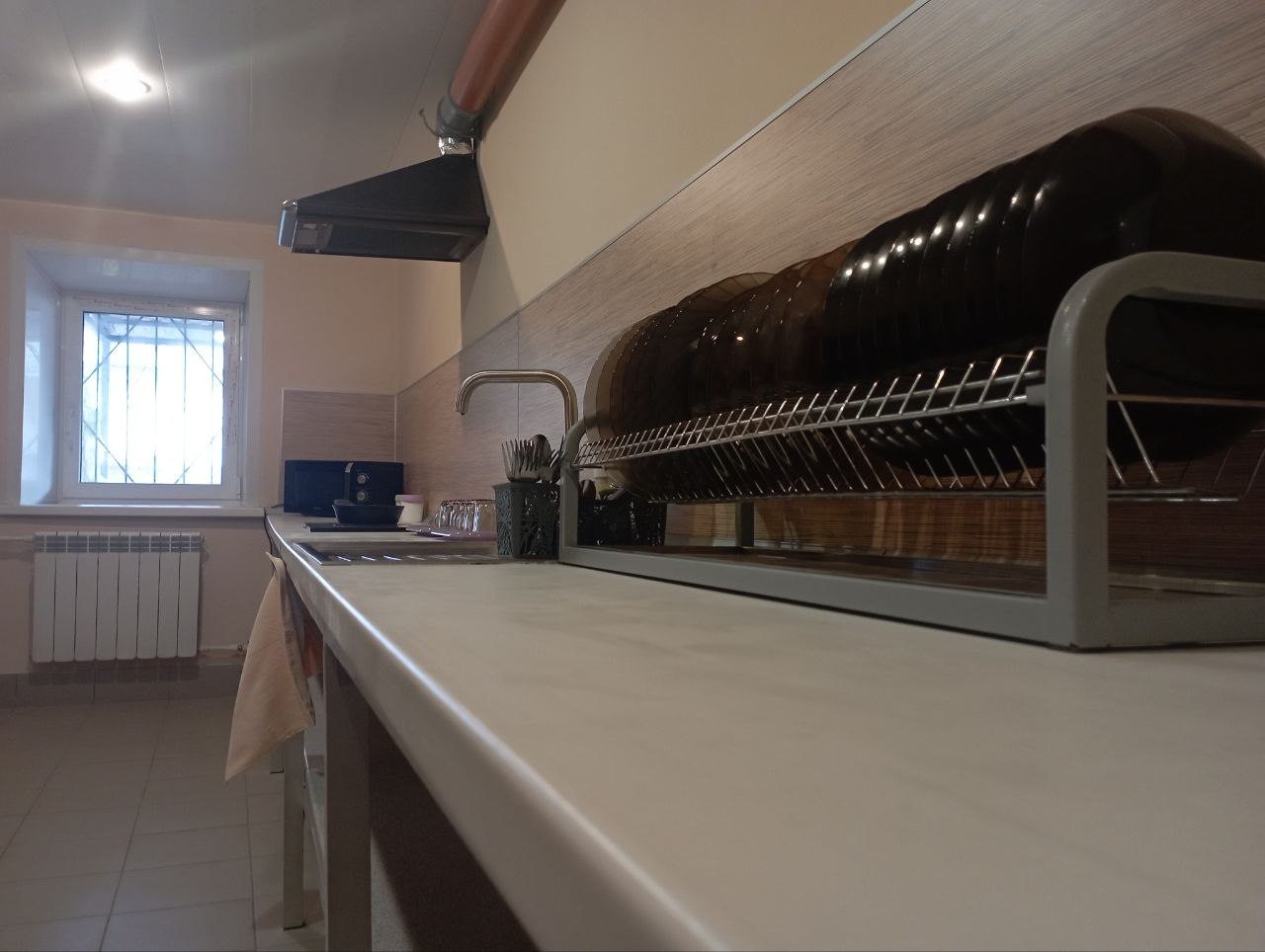 На общей кухне установлена микроволновая печь, плита, посуда и обеденные столы. Гости могут приготовить или разогреть еду, выпить чай. Недалеко работают кафе и магазины.