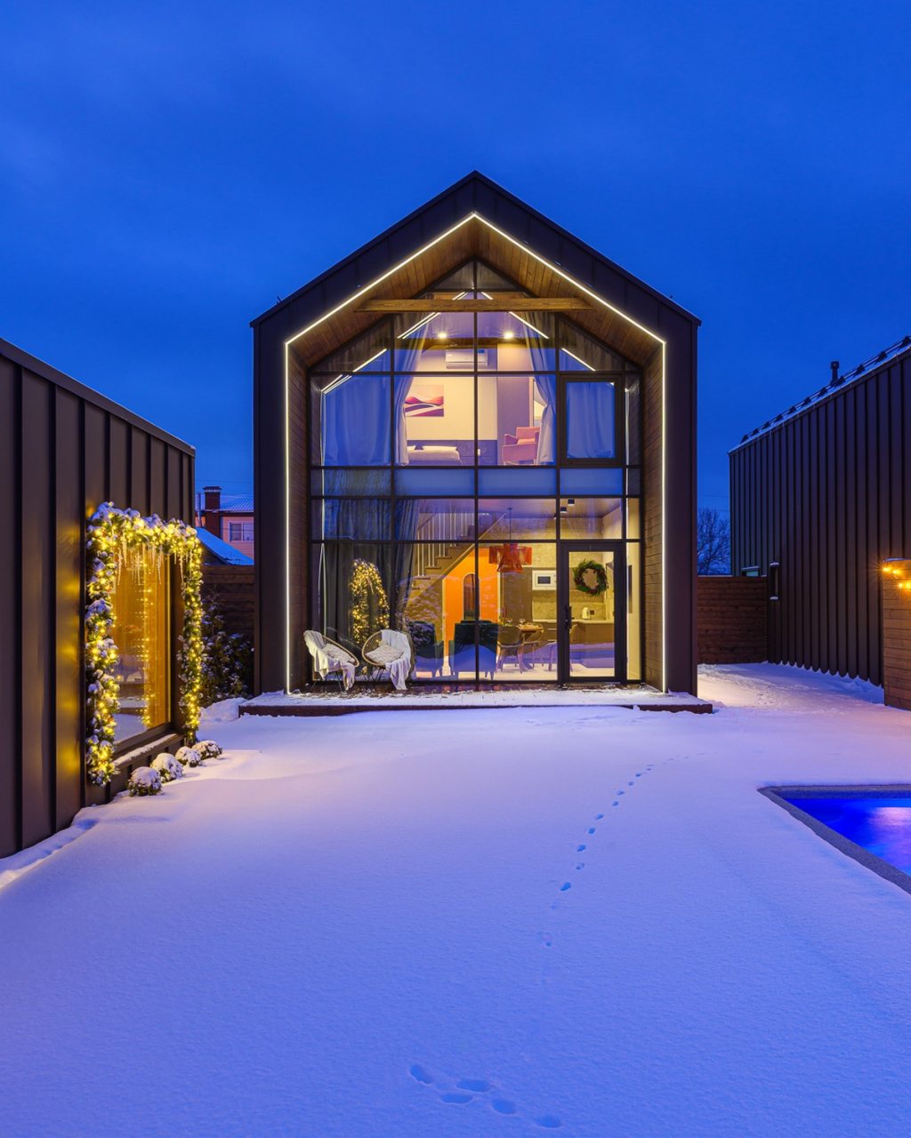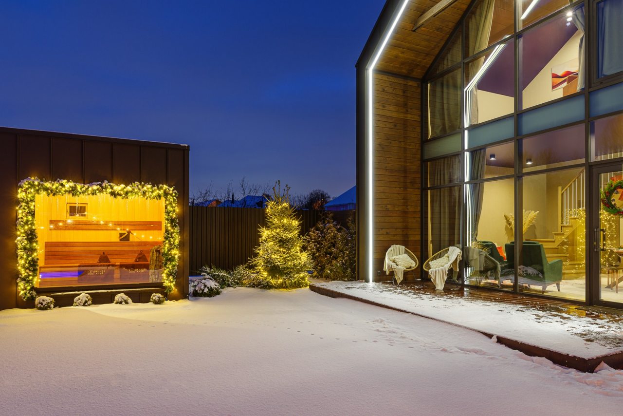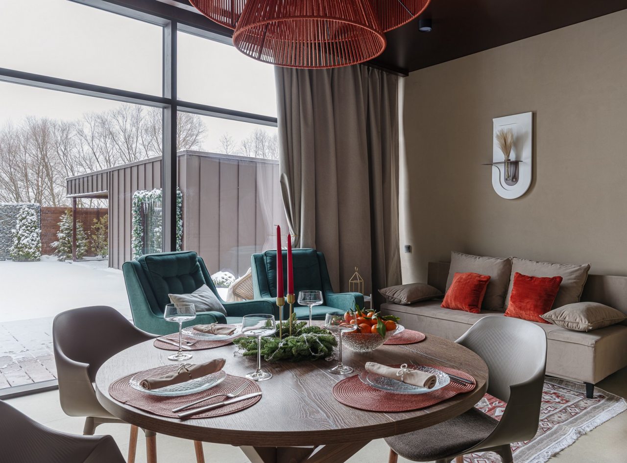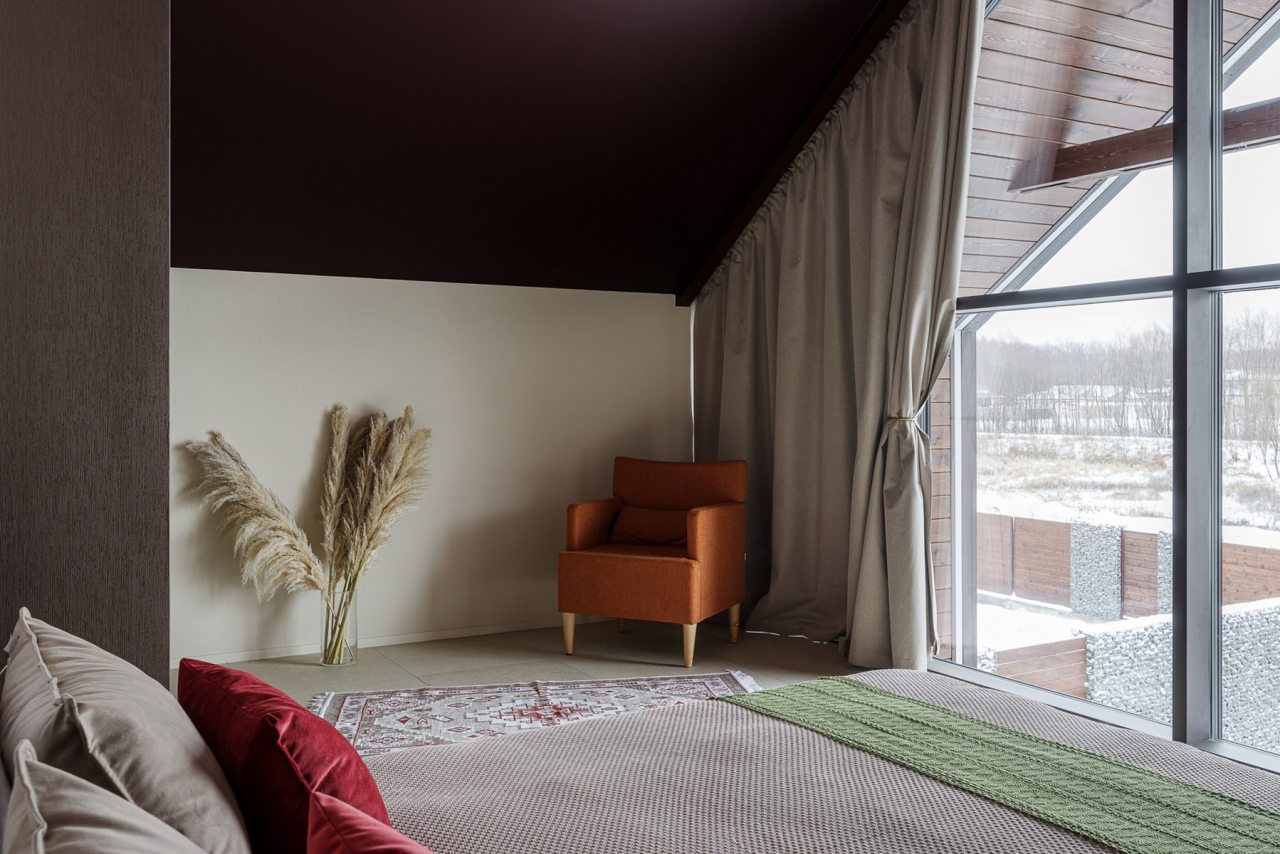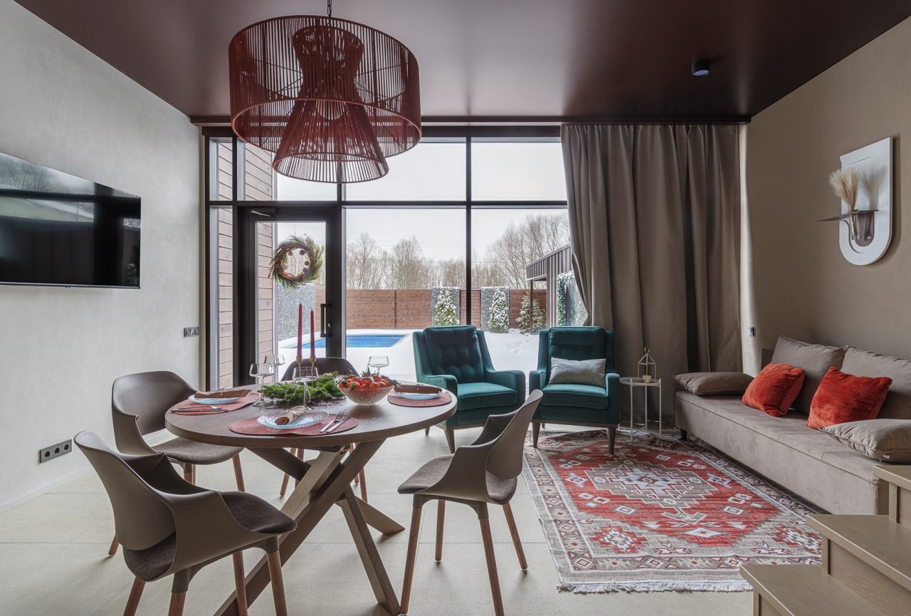 Для проживания и отдыха предоставляется современный барнхаус с вместимостью до 6 человек. Пространство разделено на несколько зон: гостиная с телевизором, обеденной зоной и удобным диваном, спальни и ванная комната. Благодаря панорамным окнам вы можете наслаждаться потрясающими видами прямо из комнаты.