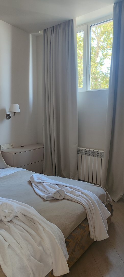 Отель находится в очень удачном месте! Расположение хорошо тем, что рядом находится много мест где можно покушать и погулять... в шаговой доступности набережная. Проживали в двухкомнатных апартаментах - очень удачная планировка... много места) всё как мы любим! Евроремонт, всё чисто, есть техника (стиральная машина, телевизор, микроволновка, утюг, гладильная доска), достаточное количество посуды. Про парковочные места нужно предупреждать, чтобы для вас его забронировали! Стоит денег, но так везде)