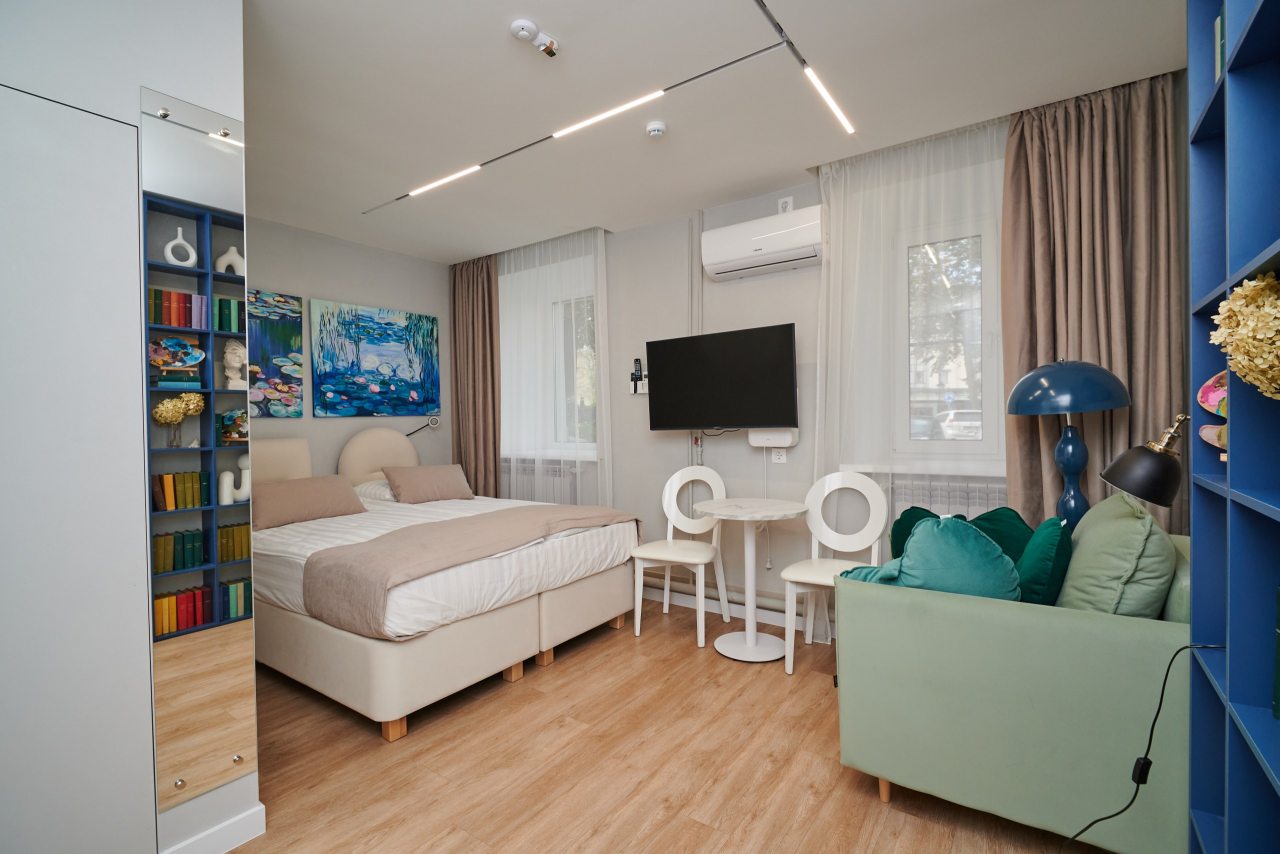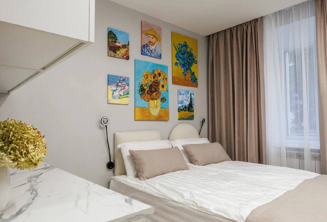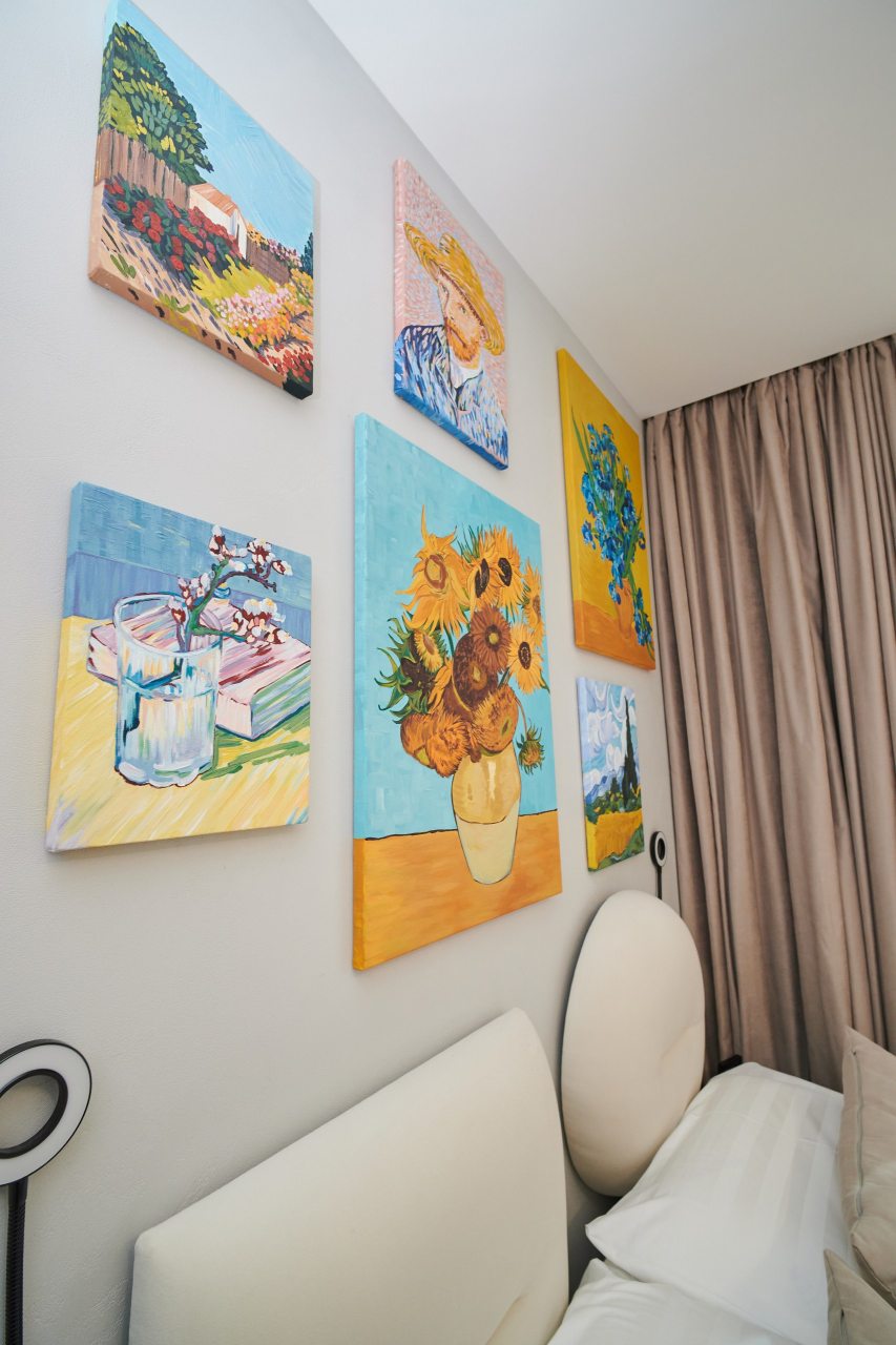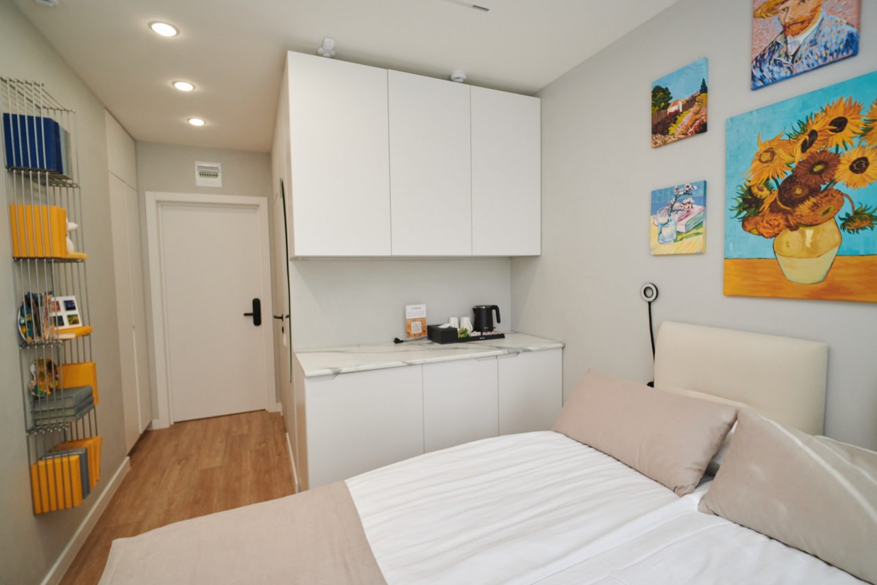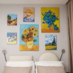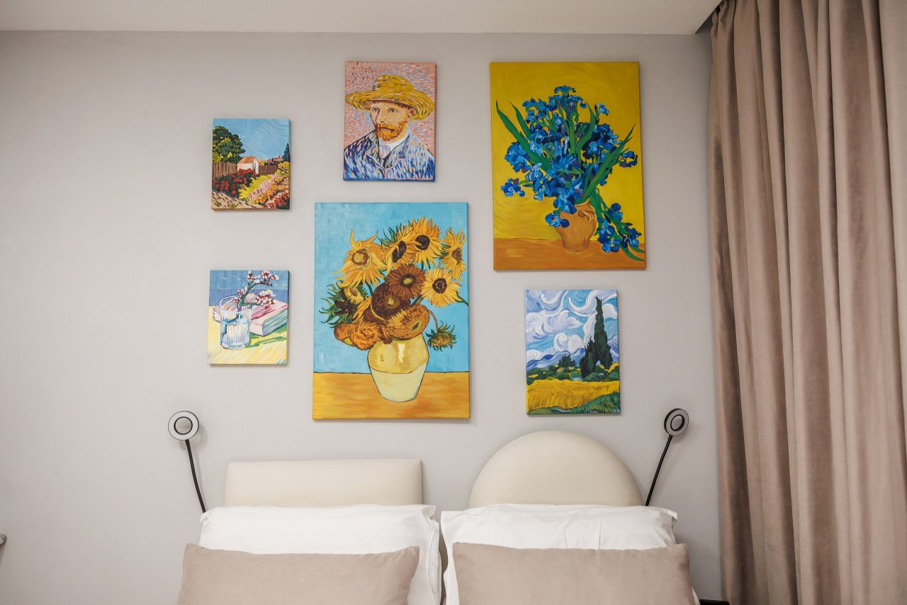 Все номера оснащены качественной мебелью и современной техникой, а интерьер выполнен в дизайнерском стиле. Каждый номер - это своя особенная атмосфера в духе великого художника. К услугам гостей: удобное спальное место, кондиционер, приточный очиститель воздуха, телевизор. В санузле имеется фен, полотенца и все необходимые средства гигиены.