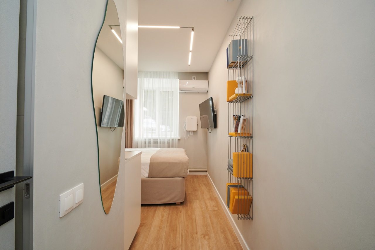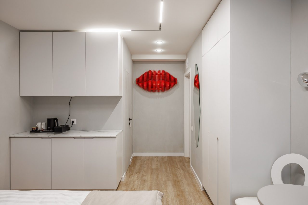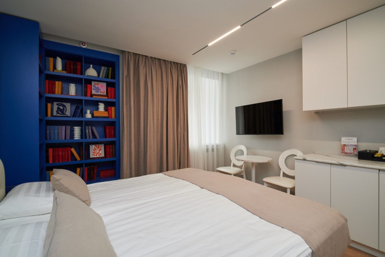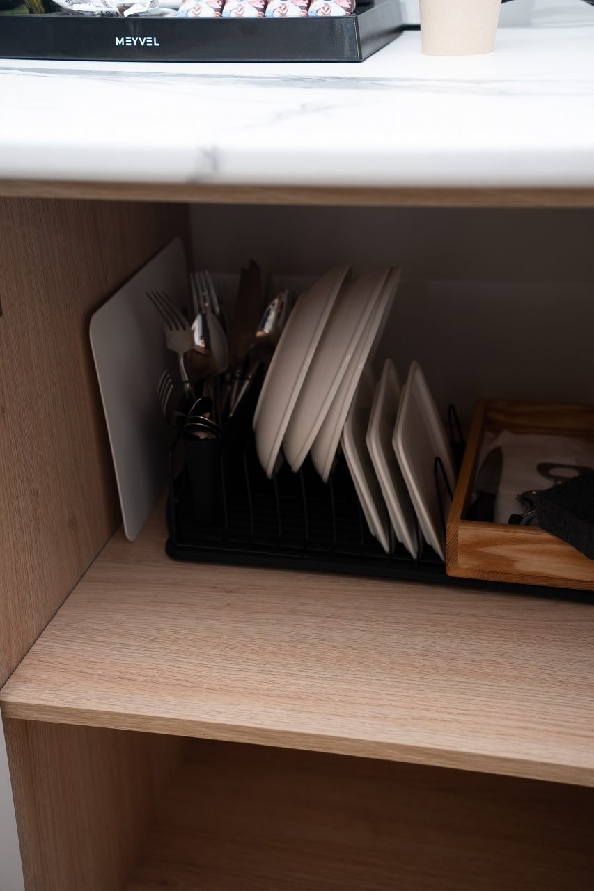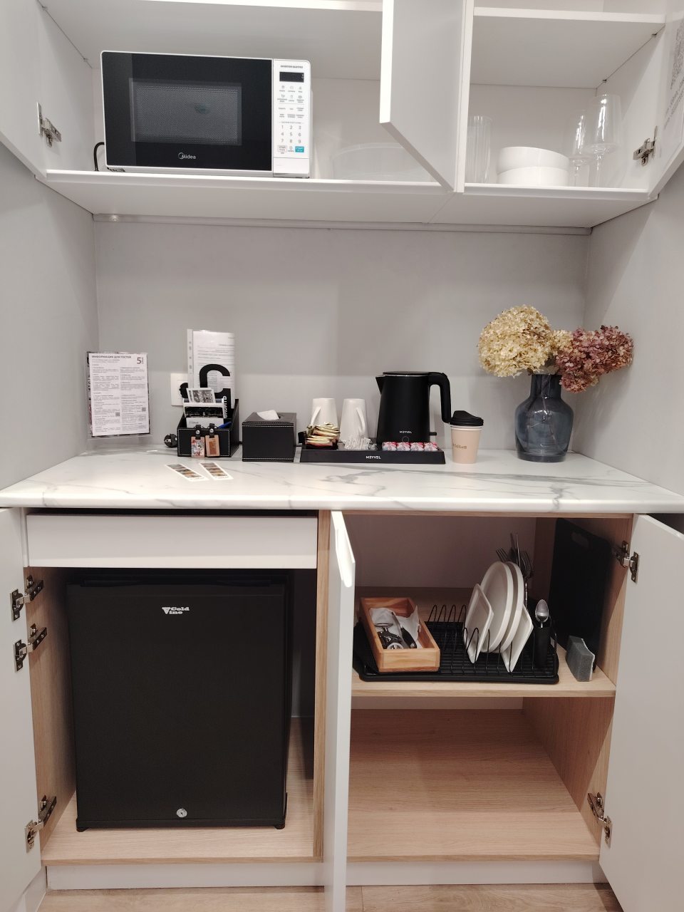 В каждом номере на мини-кухне гостей ждет чайник, микроволновая печь, холодильник, посуда, чай/кофе, конфеты. Все для приятного перекуса между прогулками по городу или деловыми встречами.
