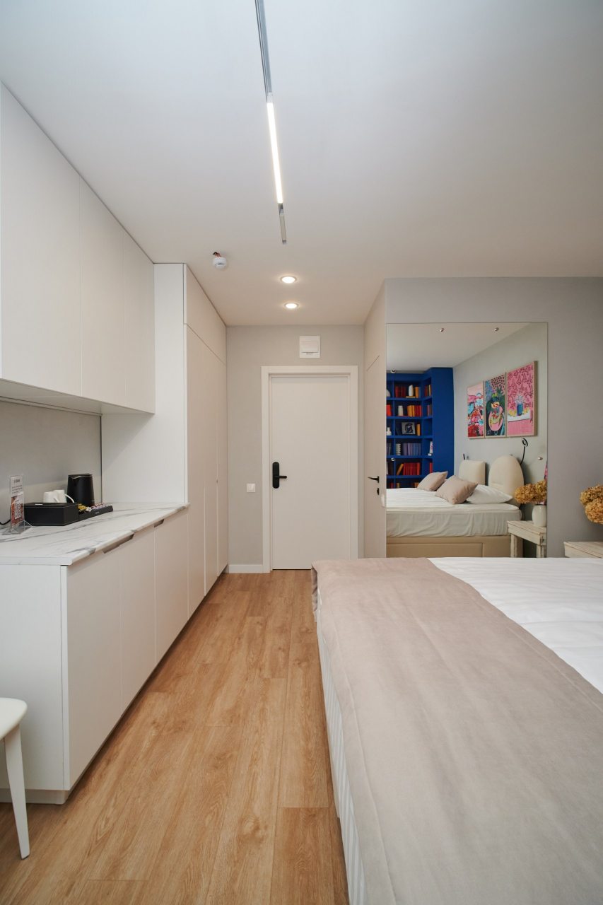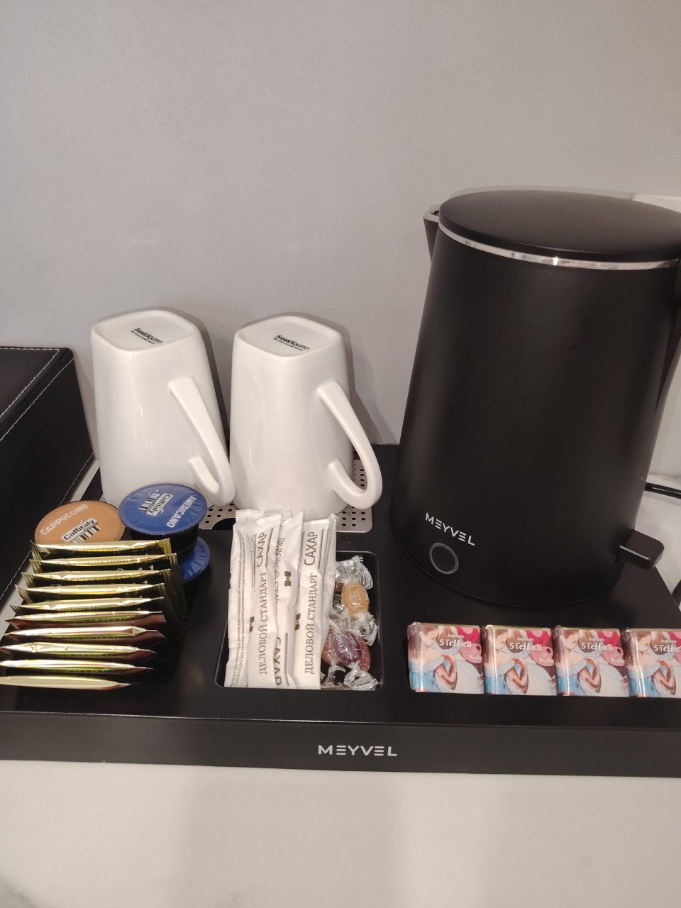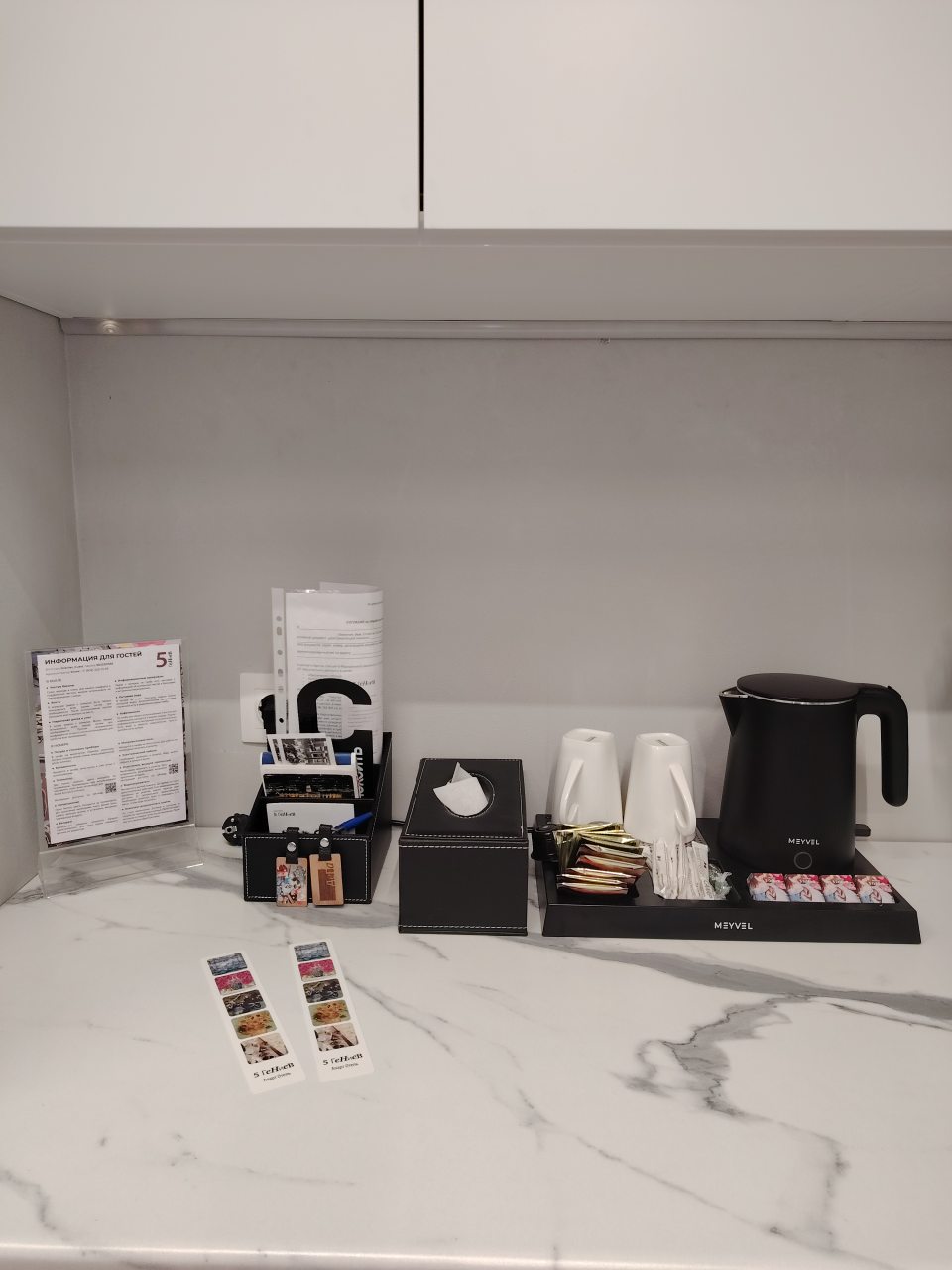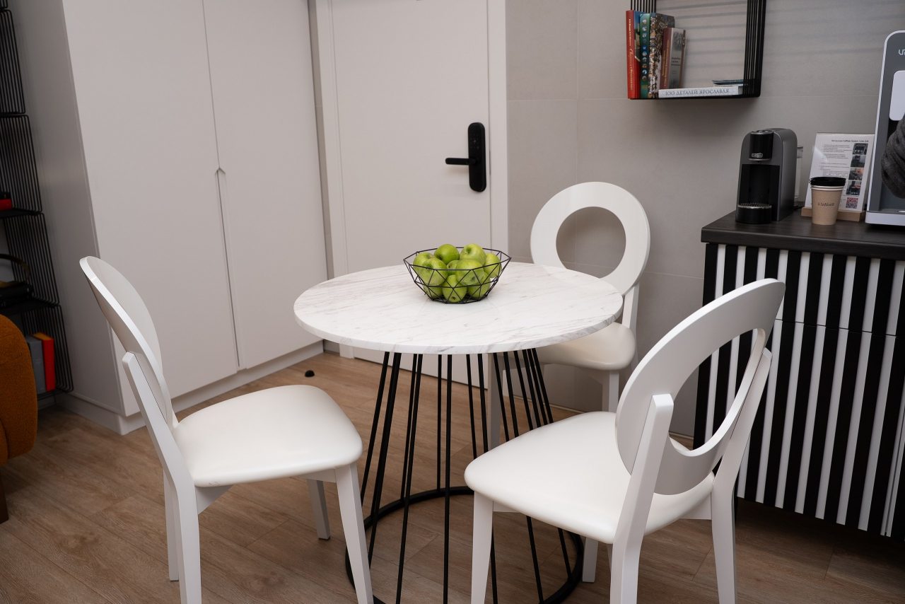 В каждом номере на мини-кухне гостей ждет чайник, микроволновая печь, холодильник, посуда, чай/кофе, конфеты. Все для приятного перекуса между прогулками по городу или деловыми встречами.