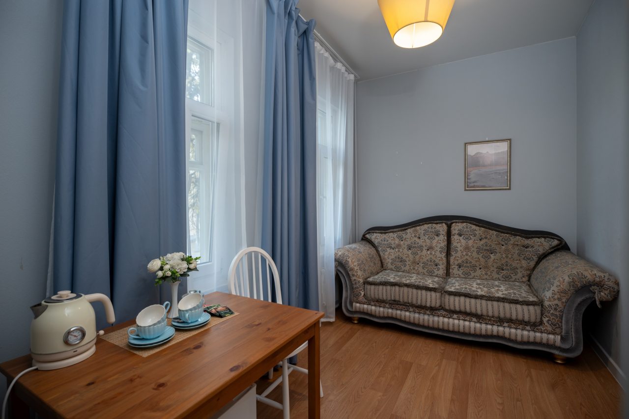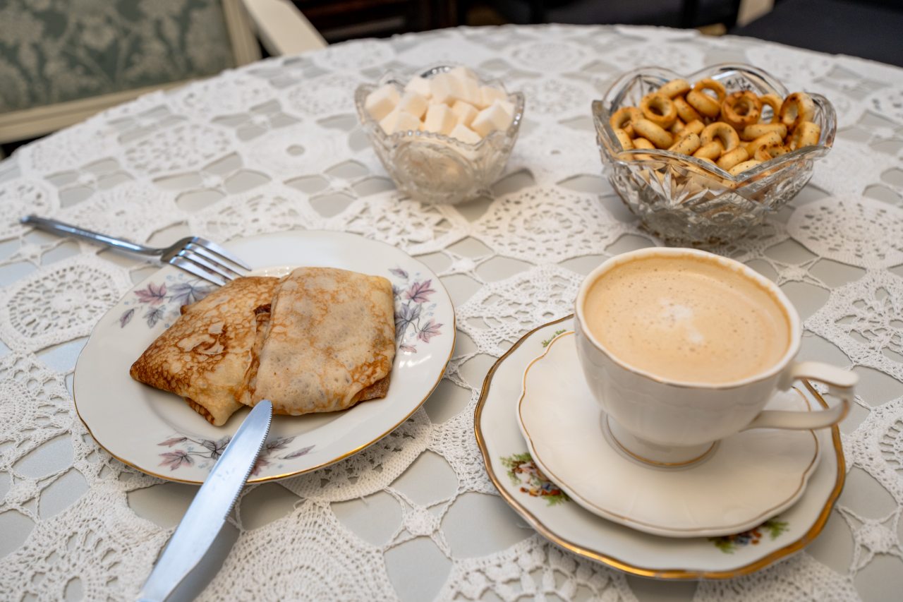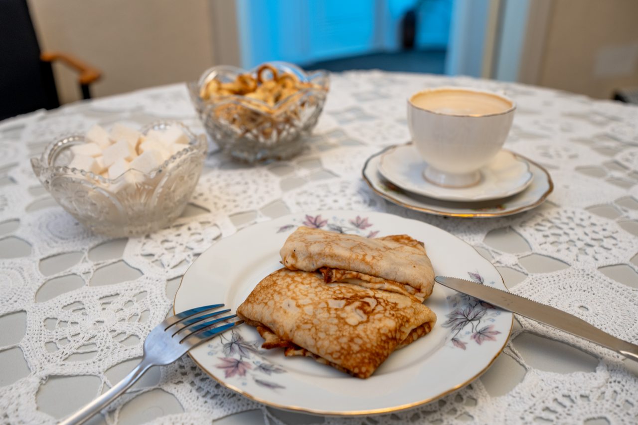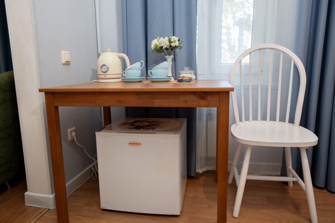 Есть парковка для путешествующих на автомобиле. У нас удобства были вне комнаты, но это неудобство не замечаешь. Очередей никаких не было. Предоставляют гель для душа и шампунь. В номере есть чайник, чай, сахар и печенье. По возможности можно попросить тарелки и приборы для перекуса. Завтрак проходил в гостиной на первом этаже рядом с камином и самоварами, за столом и стульями конца 19 века. На выбор предлагали блинчики с яйцом или яблоками на выбор и сырники. Мы выбрали блинчики с яблоками, было по домашнему вкусно.