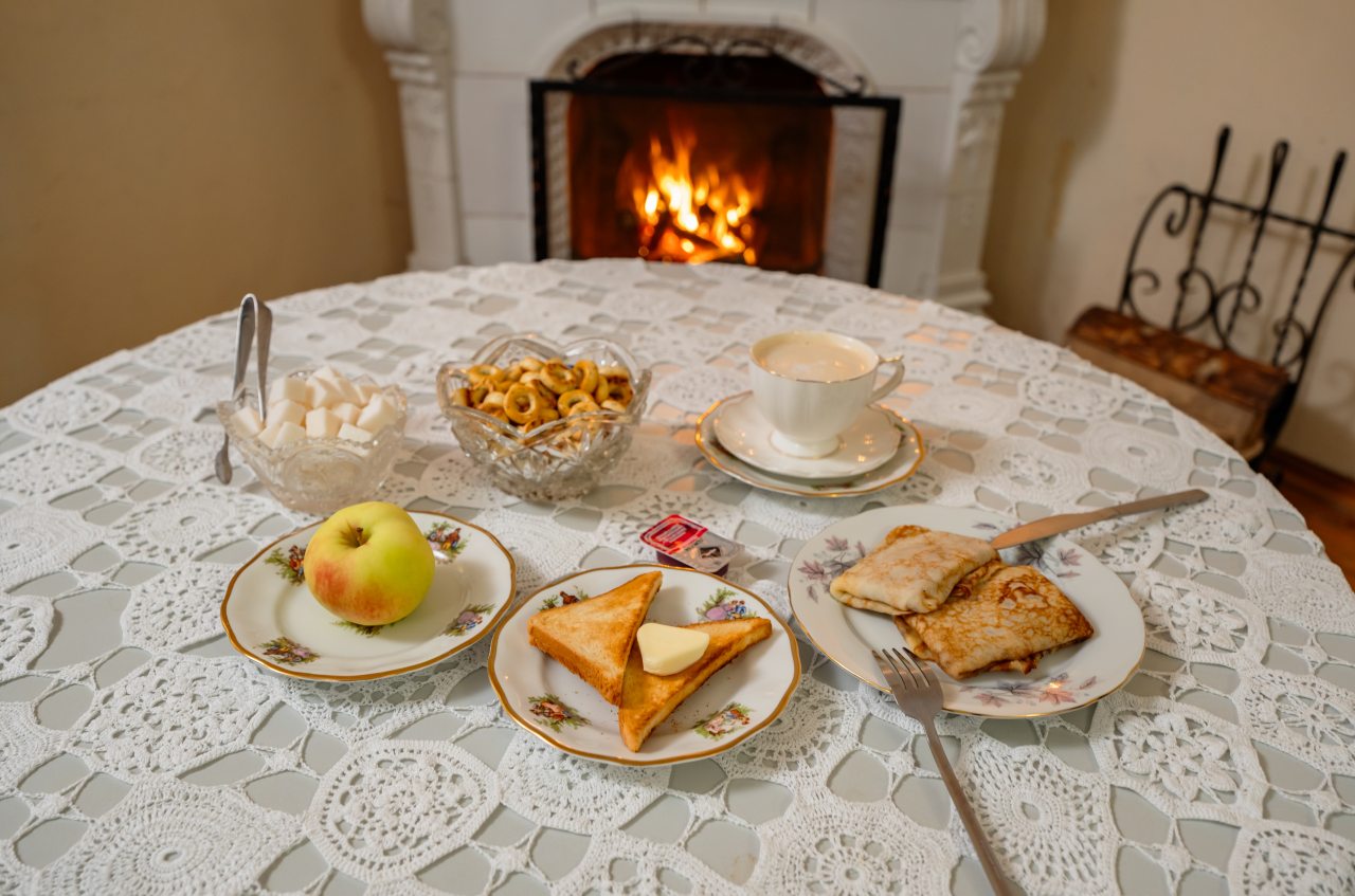 Завтраки накрываются в каминном зале, для вас разжигается настоящий дровяной камин. Распределяем по времени, индивидуально для каждого номера, для создание камерной атмосферы.