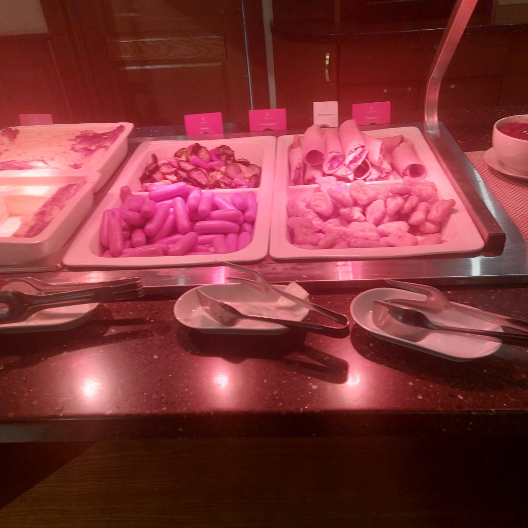 Яркая цветовая гамма выбрана при отделке ресторана. Здесь сервируется завтрак «шведский стол». По меню можно заказать блюда русской, европейской и западной кухни.