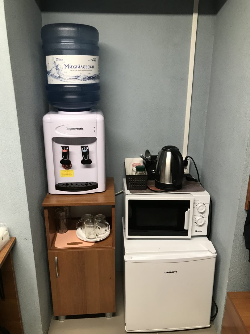 Кухонные зоны оборудованы обеденными столами, техникой для приготовления еды, холодильником, кулером и посудой. Для каждой категории предусмотрен чайный набор с электрочайником.